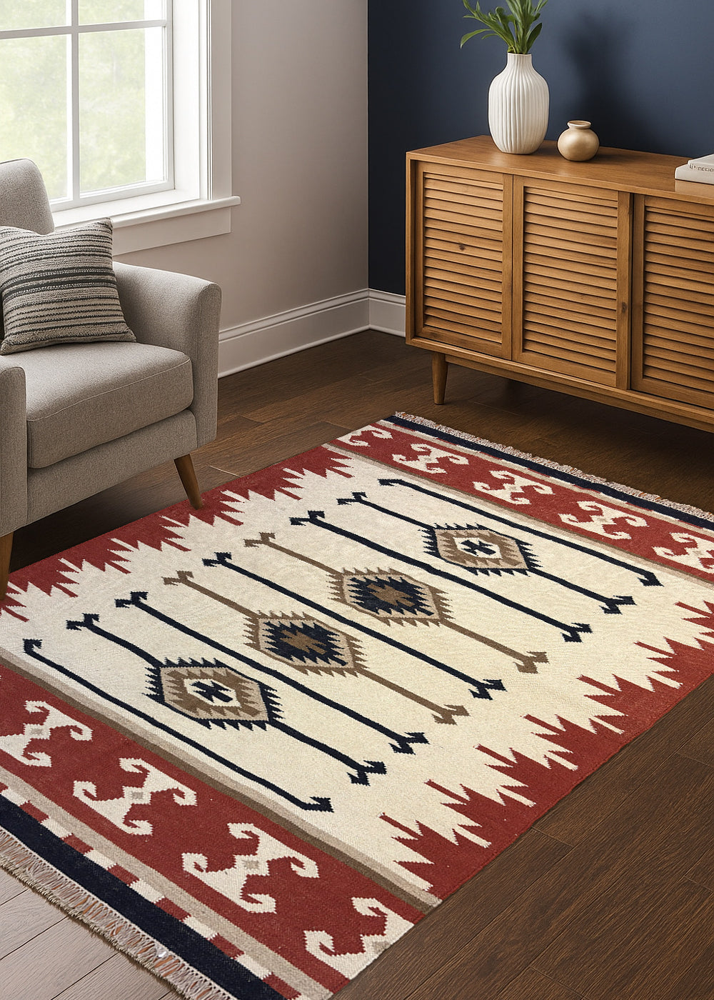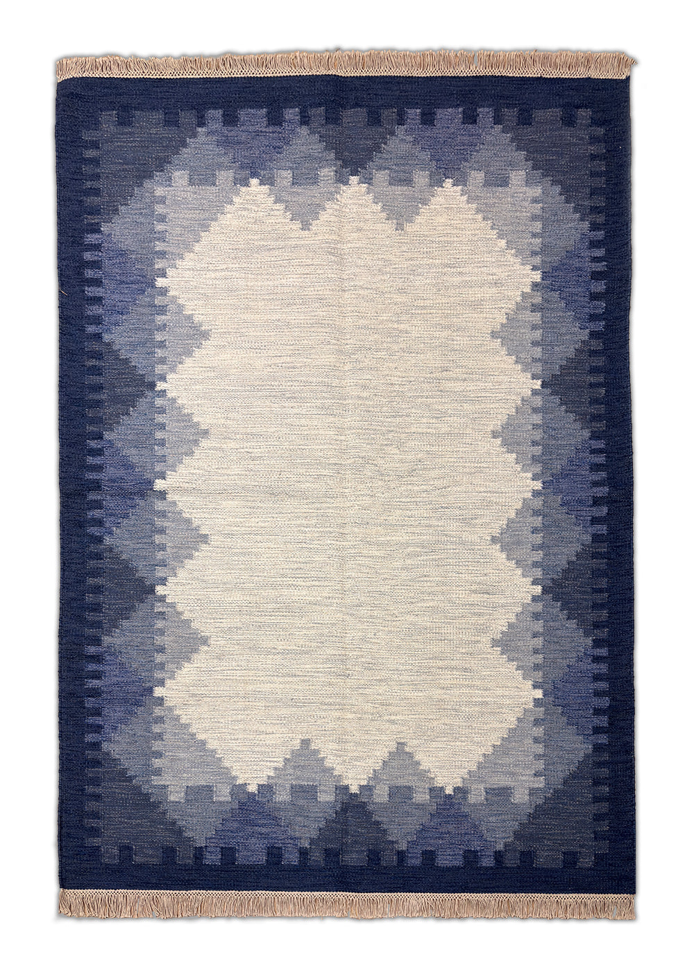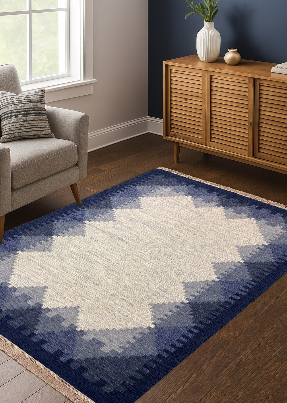 Indra Rekha – Hand Woven Wool Rug in Indigo/Cream
