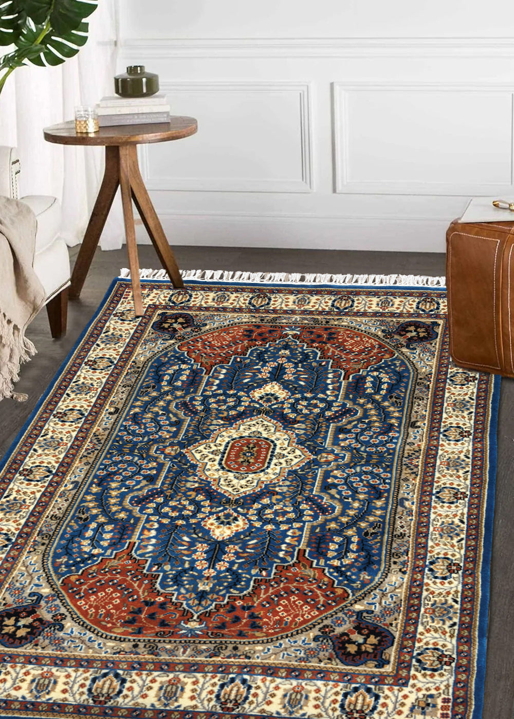 Naureen - Hand Knotted Wool Rug in Cobalt Blue/Rust Red