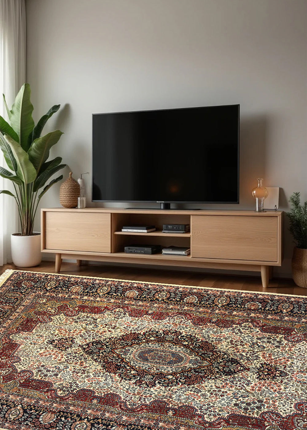 Ruh Safar – Hand Knotted Wool Rug in Navy Blue /Camel Brown