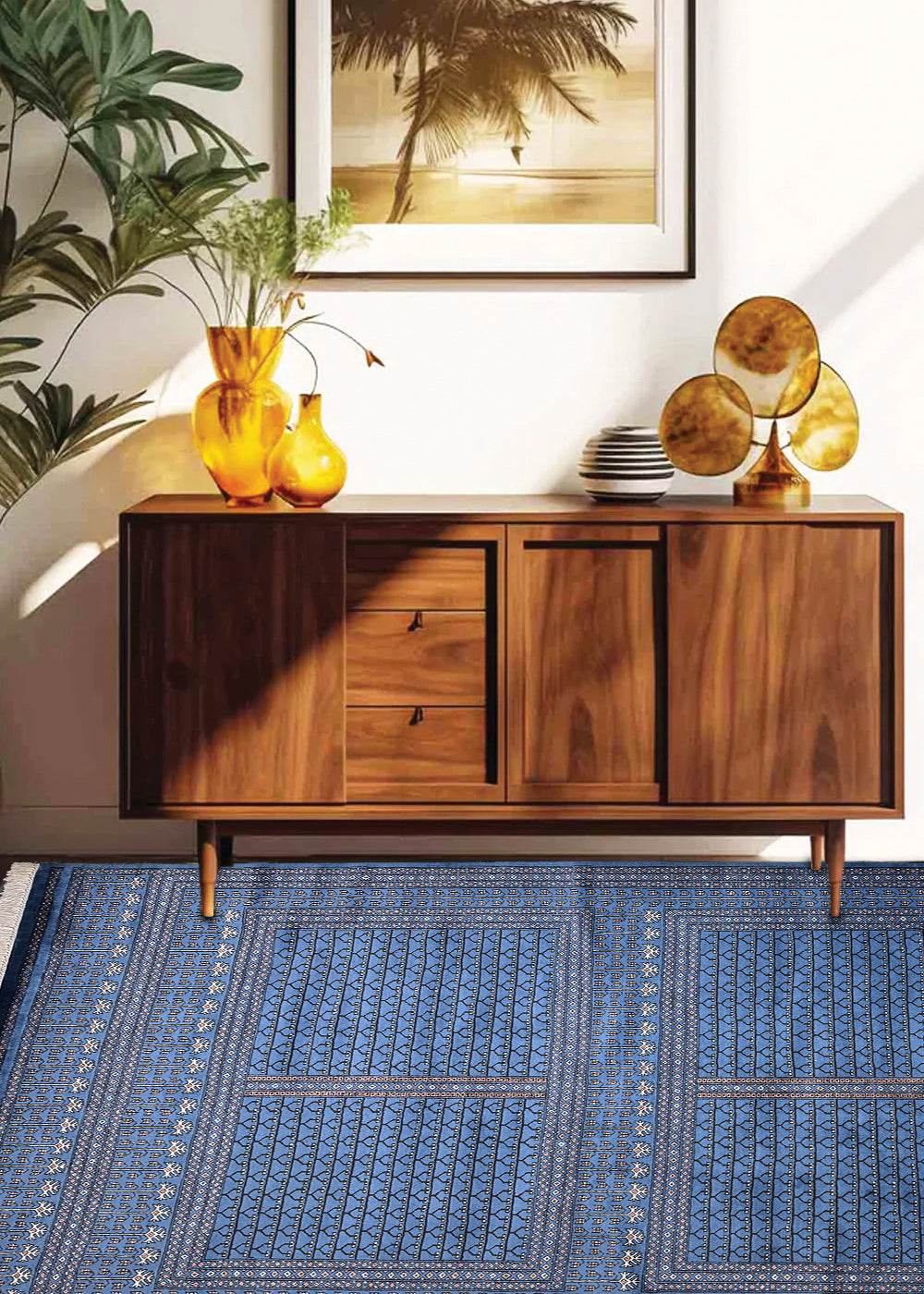Indra Rekha – Hand Woven Wool Rug in Indigo/Cream