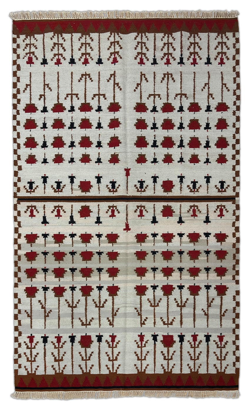 The Aanya Bagh rug celebrates modern minimalism shaped through ancestral craft. Handwoven in pure wool, its stylised floral motifs rise in rhythmic rows — an abstract garden reimagined for contemporary living. The cream base provides calm and balance, while accents of brick red and brown bring warmth and earthy contrast.
