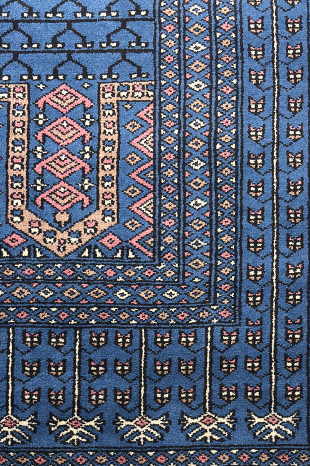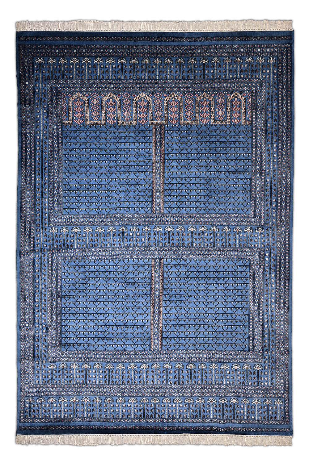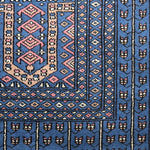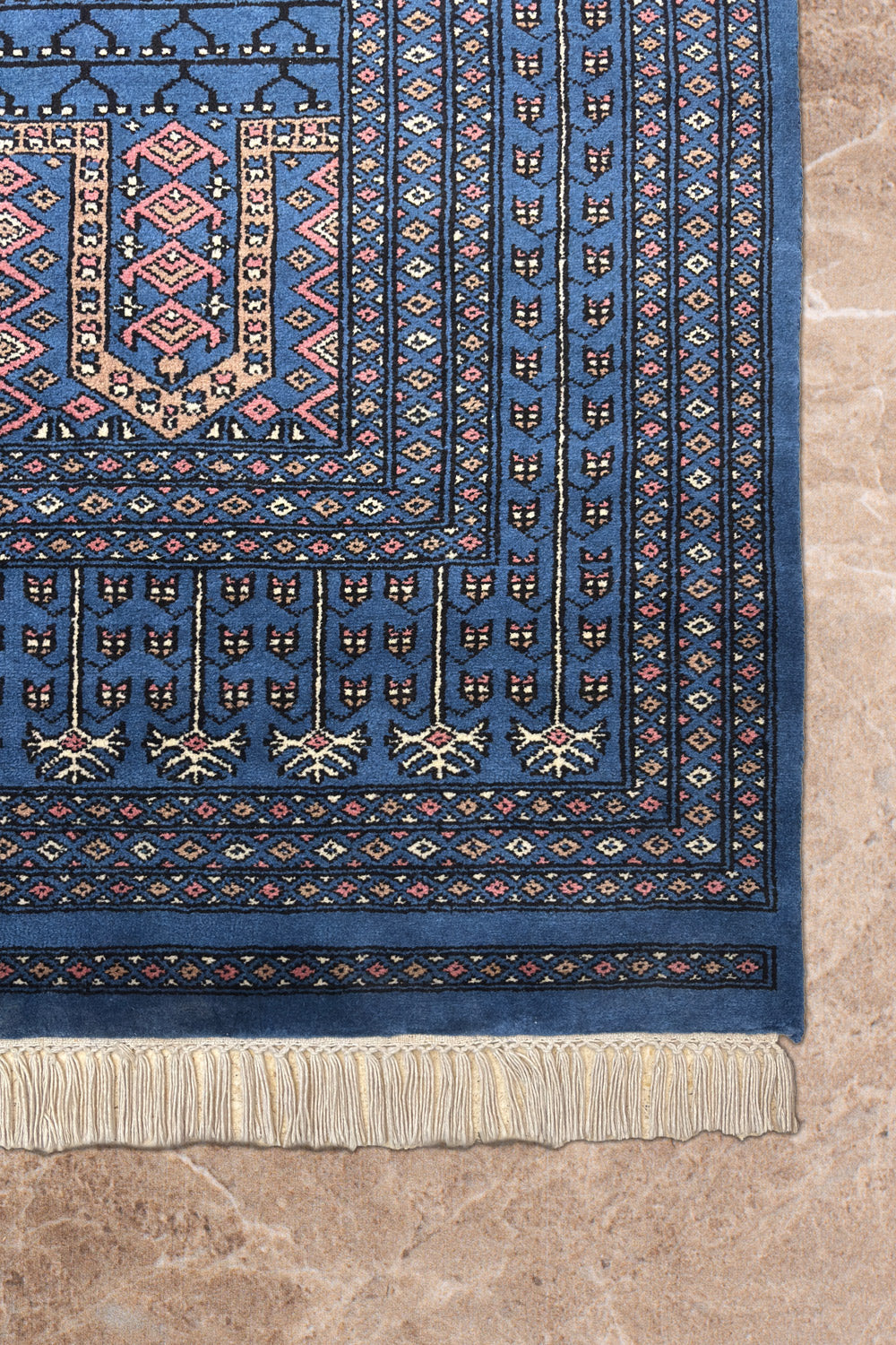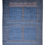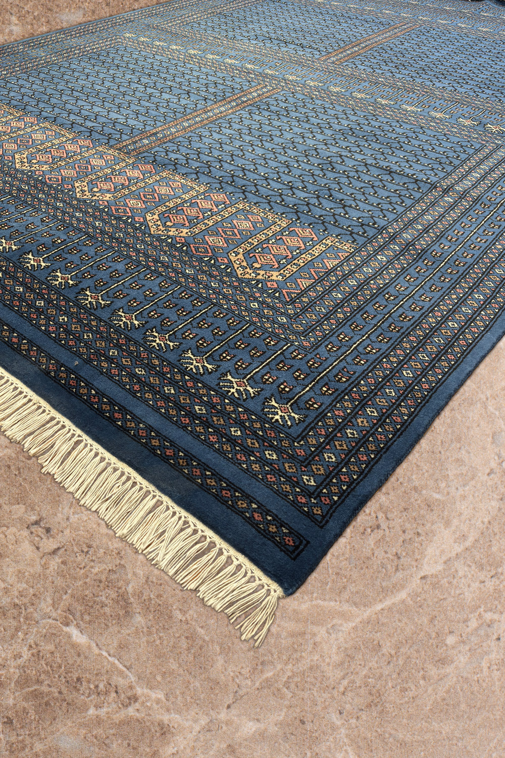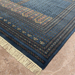 The Aariz rug channels serene geometry and timeless craft. Its prussian blue expanse is framed by intricate borders, each motif echoing the quiet rhythm of hand-knotting perfected over generations. The repeating lattice of stylised vines and arches recalls architectural symmetry from ancient courts, brought to life through wool and patience.