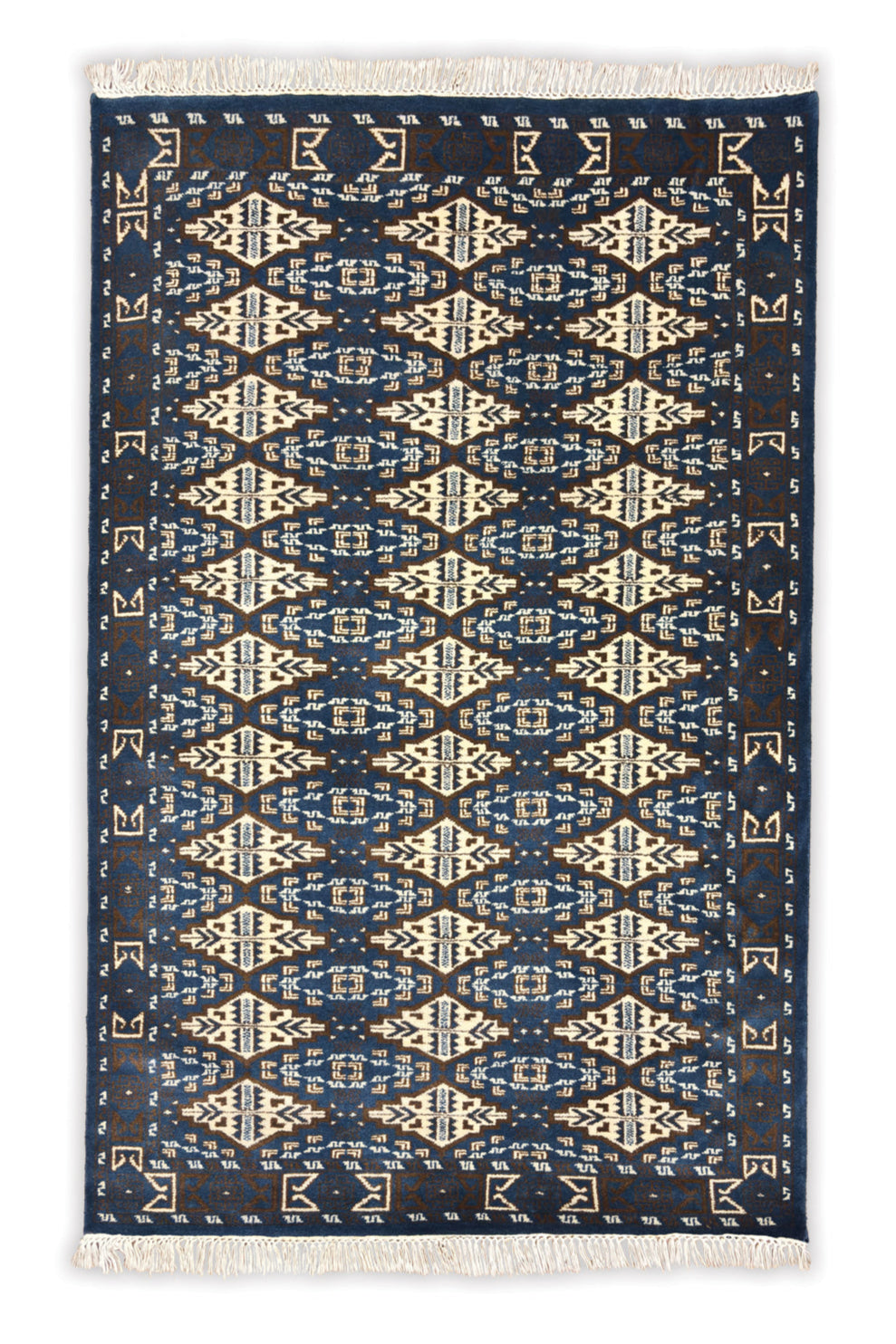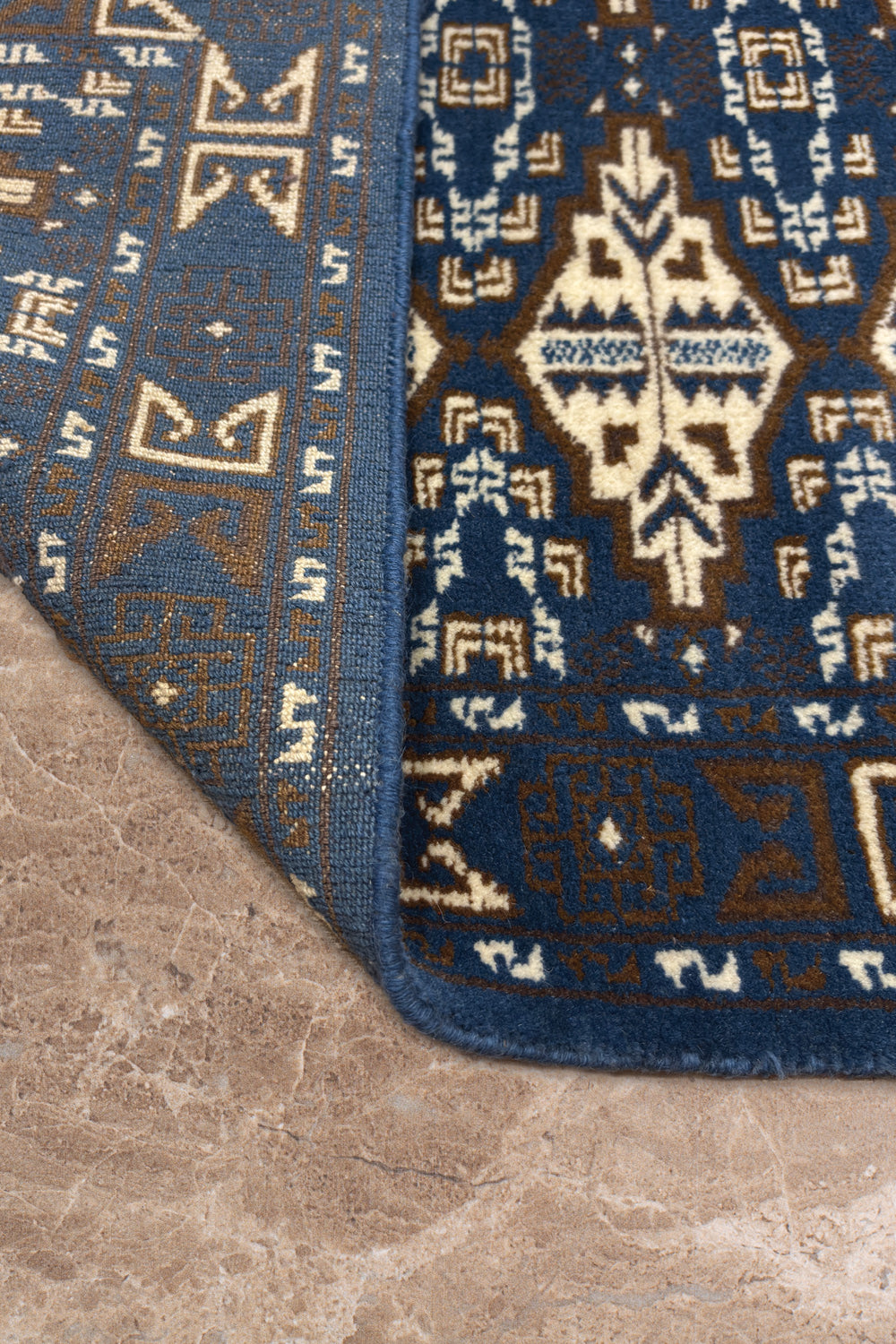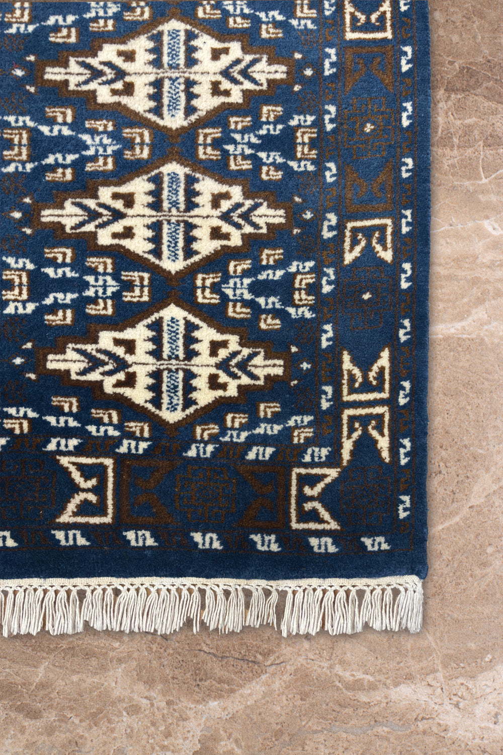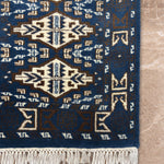 The Aneesh rug brings strength and rhythm through its bold geometric design. A rich cobalt blue field sets the stage for repeating ivory cream motifs, each one carefully hand knotted in fine wool. Inspired by traditional tribal patterns, the design balances symmetry and detail, giving the rug both structure and artistry.