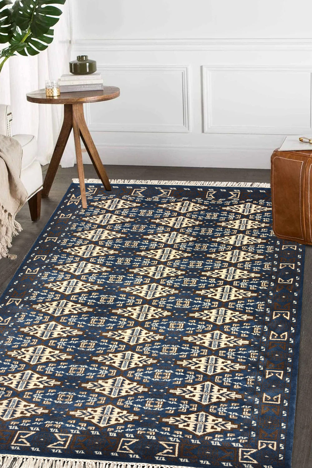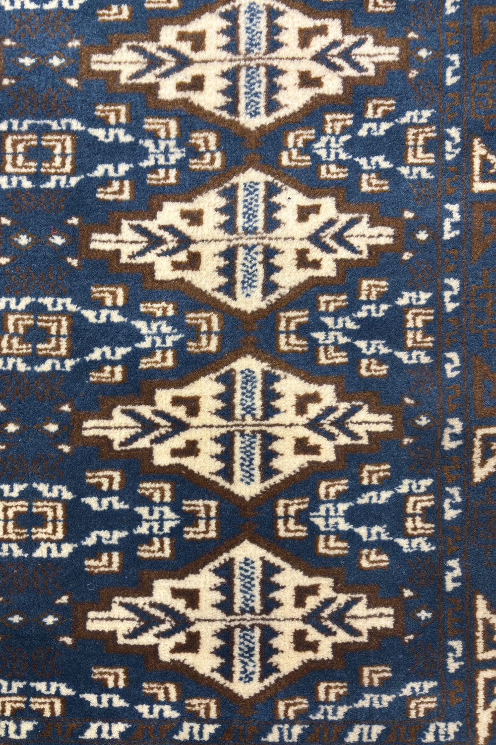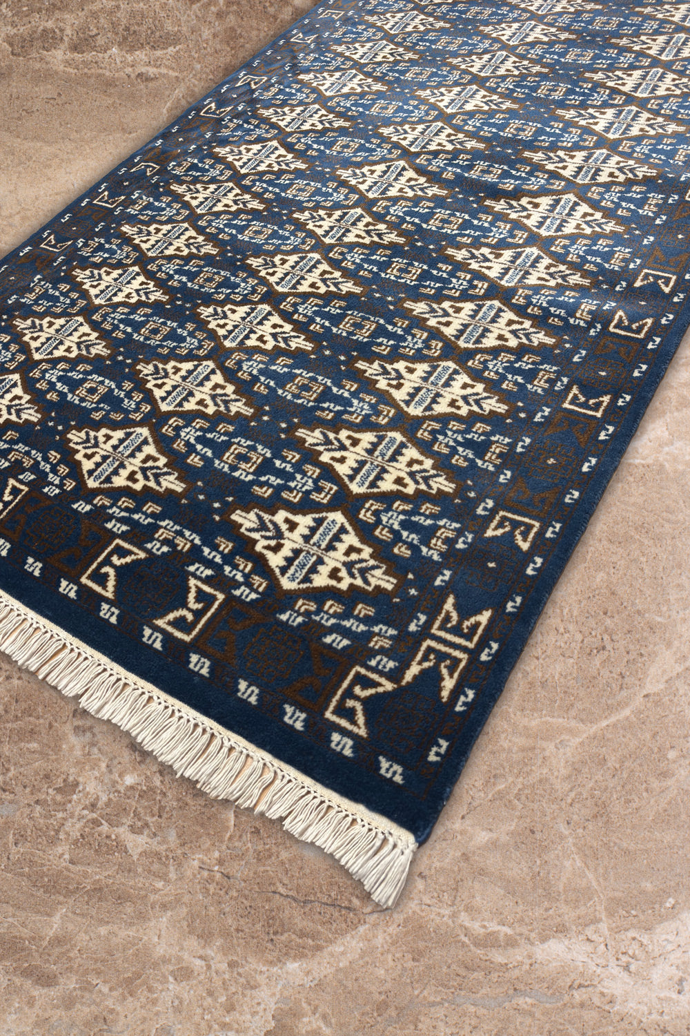 The Aneesh rug brings strength and rhythm through its bold geometric design. A rich cobalt blue field sets the stage for repeating ivory cream motifs, each one carefully hand knotted in fine wool. Inspired by traditional tribal patterns, the design balances symmetry and detail, giving the rug both structure and artistry.