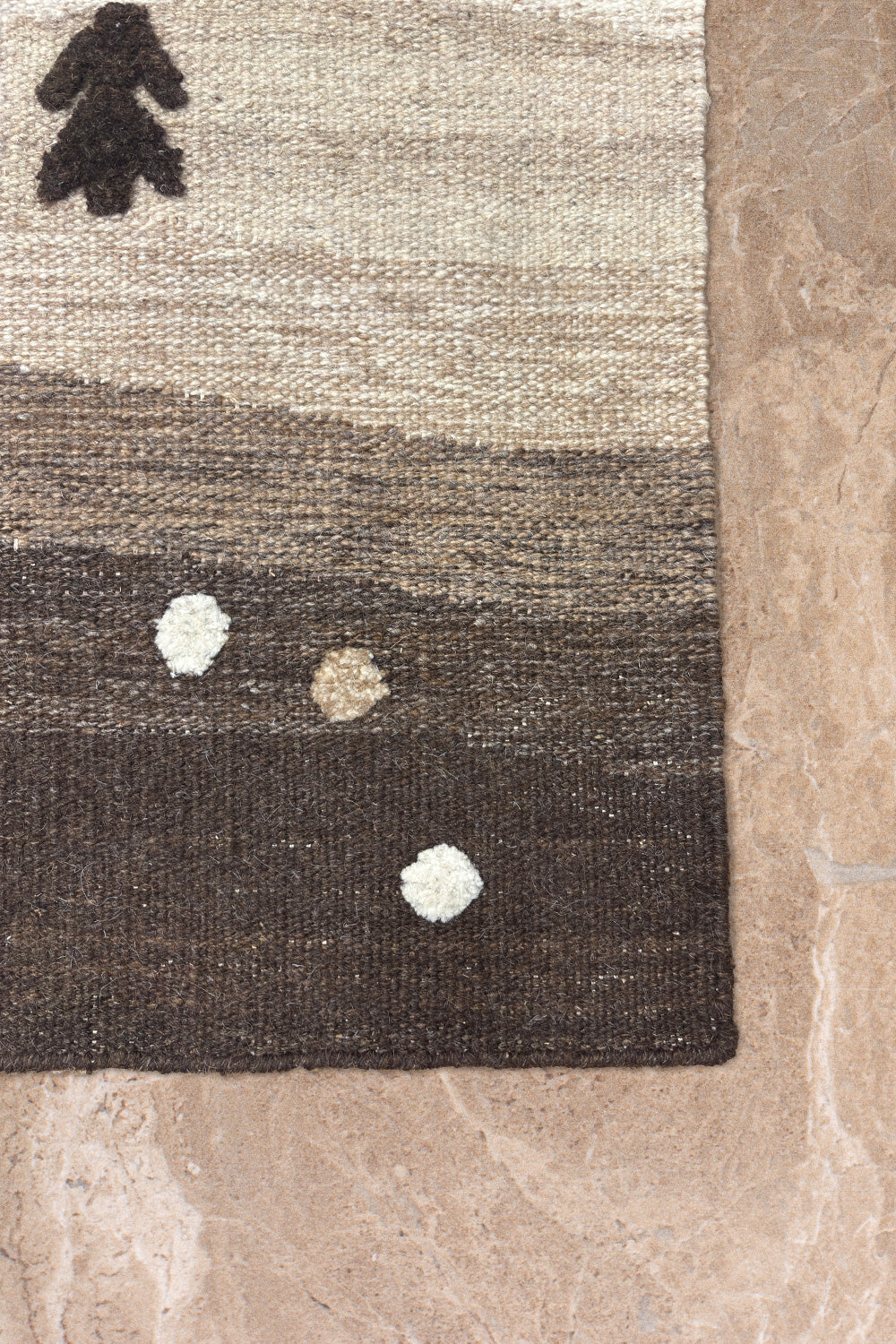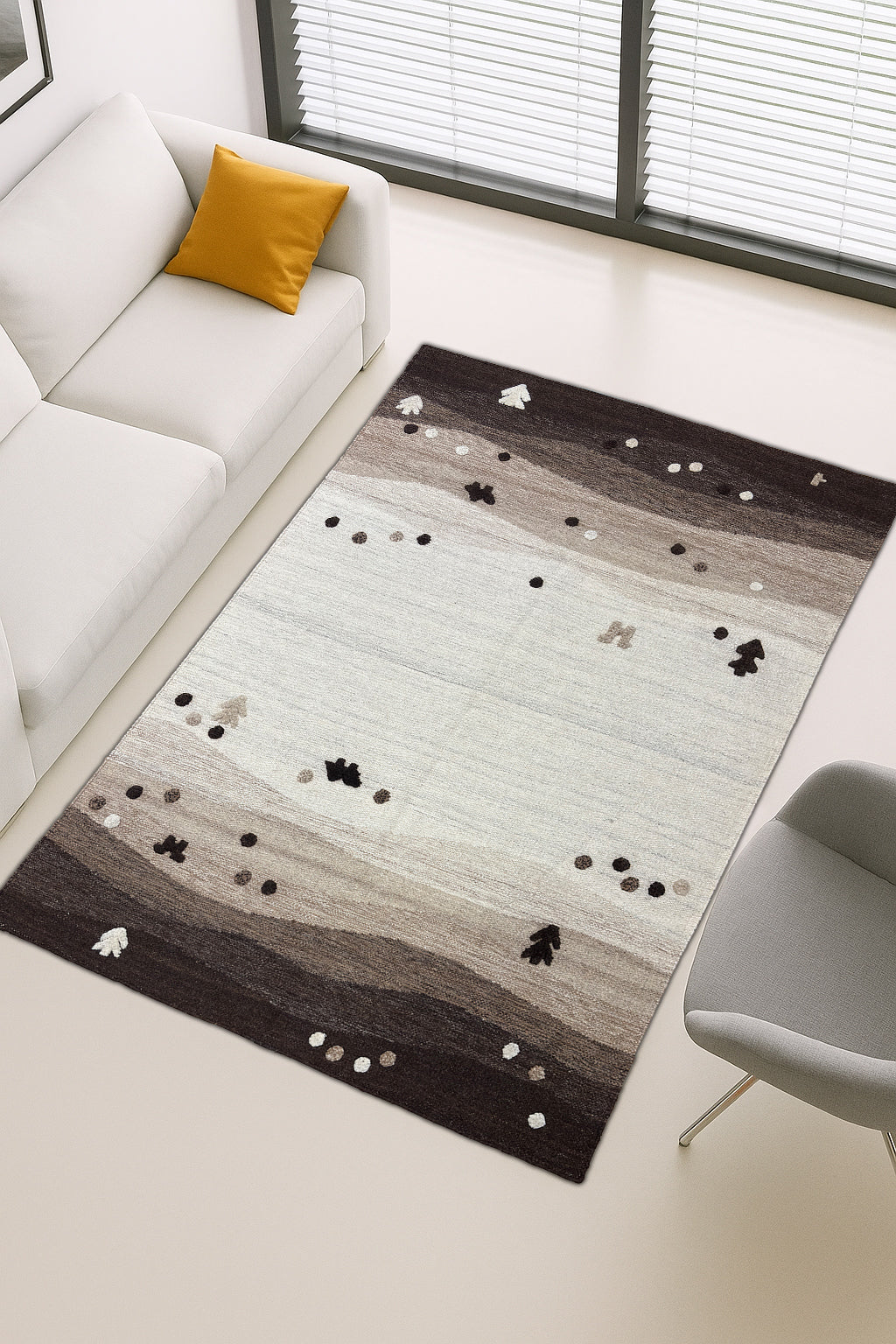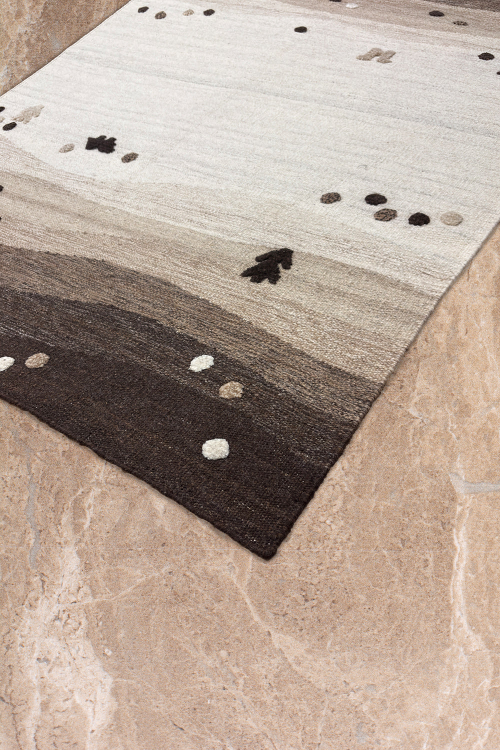 The Dhara Rekha rug draws inspiration from the gentle layers of earth and horizon. Handwoven in wool, its gradient bands of taupe, beige, and cream flow like soft landscapes, punctuated by abstract motifs that resemble trees and pebbles scattered across a calm terrain. The design feels organic and meditative — an ode to the balance between nature and form.