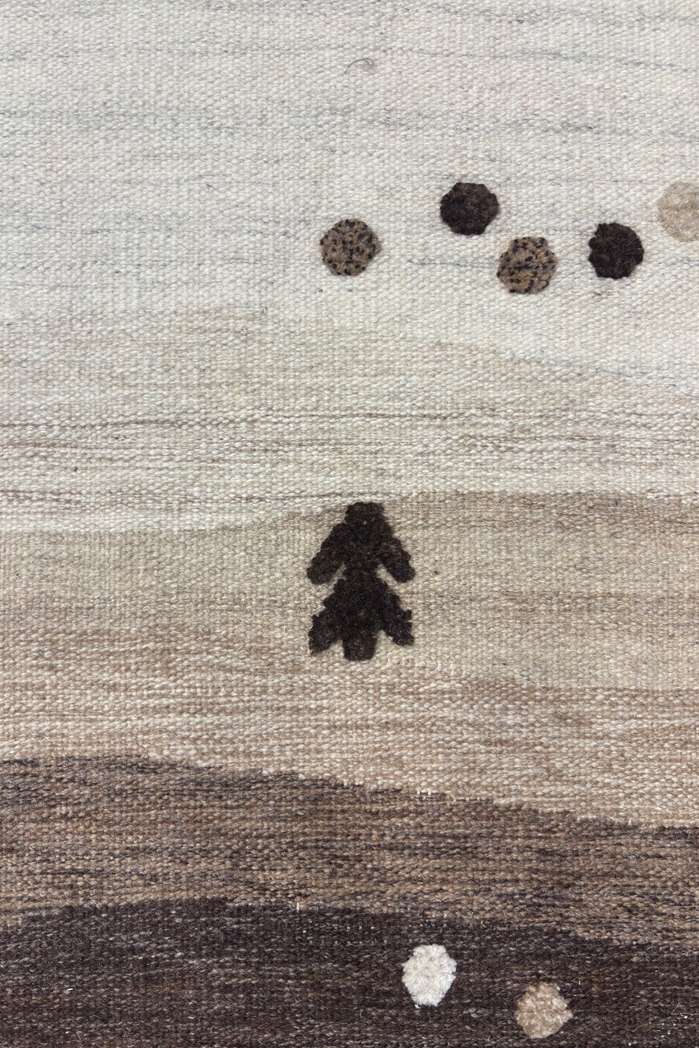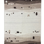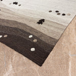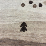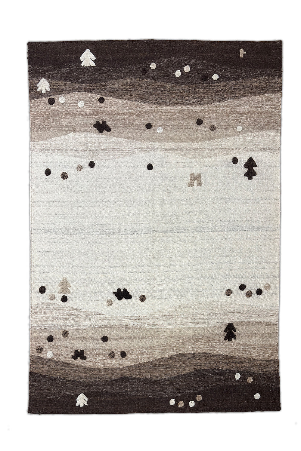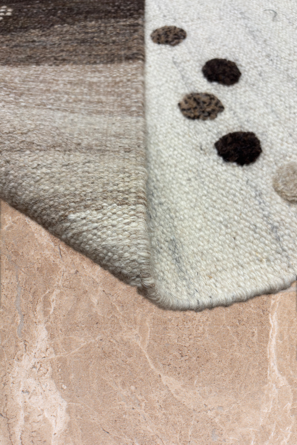 The Dhara Rekha rug draws inspiration from the gentle layers of earth and horizon. Handwoven in wool, its gradient bands of taupe, beige, and cream flow like soft landscapes, punctuated by abstract motifs that resemble trees and pebbles scattered across a calm terrain. The design feels organic and meditative — an ode to the balance between nature and form.