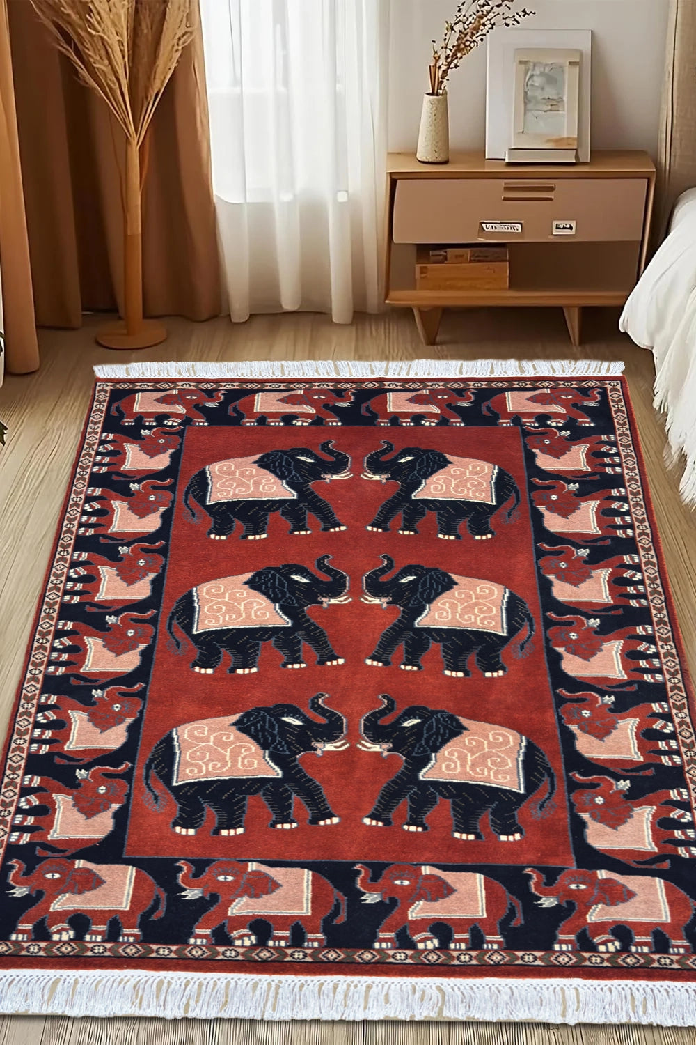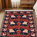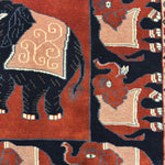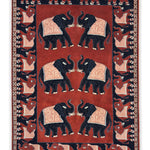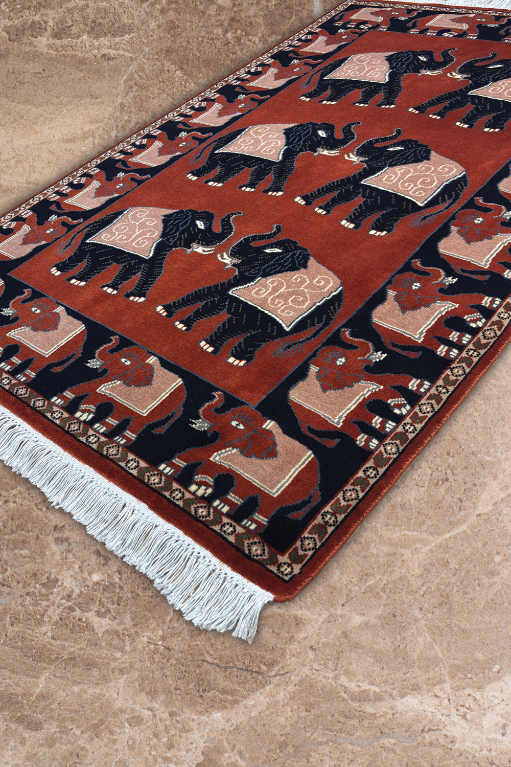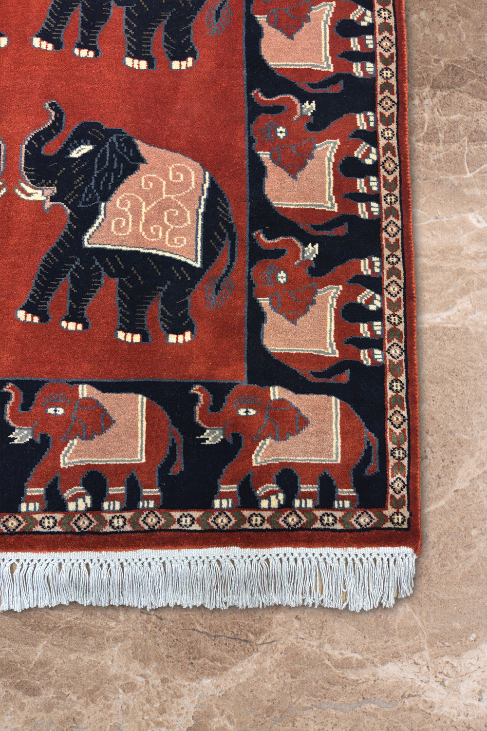 The Gajendra rug is a celebration of Indian heritage, where elephants, timeless symbols of strength, wisdom, and good fortune, march proudly across a rich rust red field. Midnight blue borders frame the composition with depth, while intricate peach accents highlight the detailing of each hand knotted motif.