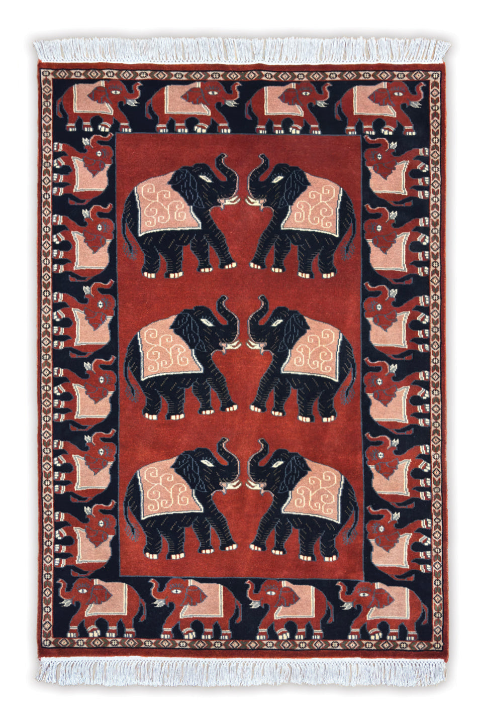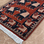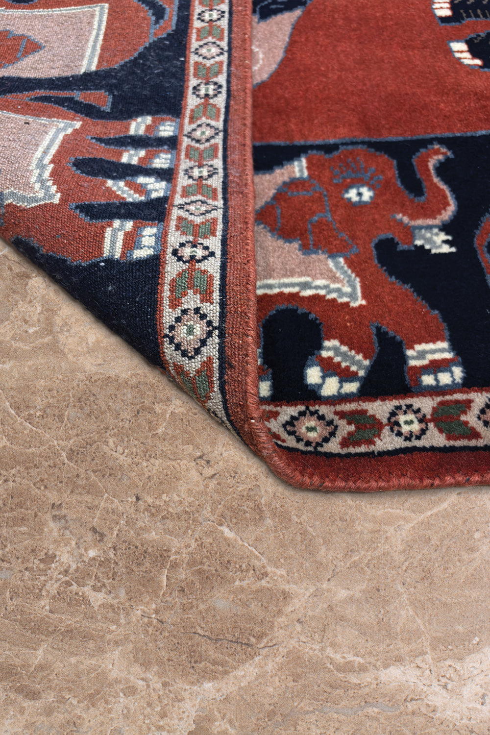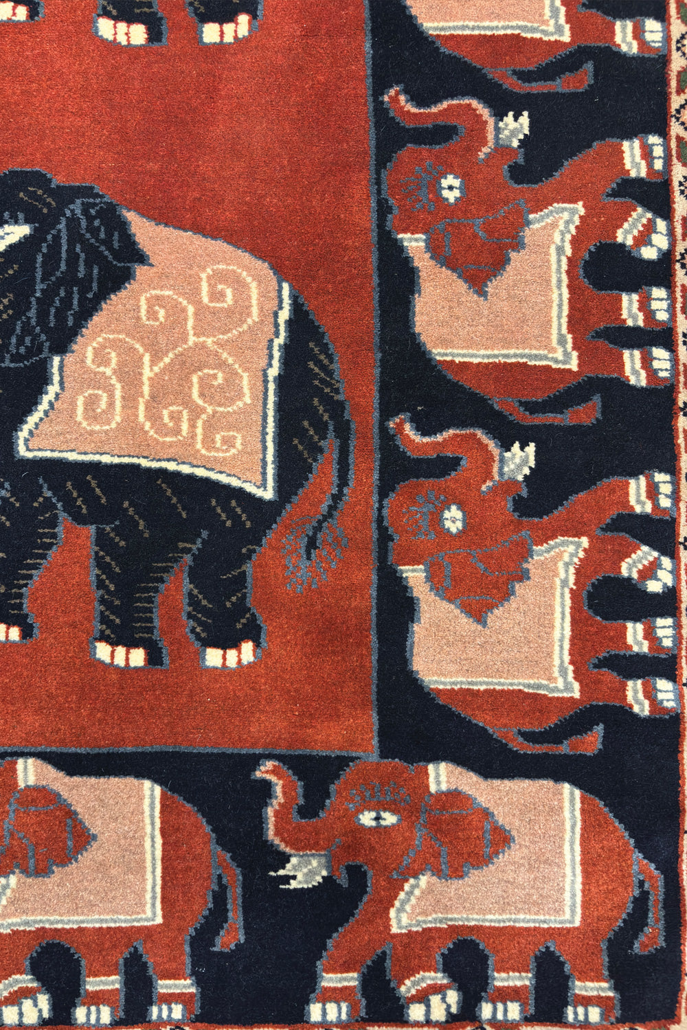 The Gajendra rug is a celebration of Indian heritage, where elephants, timeless symbols of strength, wisdom, and good fortune, march proudly across a rich rust red field. Midnight blue borders frame the composition with depth, while intricate peach accents highlight the detailing of each hand knotted motif.