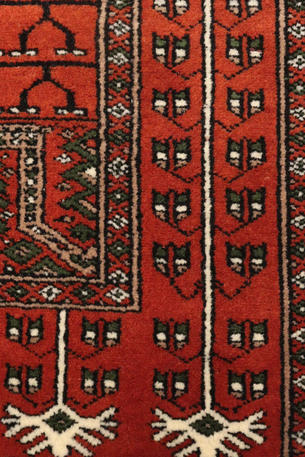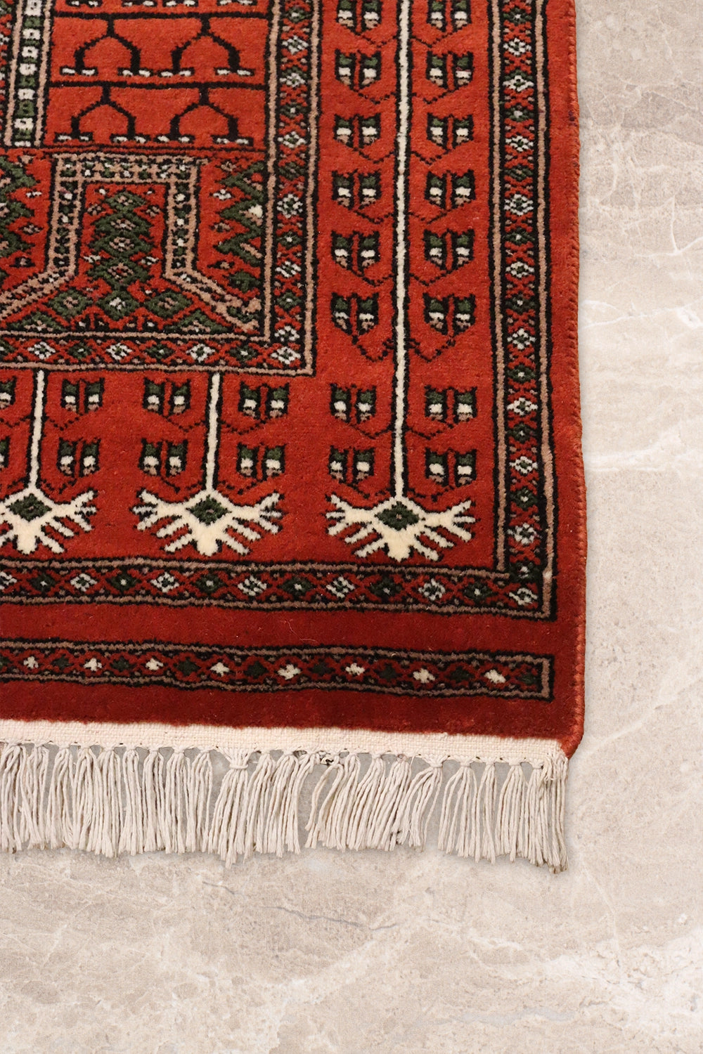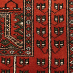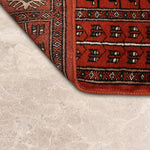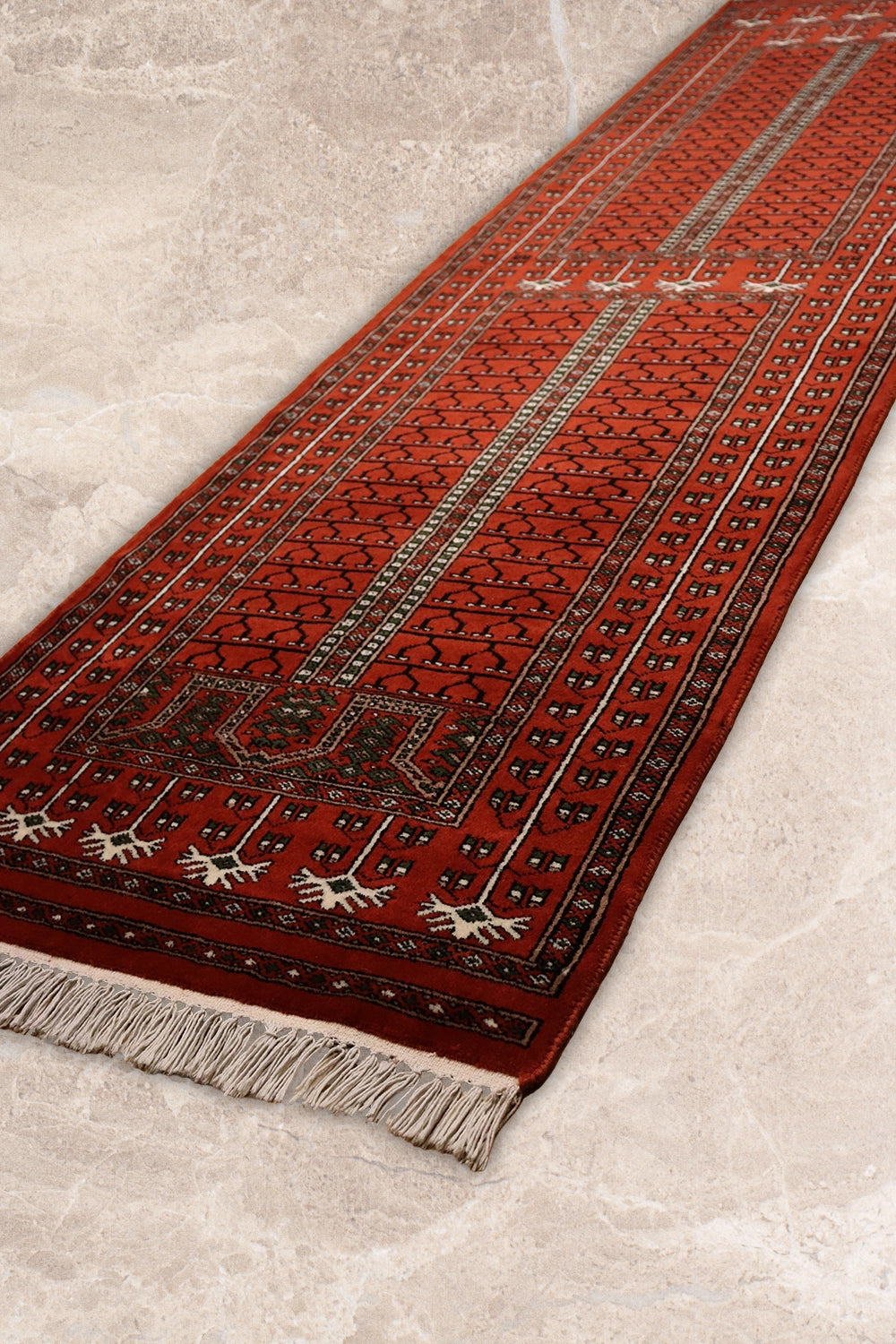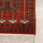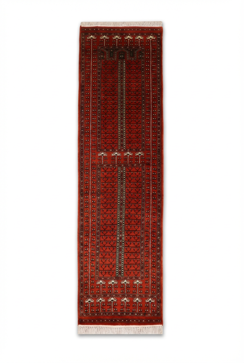 Ghazali is a traditional oriental runner defined by its deep rust-red ground and disciplined geometric layout. Repeating tribal motifs are arranged in balanced vertical panels, creating a sense of rhythm and continuity that reflects time-honoured weaving traditions.