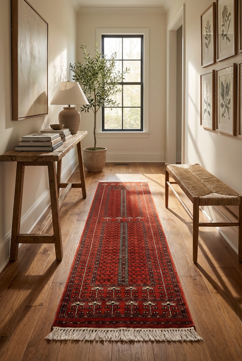Hand-knotted in wool with a mild-soft, medium pile, this runner is designed to bring warmth and character to hallways and narrow spaces. The rich rust and brown palette adds depth without overpowering, making it a striking yet versatile piece for classic interiors.