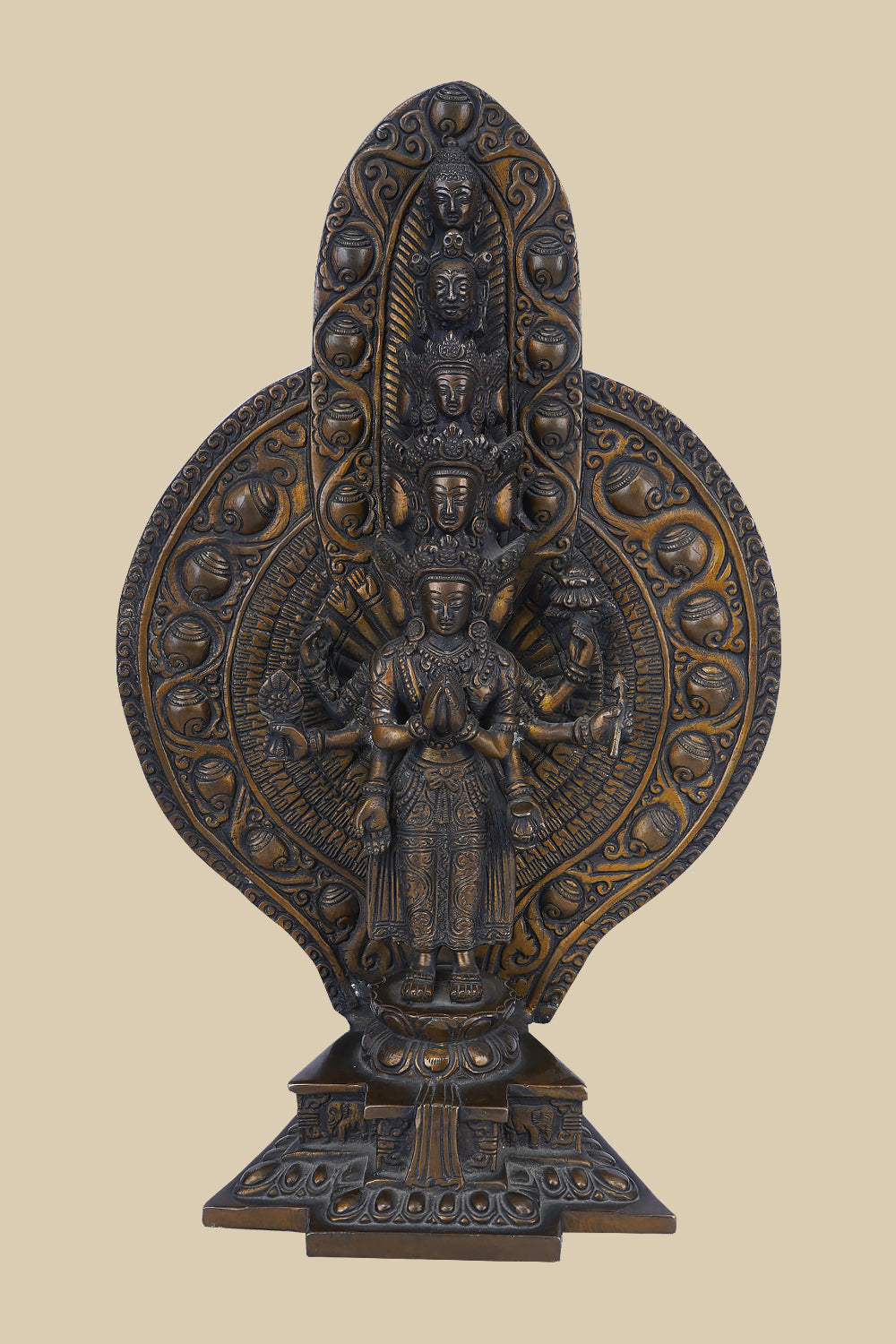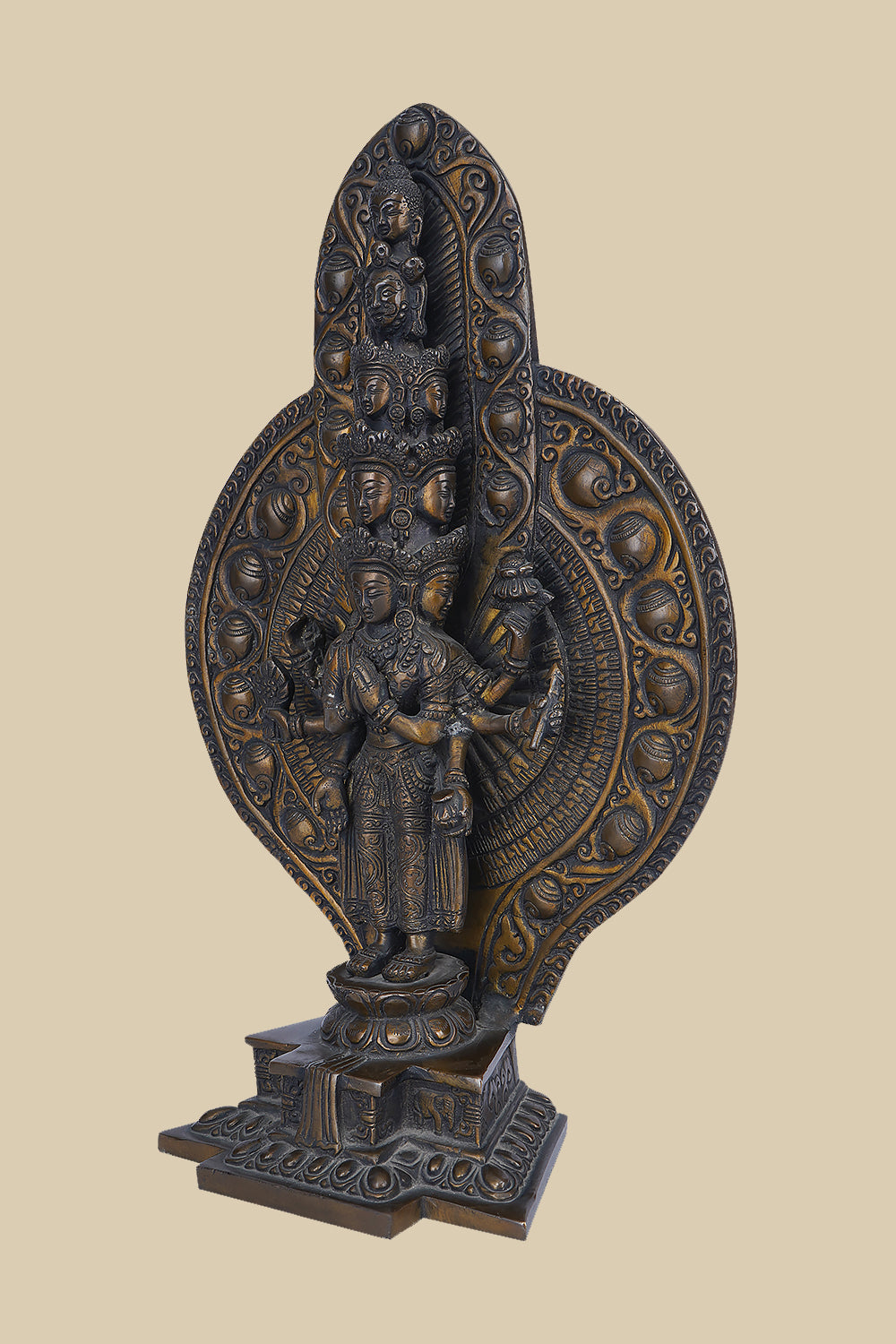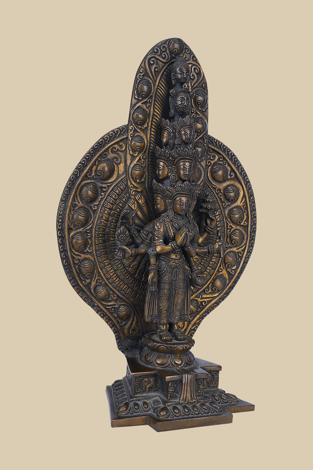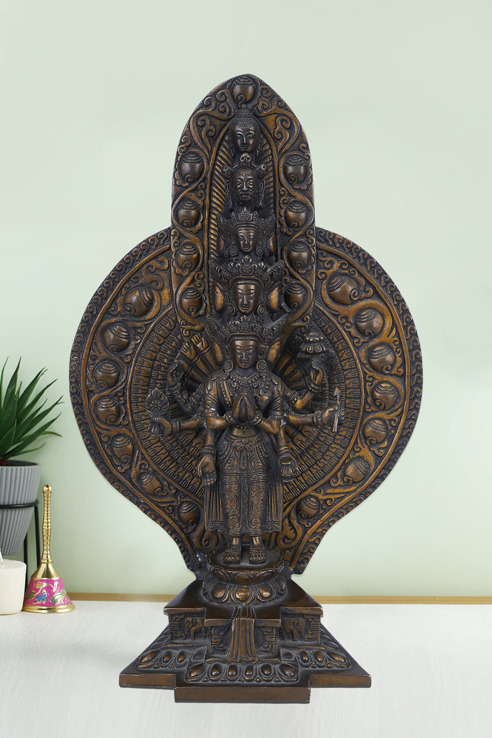 The Brass Loketeshwara statue (38 cm x 24 cm x 14 cm) is a stunning representation of Avalokiteshvara, the Bodhisattva of Compassion, revered in Buddhist tradition. Cast in shining brass, this antique sculpture embodies the deity’s grace and benevolent presence. The intricate detailing, from the flowing robes to the delicate ornaments, reflects the divine essence of compassion and wisdom.