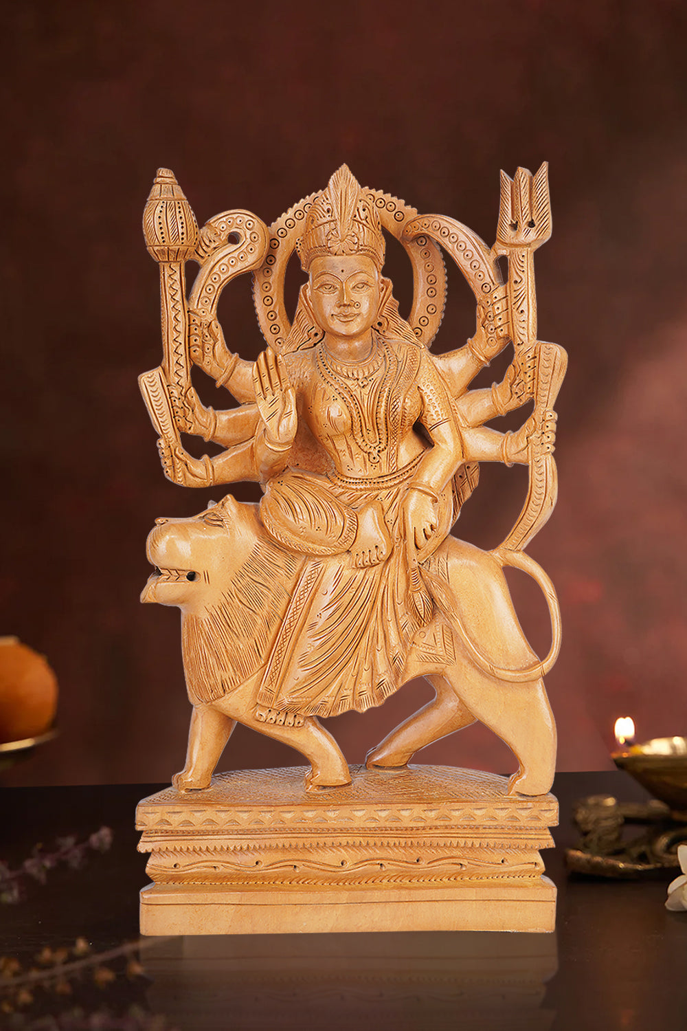 The Wooden Durga statue (32 cm x 19 cm x 7 cm) is a powerful depiction of the warrior goddess who embodies courage, protection, and divine strength. Hand-carved from rich wood, this sculpture showcases Durga in her majestic form, complete with intricate detailing that highlights her dynamic posture, traditional attire, and sacred weapons.