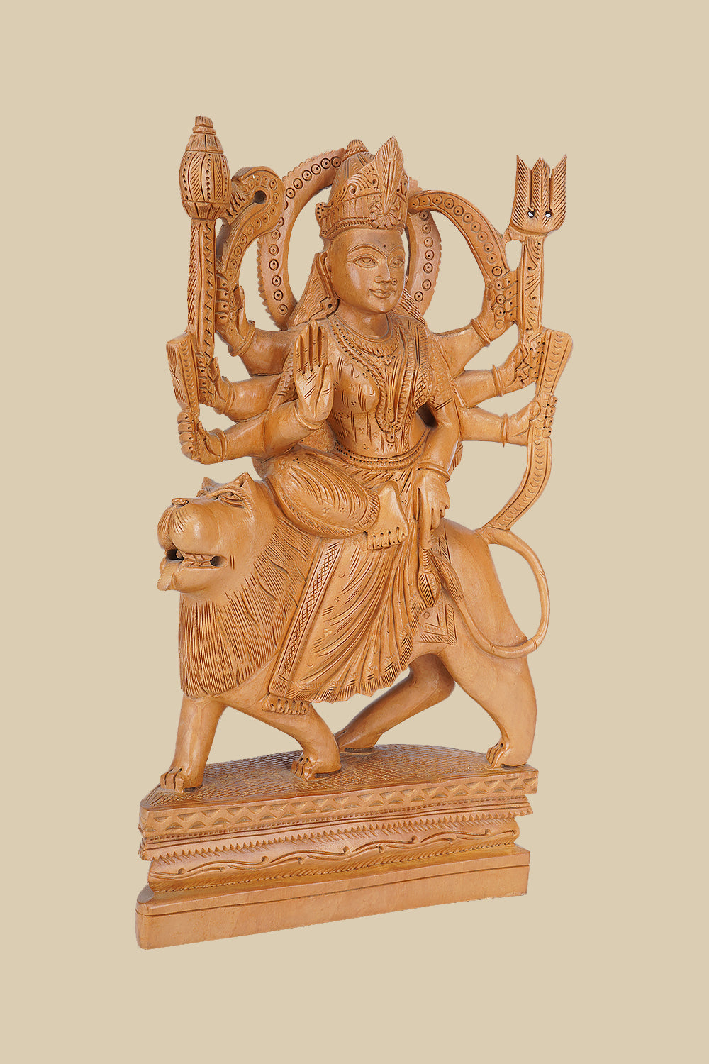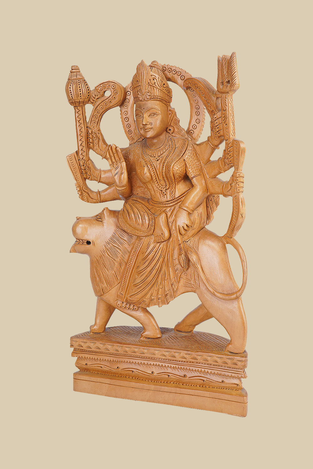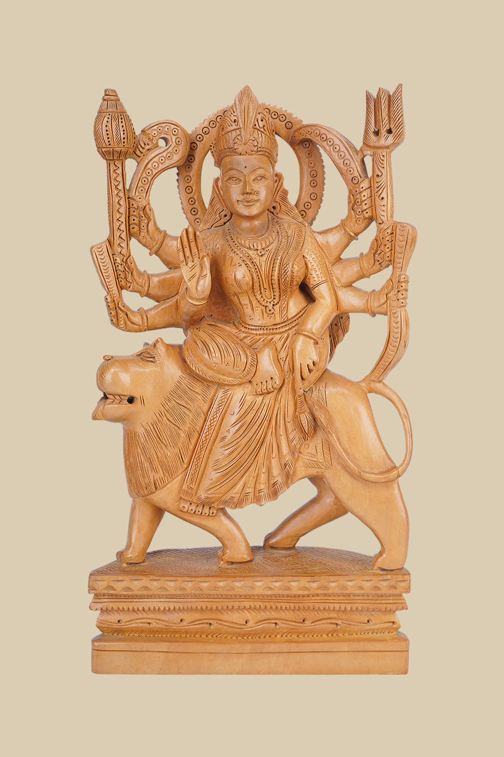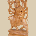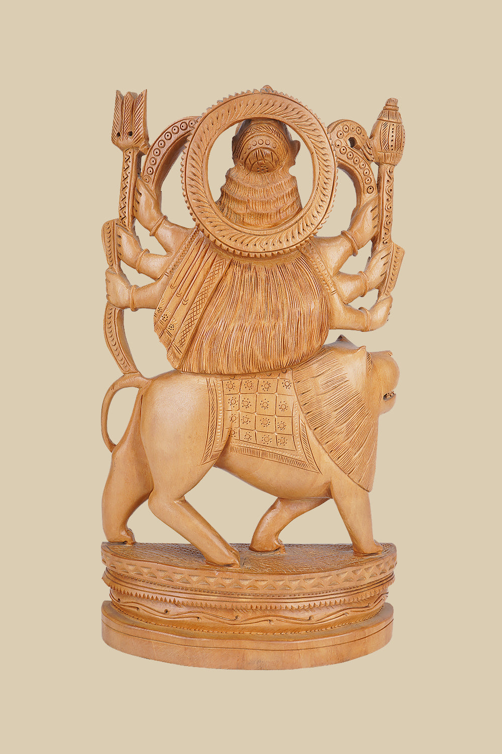 Durga’s protective essence is vividly captured in this antique-style sculpture. Her expression is a balance of grace and authority, inviting reverence while symbolizing her role as a defender against negativity. The wood’s natural texture enhances the fluidity of the carving, creating a harmonious blend of material and divine energy.