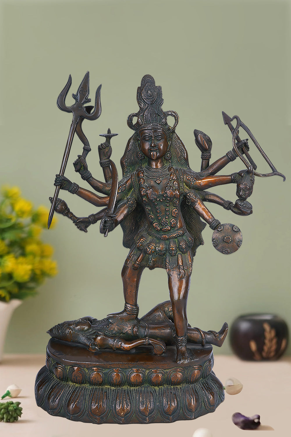 Kali, the goddess of time and transformation, is revered as both a protector and destroyer of evil. This statue reflects the depth of her divine essence, from the swirling energy around her form to the bold engraving of her ornaments. The natural luster of brass enhances her commanding presence, imbuing the space with an undeniable spiritual energy. Ideal for collectors of antiques or those seeking to honor her in their sacred spaces, this decorative statue is a striking addition to any home. It tells the story of Kali’s role in overcoming darkness, inviting her fierce blessings of protection and transformation while serving as a testament to India’s rich artistic heritage.