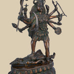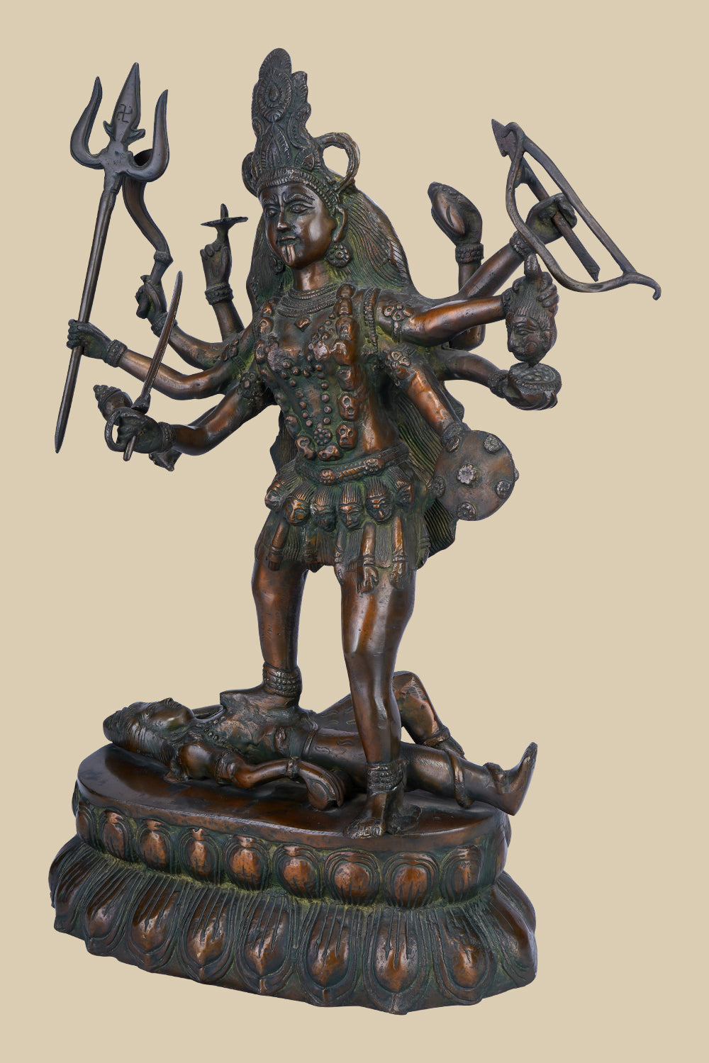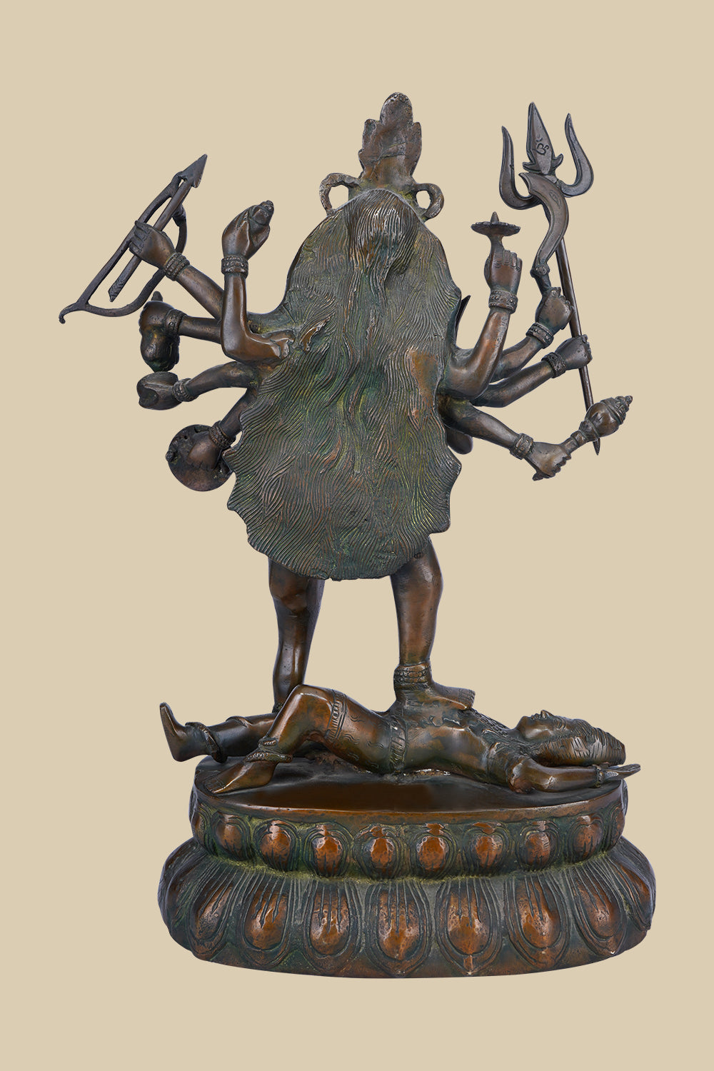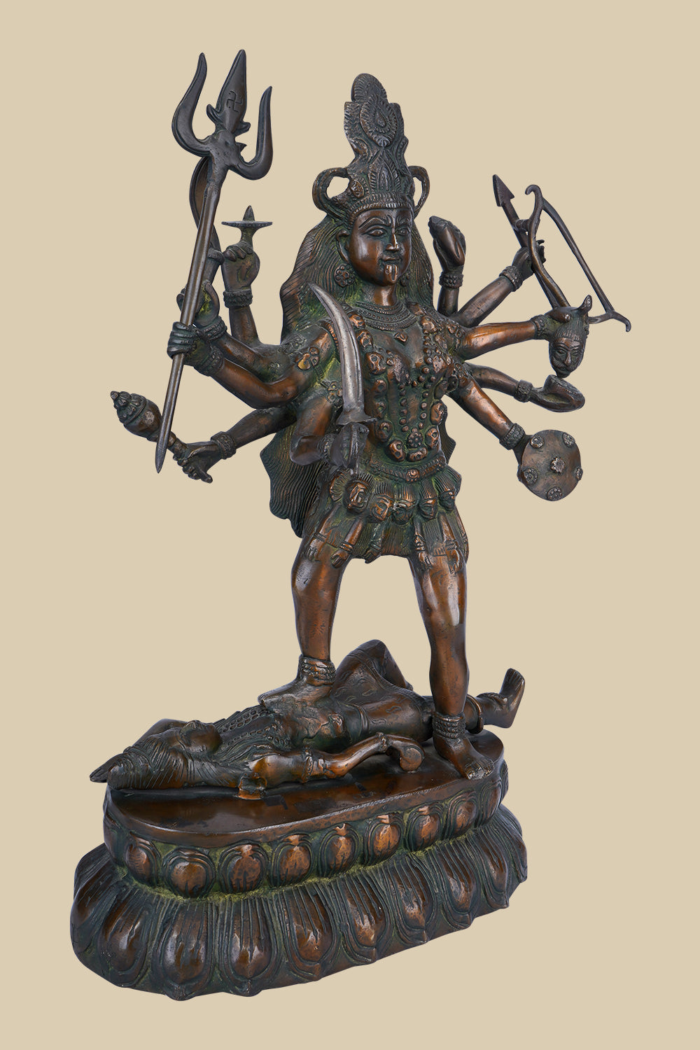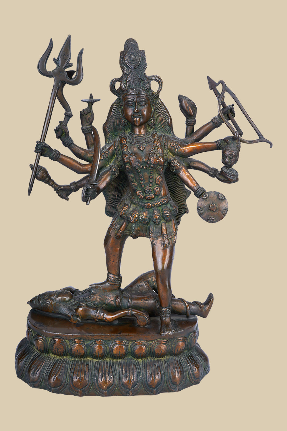 The Brass Goddess Kali statue (53 cm x 36 cm x 19 cm) embodies the fierce yet protective energy of one of Hindu mythology’s most powerful deities. Crafted in gleaming brass, this antique sculpture captures Kali in all her dynamic glory, with her iconic stance radiating power and fearlessness. The intricately carved details bring to life her fierce expressions, symbolic weapons, and traditional adornments, making the statue a profound representation of divine strength and justice.