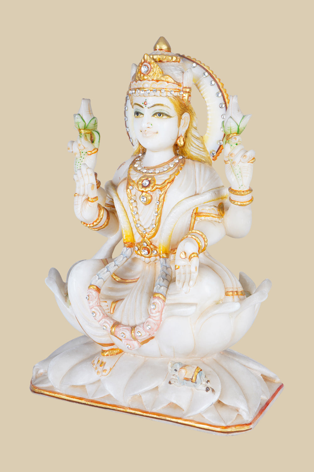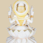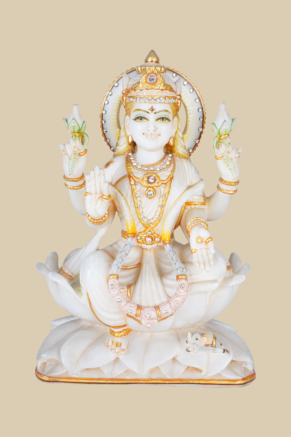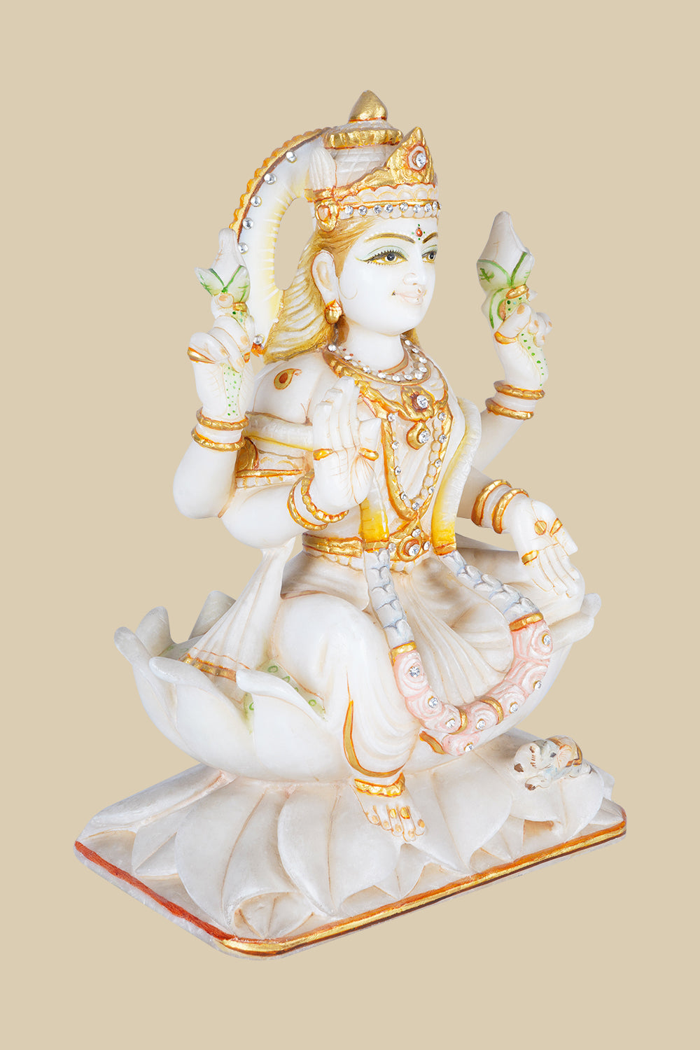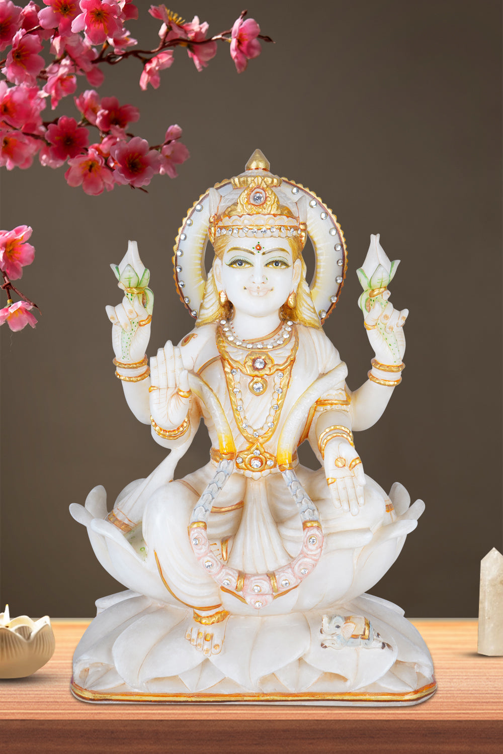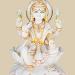 This exquisite marble statue of Goddess Lakshmi is a timeless representation of divinity, carefully hand-carved from pristine marble. This sculpture radiates serenity, grace, and symbolic opulence. Goddess Lakshmi, revered as the harbinger of wealth, prosperity, and auspiciousness, is depicted seated atop a blooming lotus, her throne, representing purity, wealth, and divine energy.
