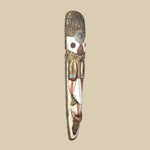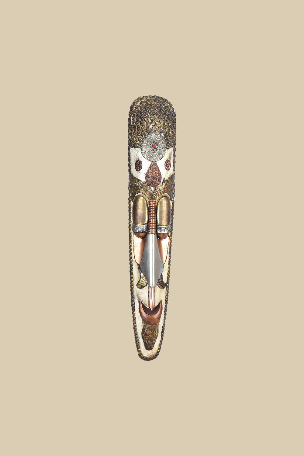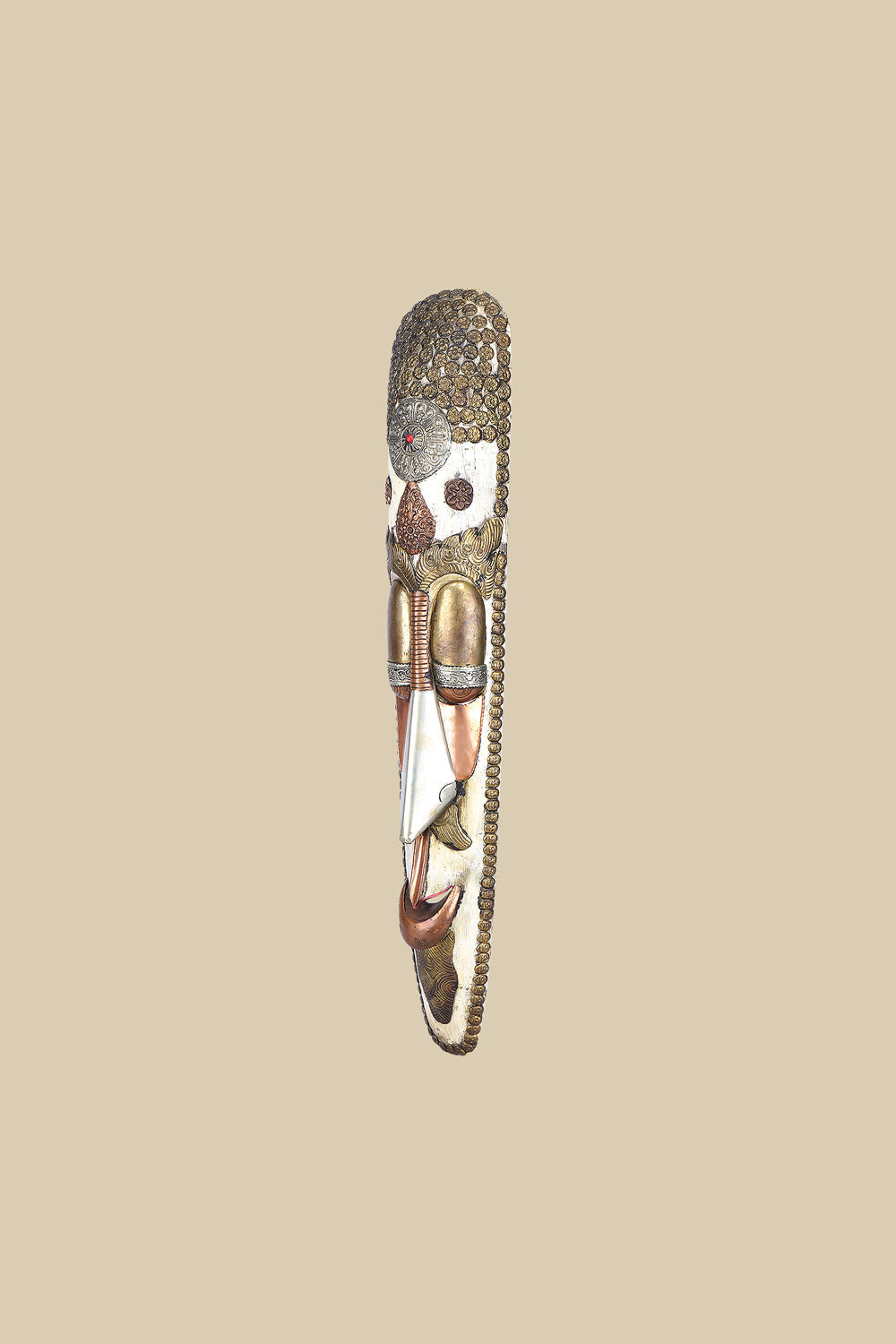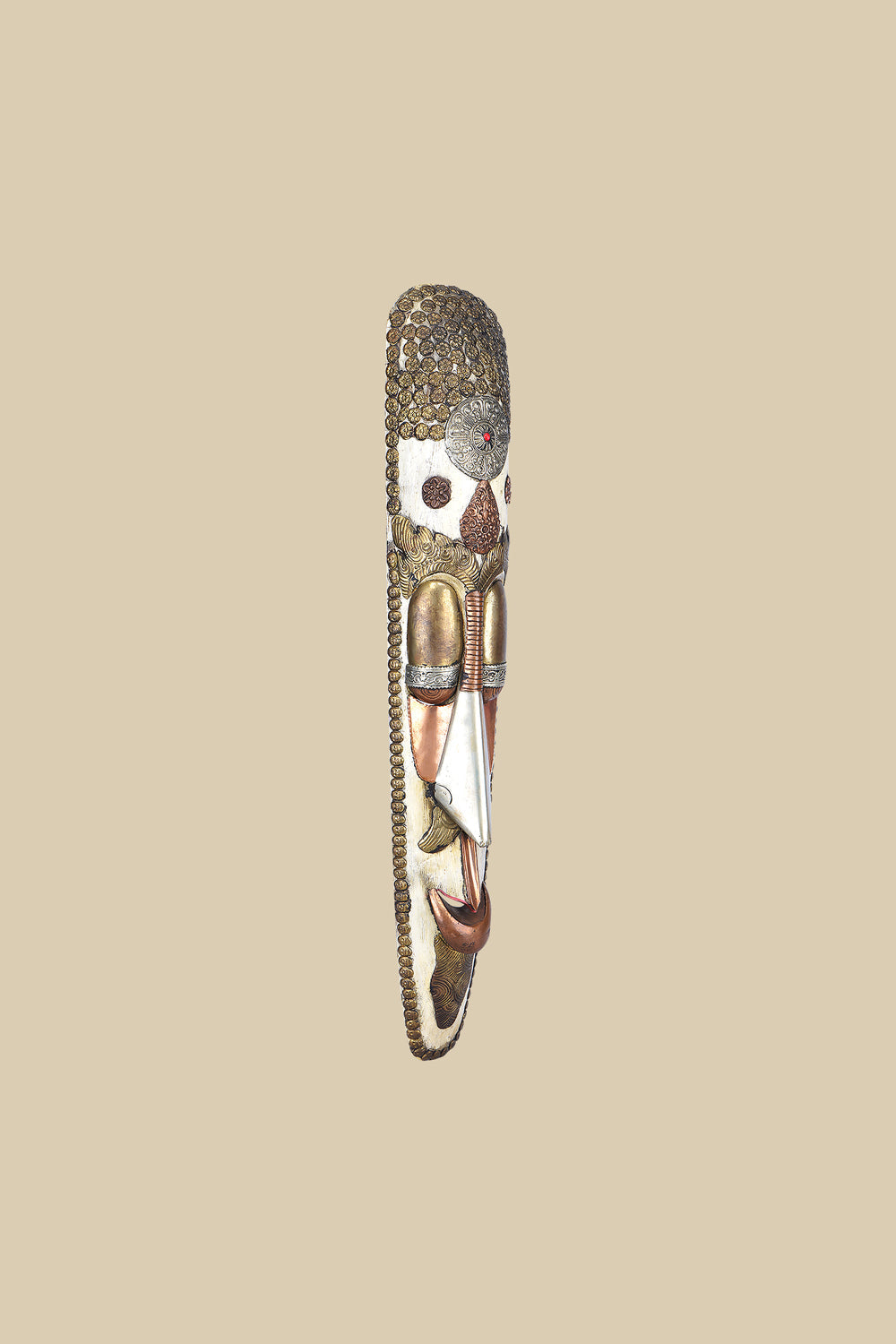The design of this mask serves as a symbol of wisdom and protection, characteristic of the Lama, who is revered for his deep understanding and guidance in Tibetan Buddhism. Each curve, each carved detail, invites you to pause and reflect, allowing the mask to not only serve as a decorative piece but as an object of contemplation.