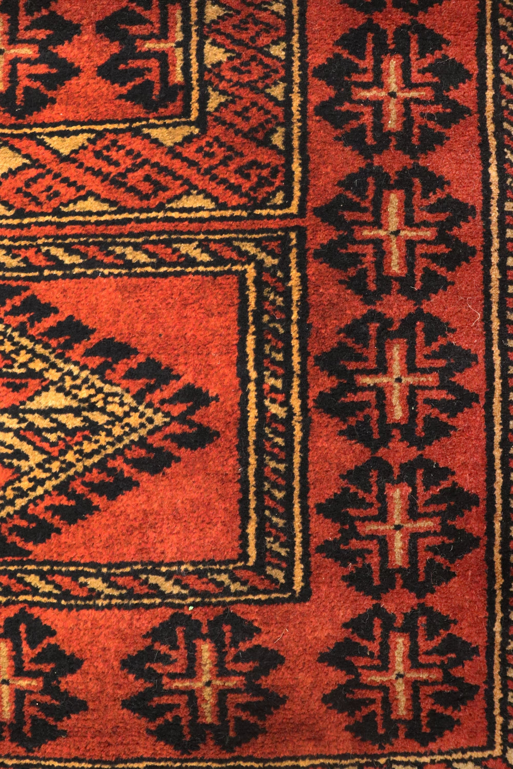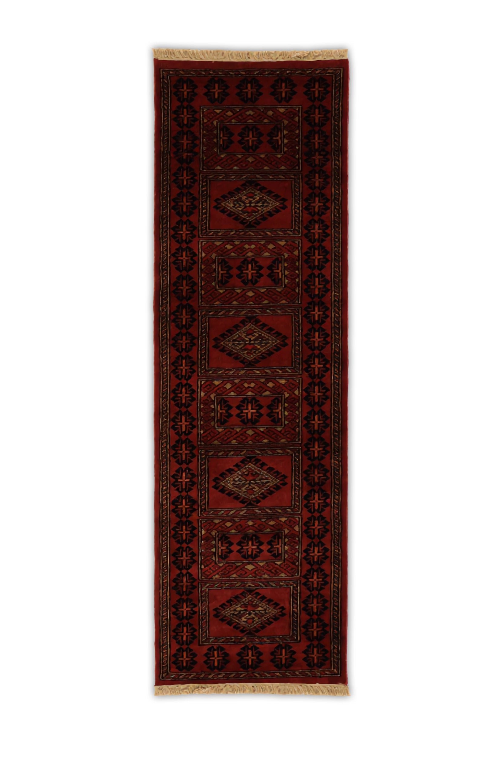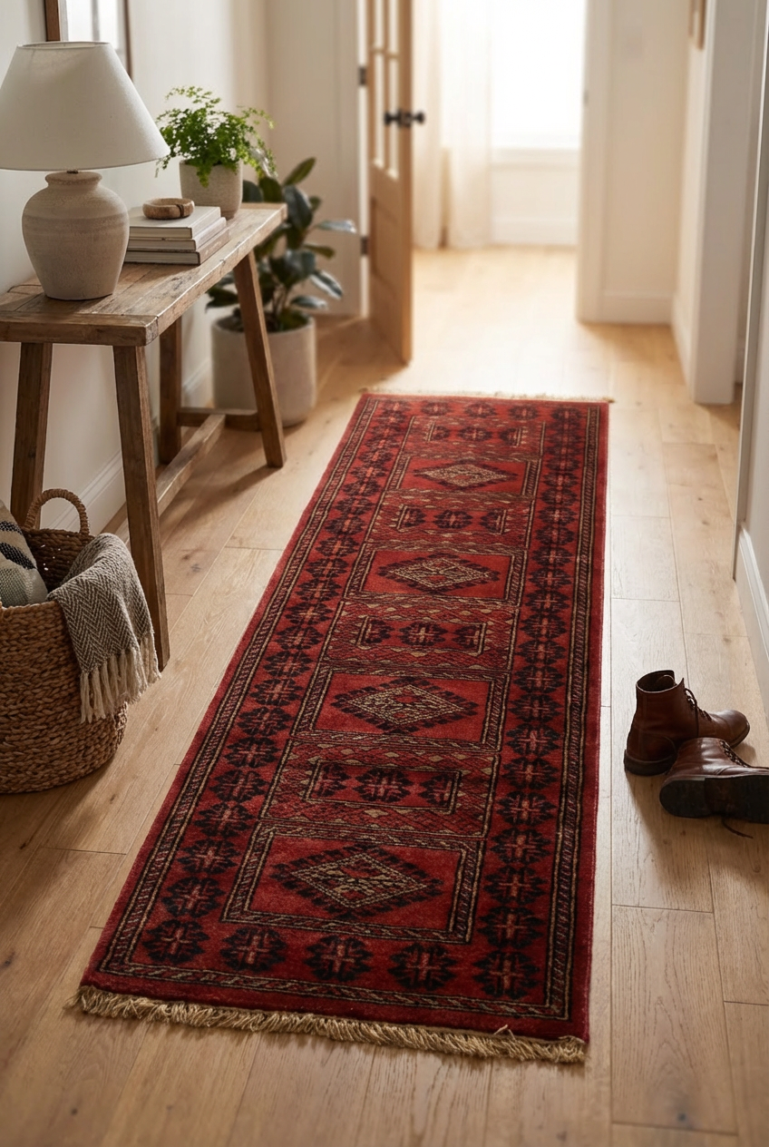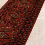 Gulvar is a traditional tribal runner marked by bold geometry and a commanding linear rhythm. Repeating diamond medallions and angular motifs run along the length of the rug, creating a strong sense of direction and balance, while the deep rust ground lends warmth and intensity to the design.