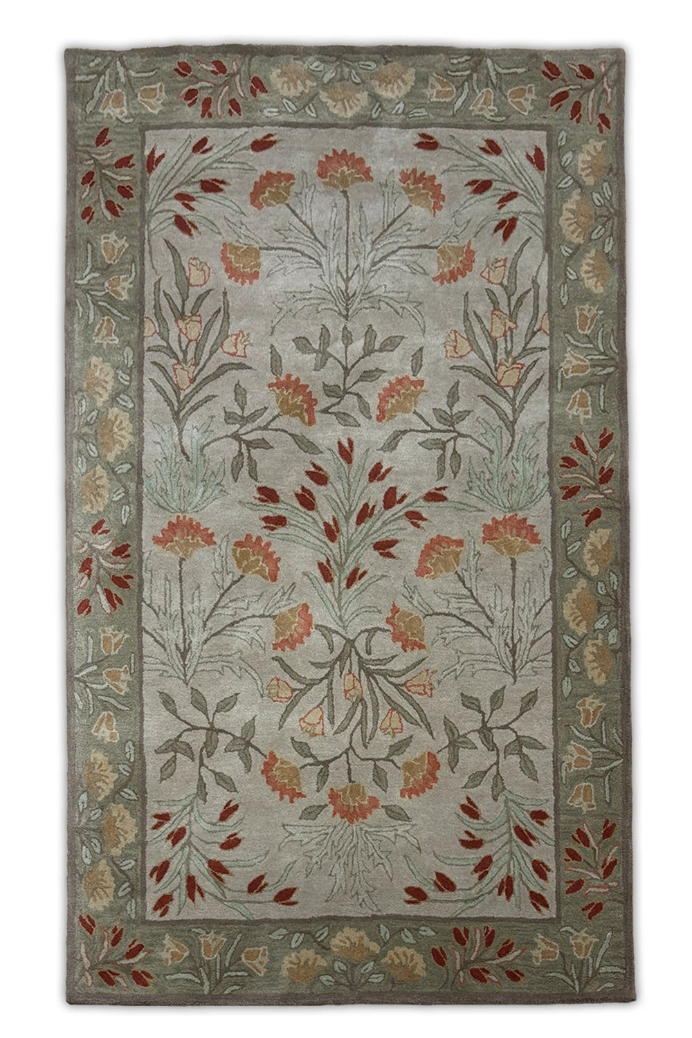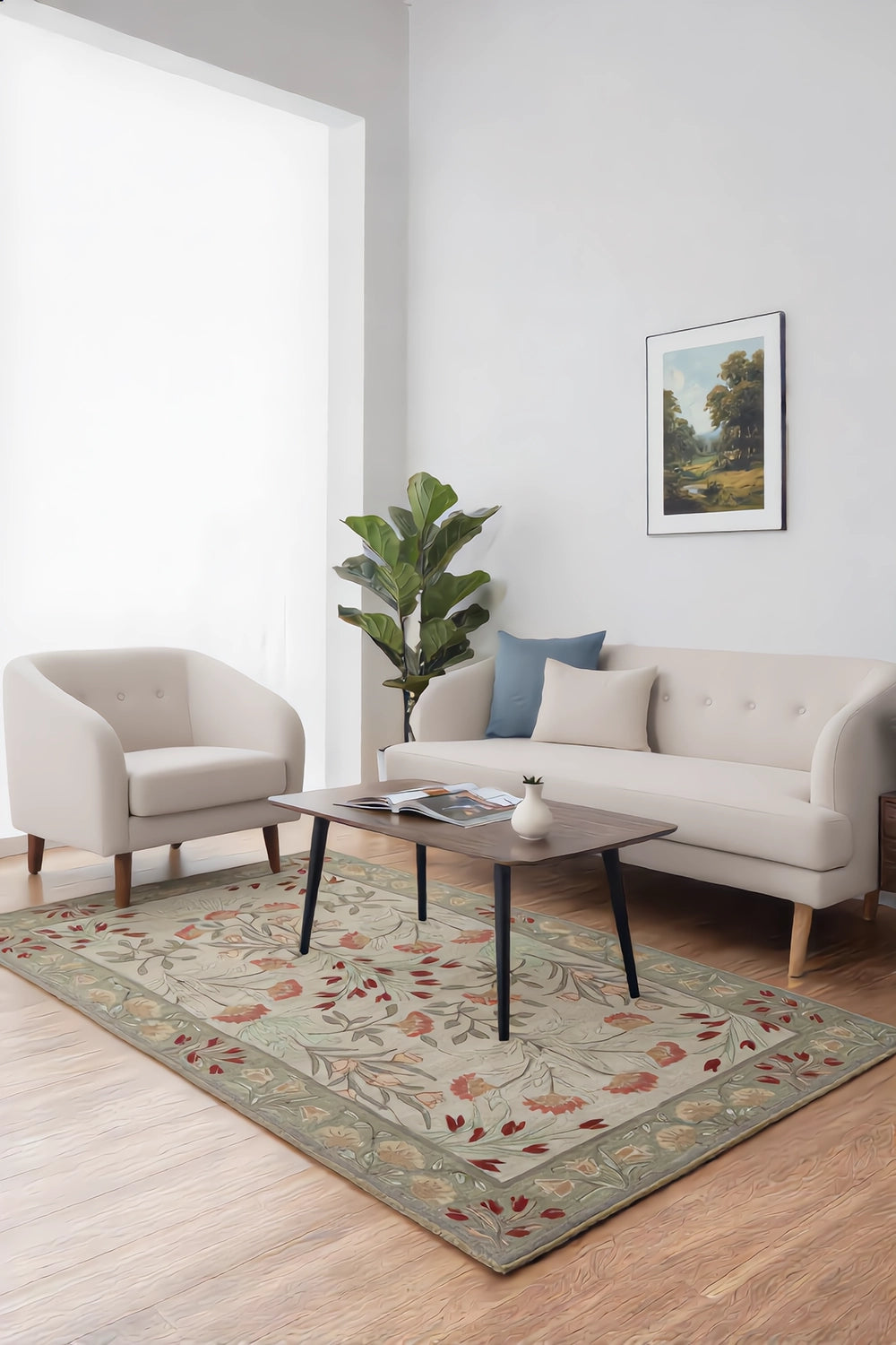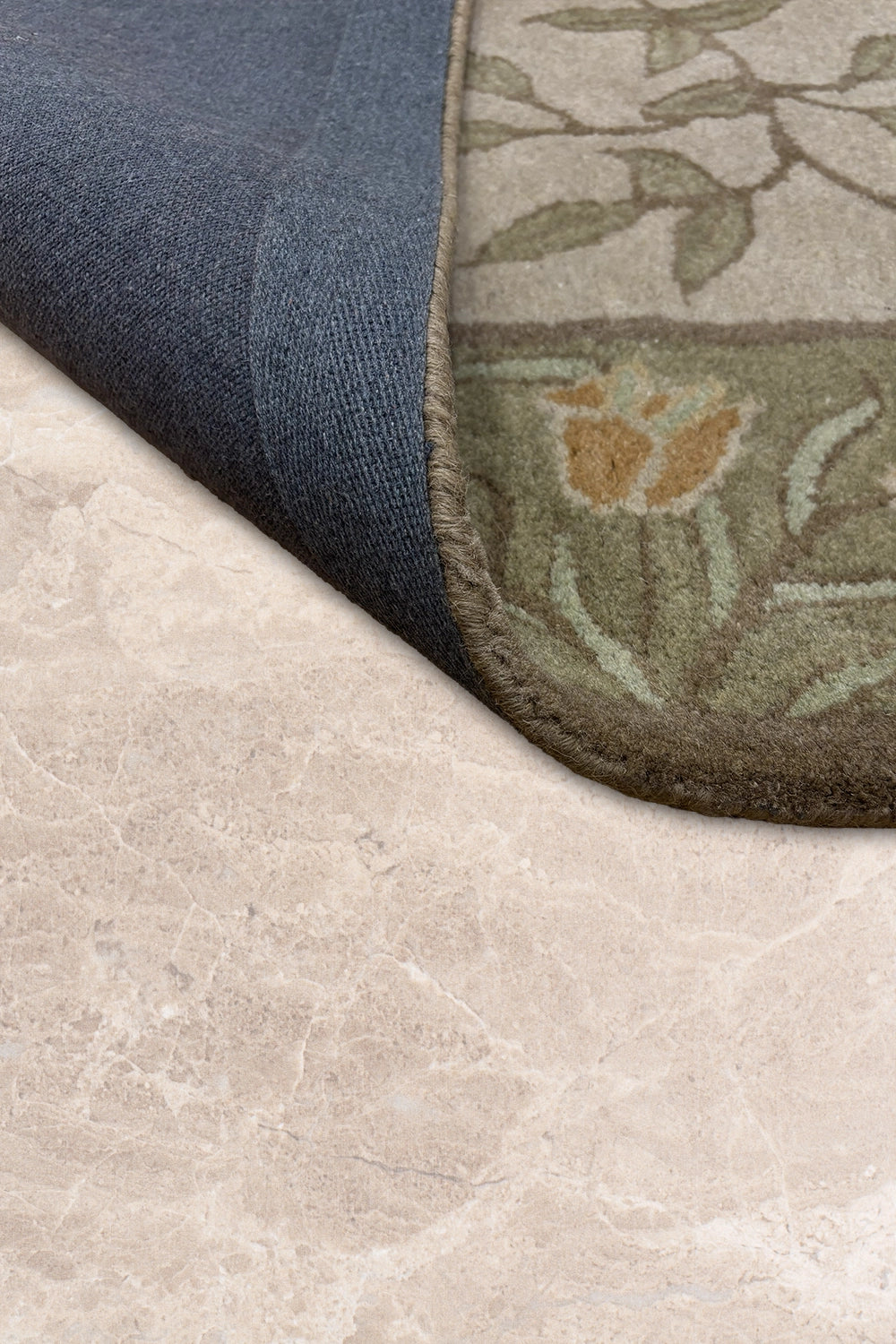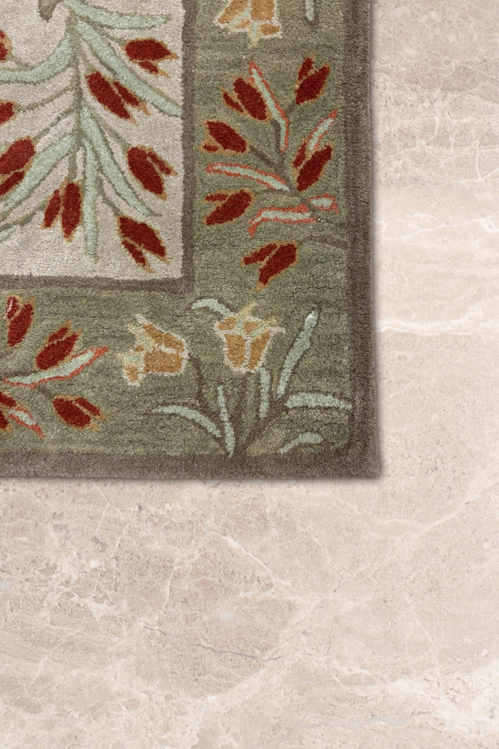 Hand-tufted in wool with a plush, high pile, this rug offers a refined softness underfoot while showcasing intricate botanical detailing. The muted palette and classic border framing make it a timeless addition to living rooms and bedrooms that favour understated traditional design.