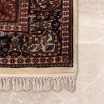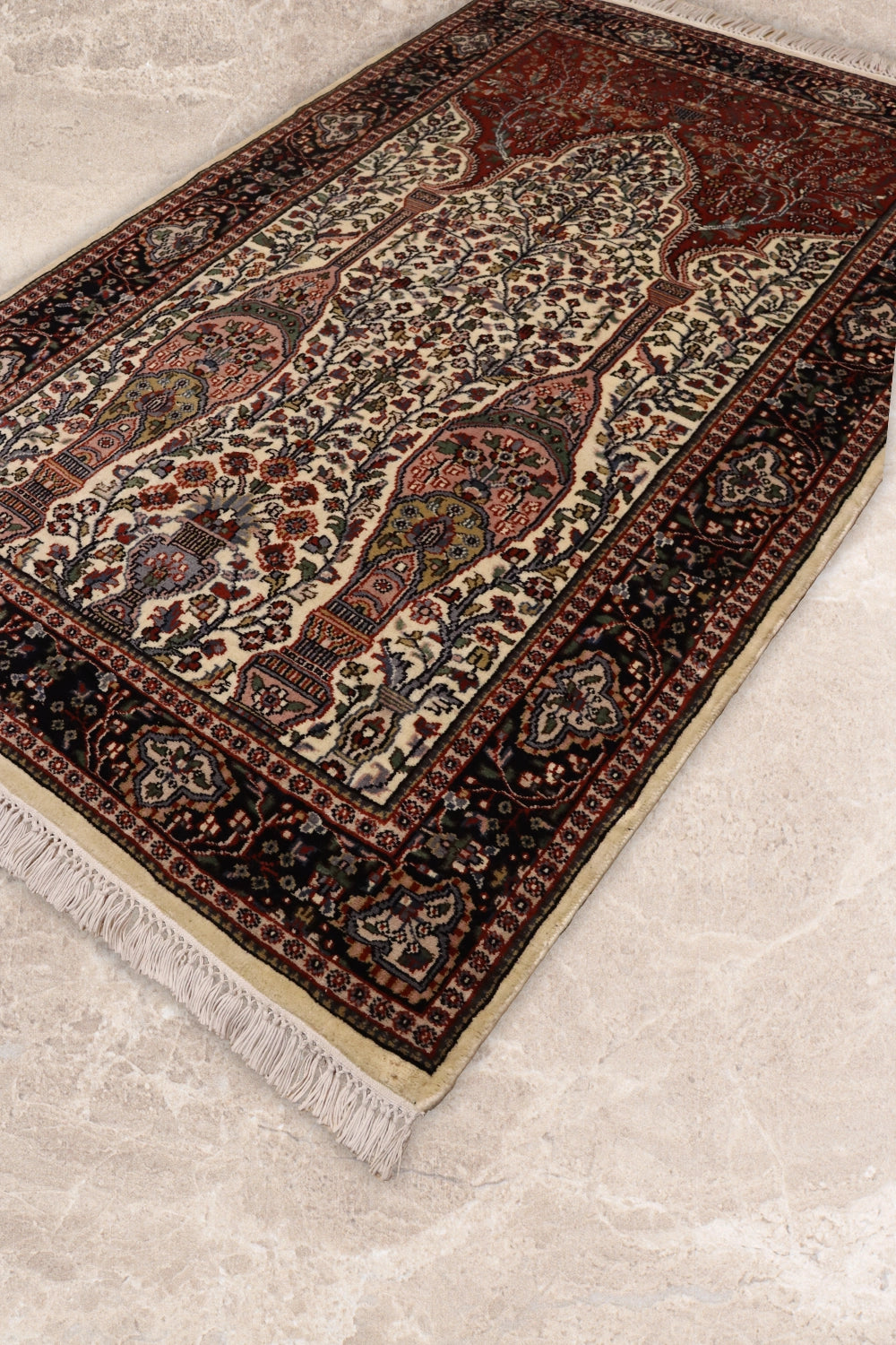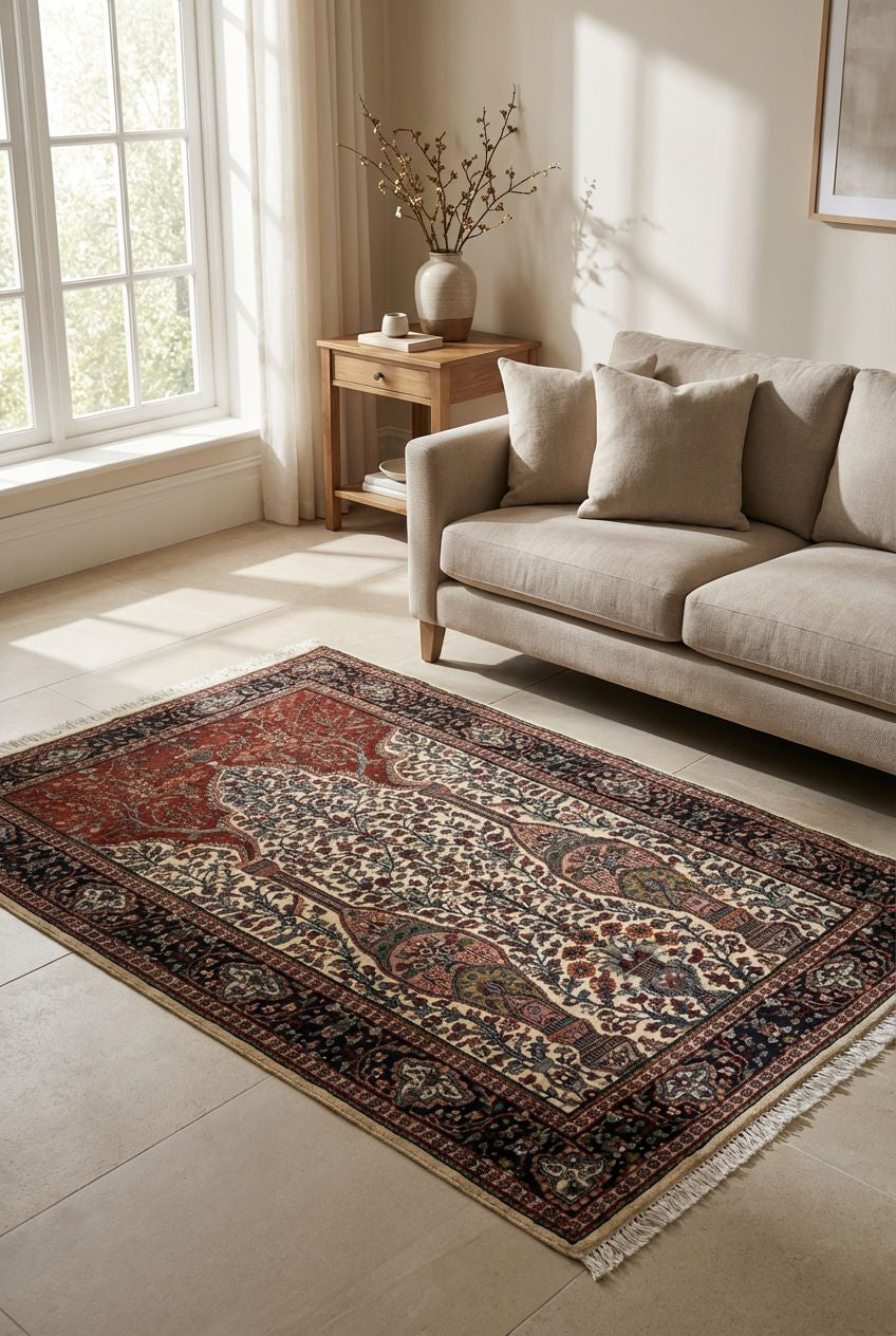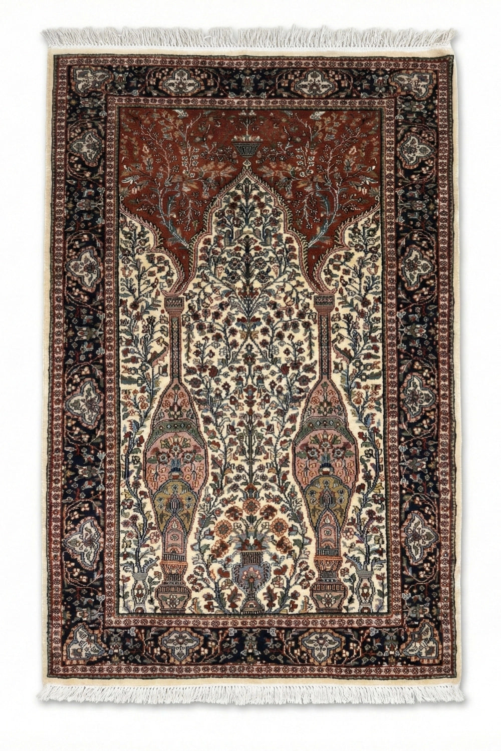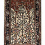 Khosrow reflects the poetic elegance of classical Oriental prayer-rug compositions, defined by its arched mihrab-inspired form and finely detailed floral motifs. Set against a warm rust field with a soft cream ground, the design evokes traditional Persian symbolism, where cypress trees and blooming vines represent life, balance, and spiritual harmony.