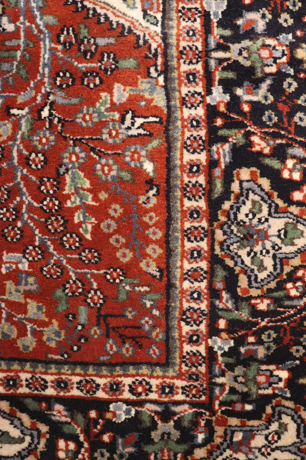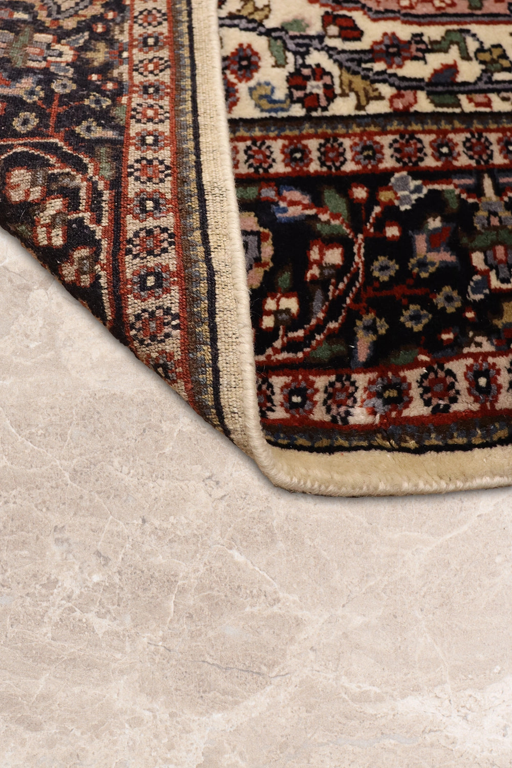 Hand knotted in wool, this rug offers a mild-soft feel with a medium pile that is both comfortable and enduring. Its rich yet balanced palette and vertical composition make it especially well-suited for intimate living spaces and bedrooms, where it adds character without overwhelming the room.