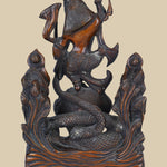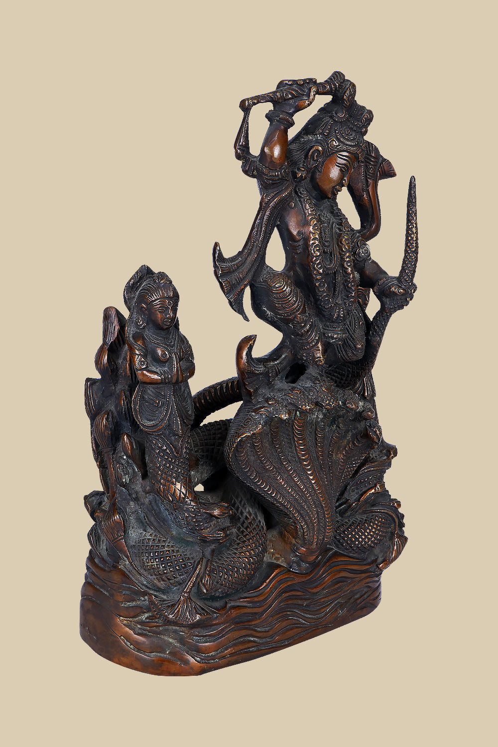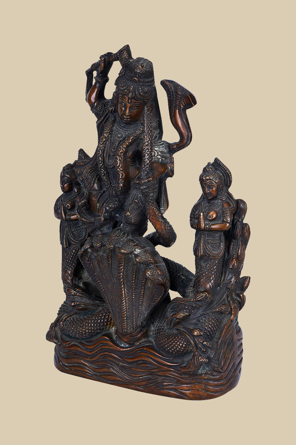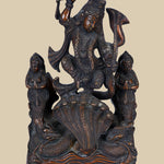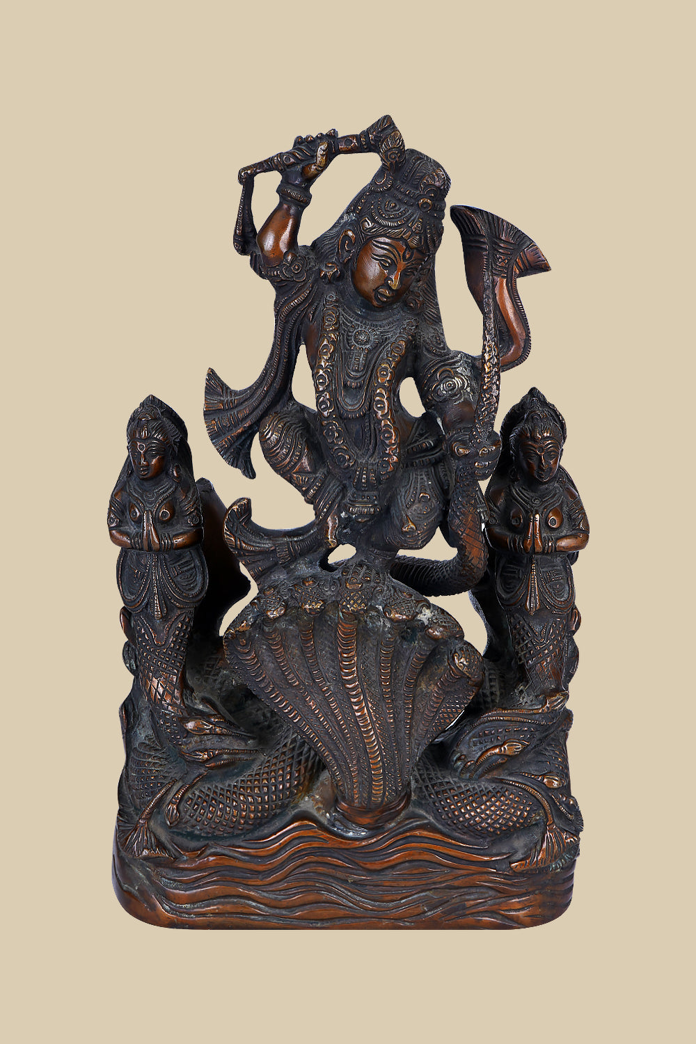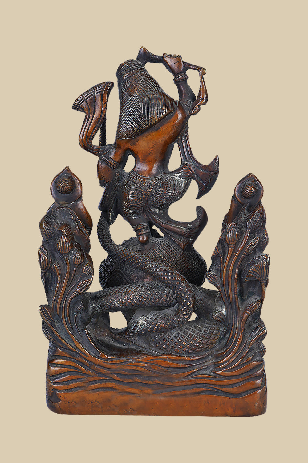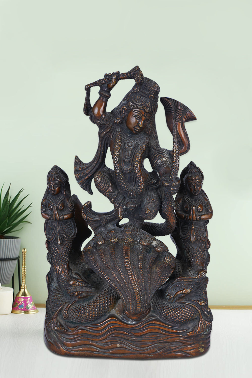 In this beautifully detailed statue, Krishna is depicted atop Kalia Naag (the big snake), surrounded by deities while he is in his victory pose. This 29 cm brass sculpture of Lord Krishna is a striking representation of the playful and divine qualities of one of Hinduism’s most beloved deities.The high-quality brass material imparts a lustrous sheen, emphasizing the fluidity of Krishna’s form. The delicate details in the design evoke a sense of movement and melody, making it clear why Krishna is known as the god of music, love, and compassion.