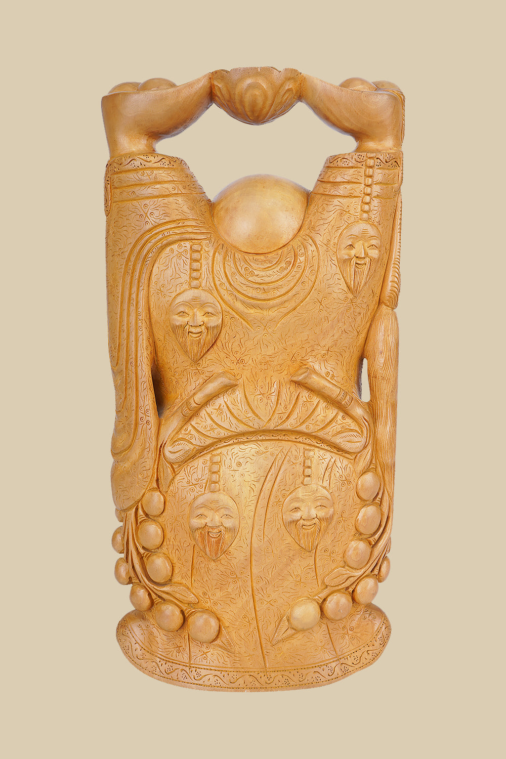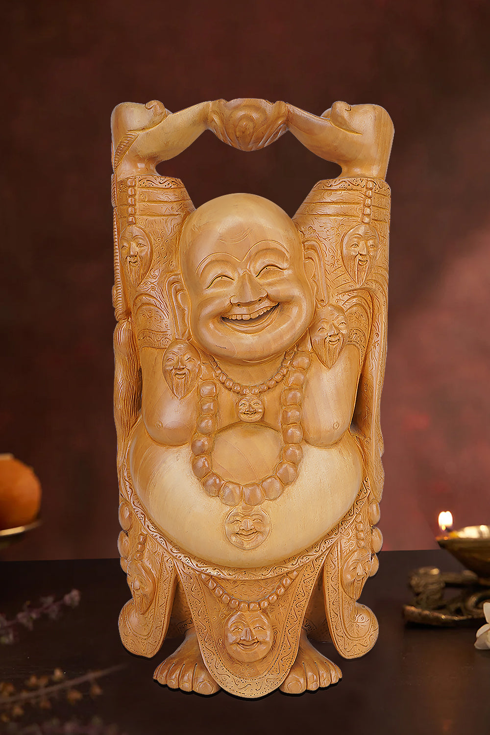 The Wooden Laughing Buddha statue (39 cm x 19 cm x 11 cm) is a delightful embodiment of joy, abundance, and prosperity. Hand-carved from richly grained wood, this antique sculpture radiates a sense of happiness that is instantly infectious. The rounded form of the Laughing Buddha, with his serene smile and symbolic posture, reflects an age-old belief in positivity and well-being.