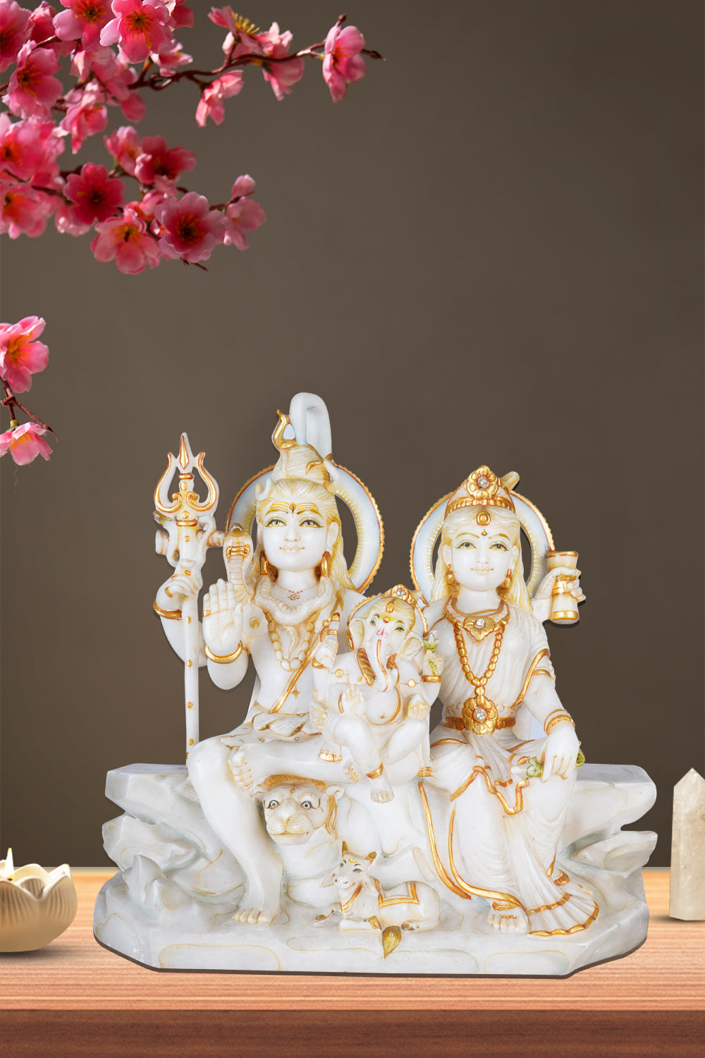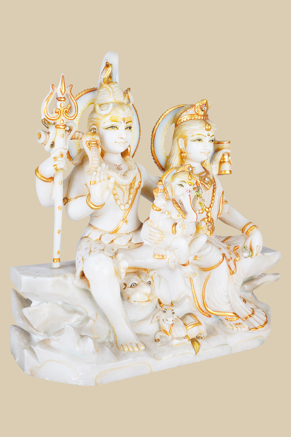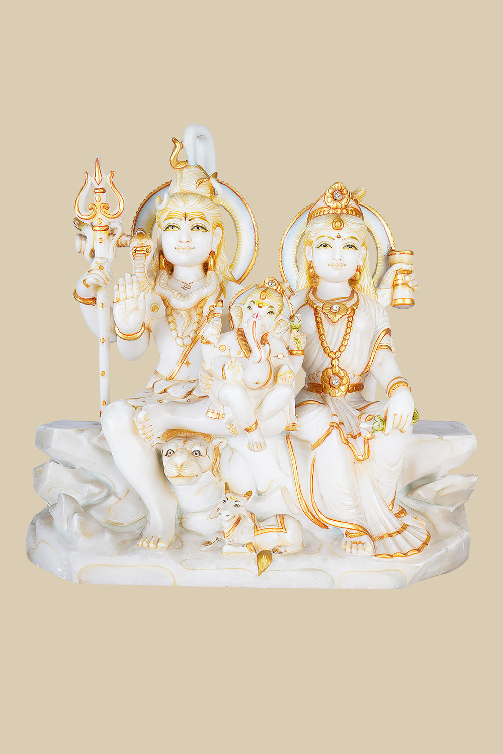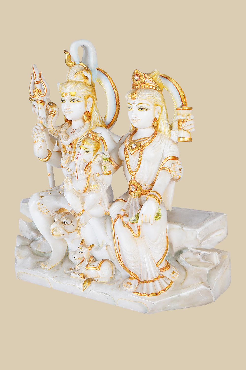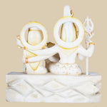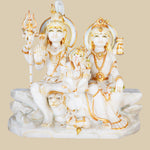 This is an intricate showcase of Shiva's Family, that symbolizes the essence of unity of family. Hand-carved from pure marble, this sculpture features Lord Shiva, Goddess Parvati, and their child Lord Ganesha seated together in serene harmony. One can also see Shiva’s ride (Nandi) and Parvati’s tiger in the frame too. The composition embodies familial love, cosmic balance, and the essence of divine blessings.