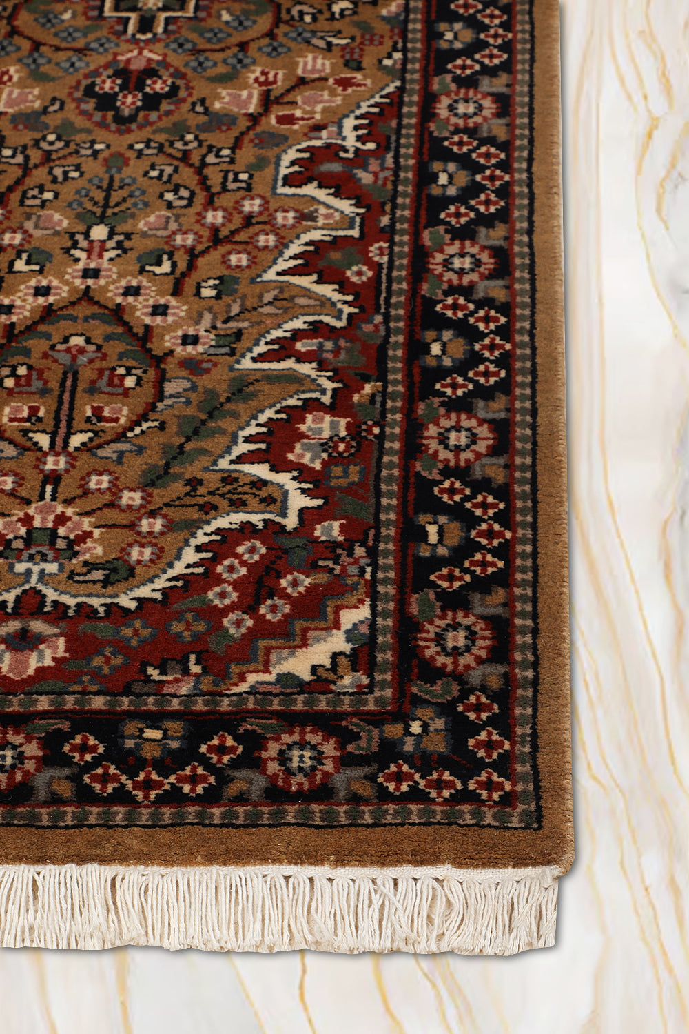 Transform your hallway with the Marvora rug, a timeless piece from our Virasat Collection that blends traditional elegance with modern utility. This 2 x 6 ft wool runner, handknotted with a medium pile and mild soft texture, features intricate oriental patterns in rich rust ochre, warm chestnut hue, and hints of soft taupe. Its design draws from Persian traditions, where medallion and floral motifs symbolized prosperity and protection since ancient times, often woven into rugs to reflect cultural heritage. These patterns, embodying narratives of abundance and resilience, spread through trade routes, influencing oriental styles with their enduring charm. The elongated shape makes it ideal for hallways seeking a touch of classic sophistication.