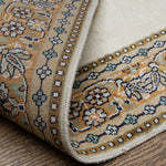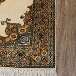 This Kirman design Indian carpet, steeped in a legacy of Persian artistry, is celebrated for its ornate detail and breathtaking symmetry. Sophistication emerges through a masterful play of cream and gold hues. Hand-knotted in soft silk with a low pile, this 2.6x4 rug transforms into more than a statement piece, a canvas of understated luxury.