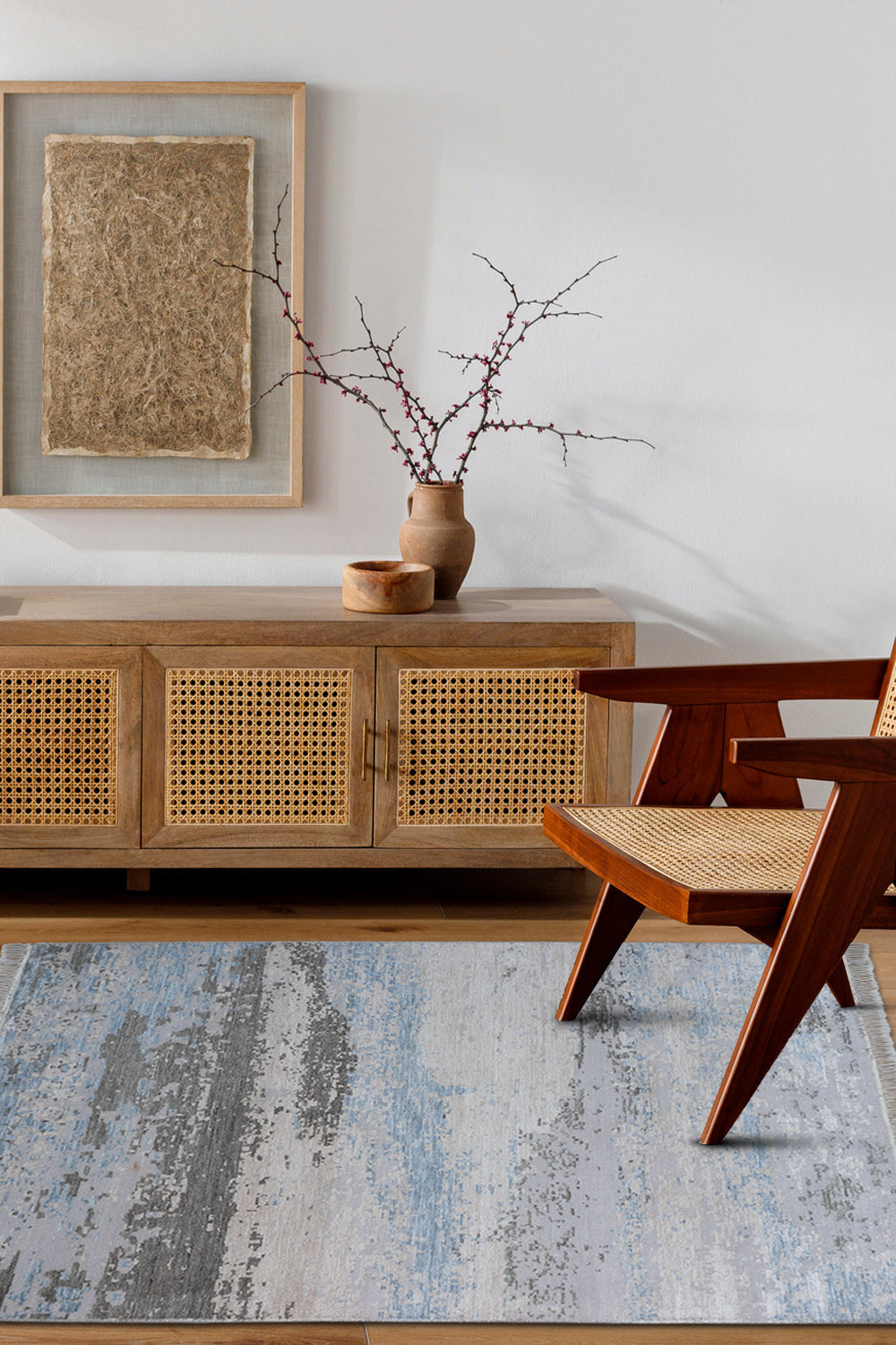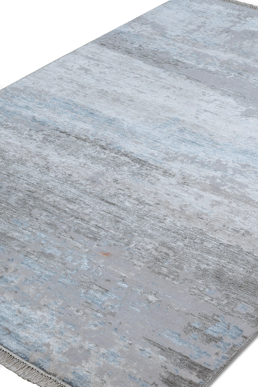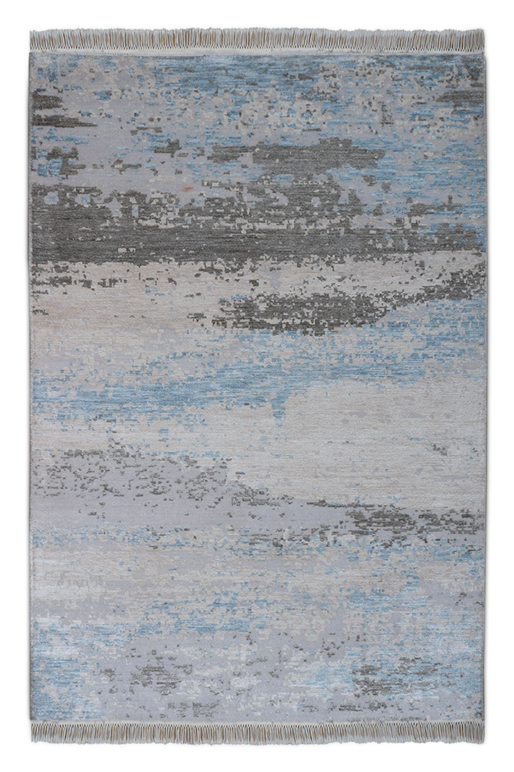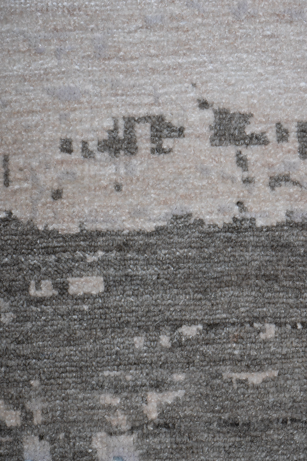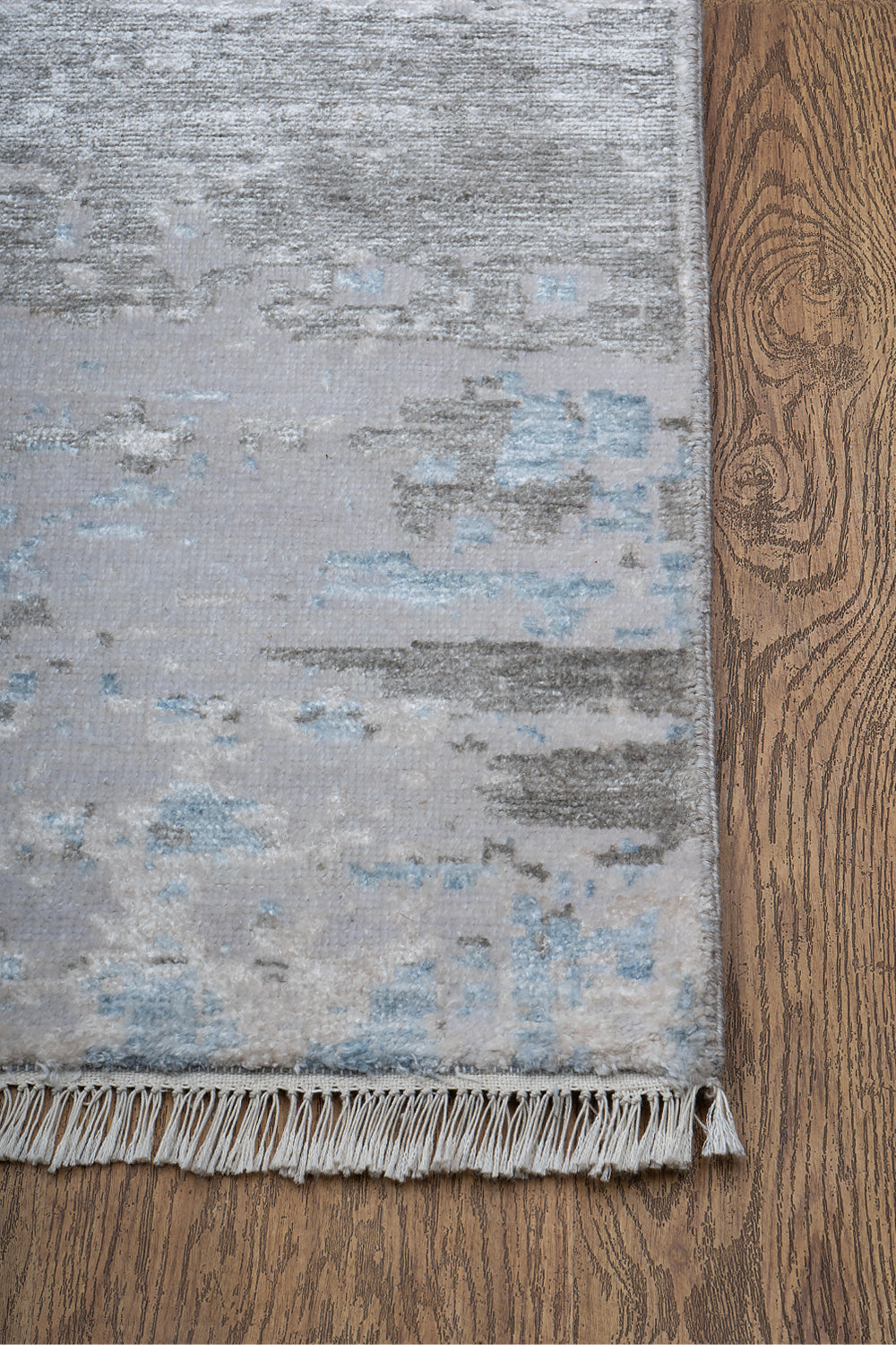 A world of sophistication at your feet. That’s the feeling you get with this luxurious rug from the Odyssey Collection. Doused in a palette of gray, white, and blue, this modern Indian rug holds abstract patterns that evoke a sense of fluidity and movement, like brushstrokes across a canvas.