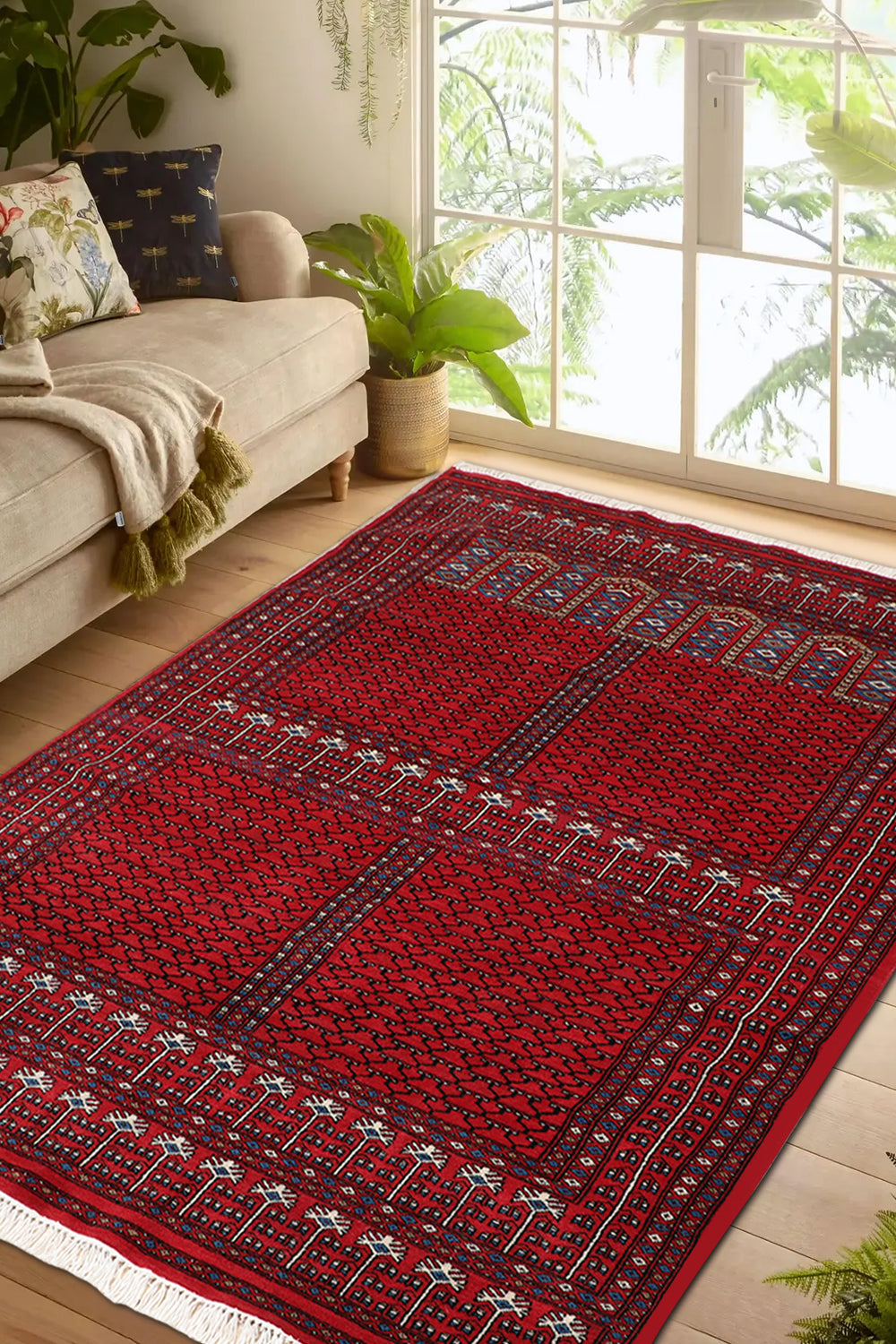 Add warmth to your space with the Nayyara rug, a finely handknotted piece from our Chahat Collection that blends traditional artistry with modern versatility. This 6 x 9 ft wool rug, featuring a medium pile with a mild soft texture, showcases intricate geometric and mihrab-like motifs in vibrant ribbon red, deep charcoal night, and hints of warm taupe. Its design reflects Persian and Central Asian weaving traditions, where such patterns symbolized spiritual guidance and protection since ancient times, often crafted into prayer rugs with mihrab arches pointing toward Mecca. These motifs, embodying cultural narratives of devotion and unity, spread through trade routes, influencing textile designs with their bold symmetry. The plush texture makes it ideal for living rooms or dining areas seeking a striking foundation.
