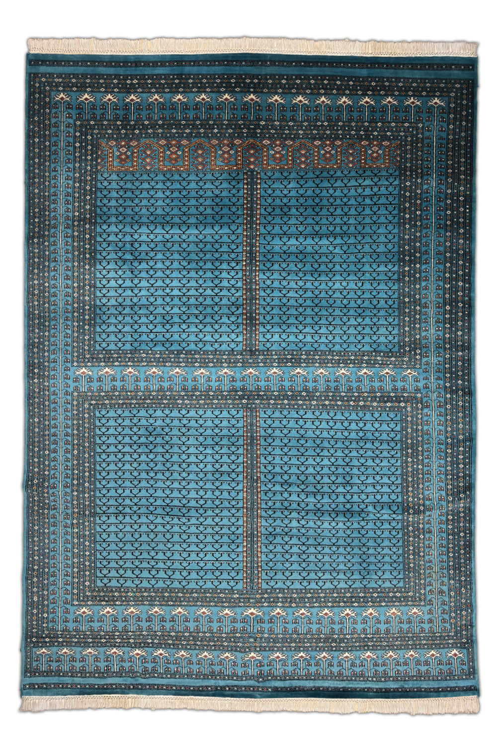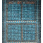 The Neelvat rug embodies quiet sophistication through its serene palette and disciplined geometry. Hand knotted in wool, it features repeating lattice motifs that flow across a luminous turquoise blue field — a composition that feels meditative yet deeply intricate. The delicate ivory accents and refined border patterns draw the eye inward, reflecting centuries of craftsmanship distilled into contemporary poise.