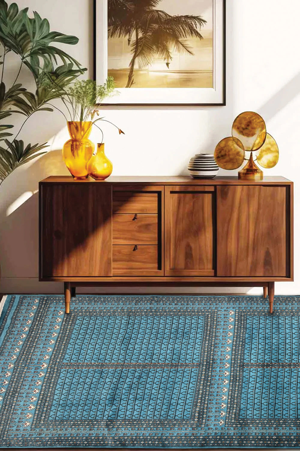 Both graceful and grounded, Neelvat transforms a room with its tranquil presence. The blue tones evoke calm and depth, while the ivory brings light and clarity. Ideal for living areas or bedrooms, it adds understated luxury to modern and traditional spaces alike.
