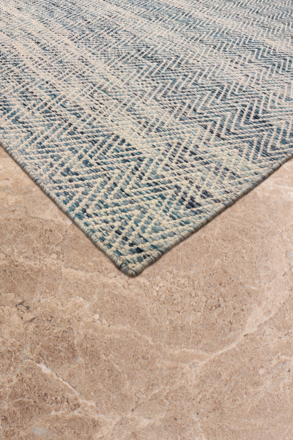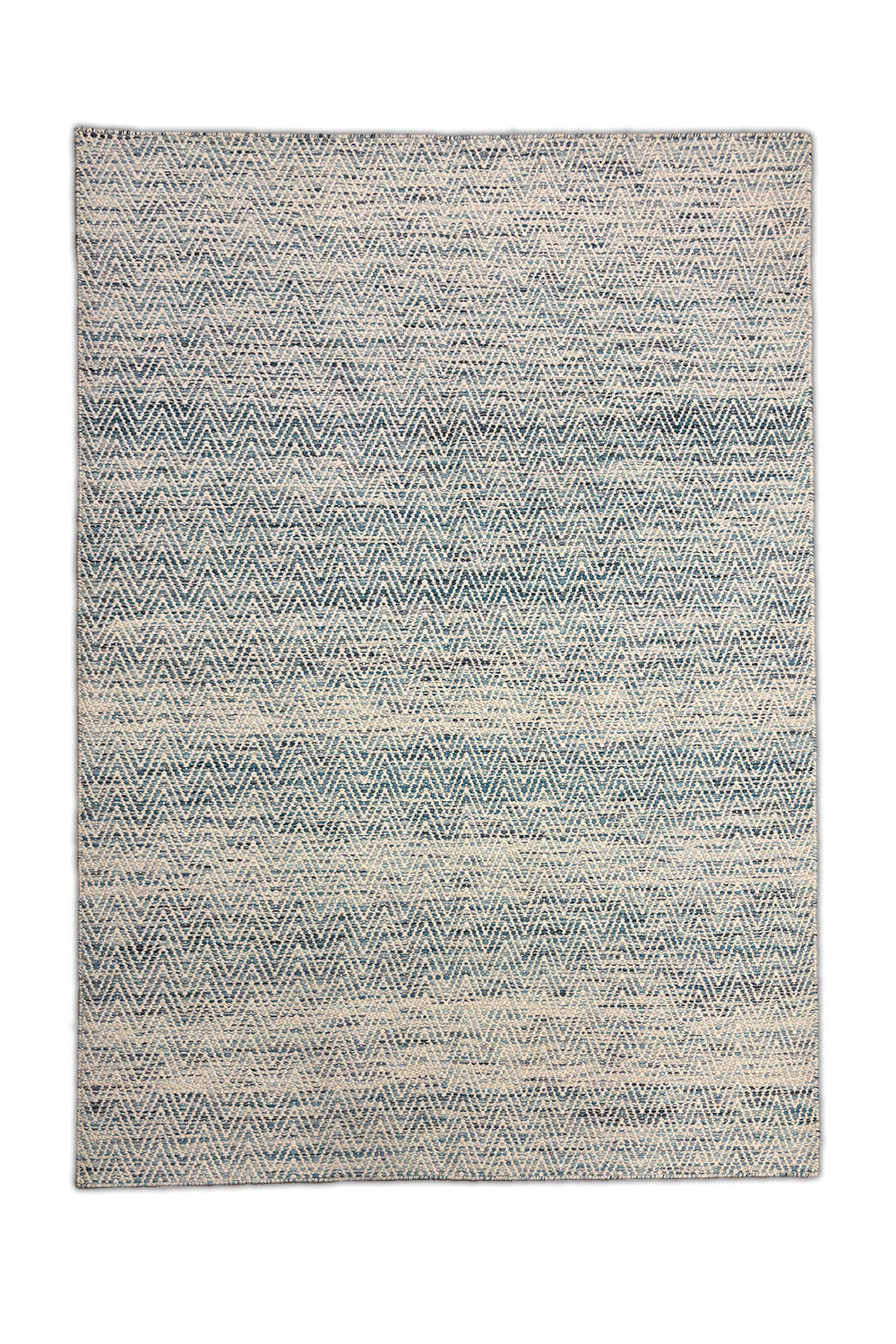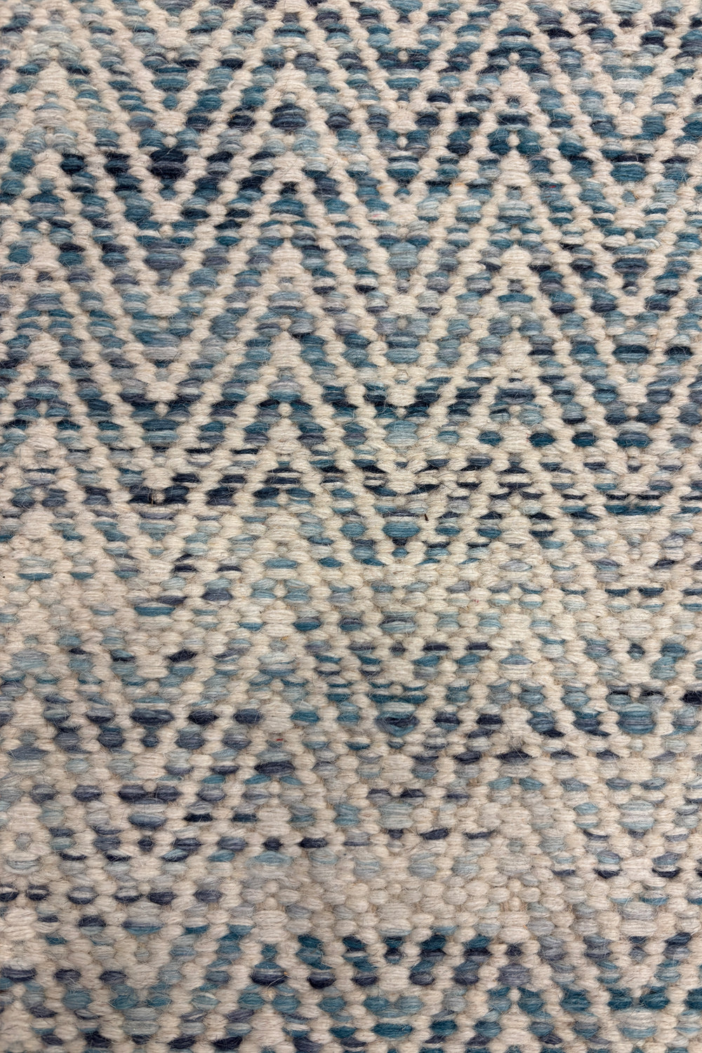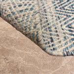 The Neer Kavya rug is a woven poem in blue and cream — soft waves of texture that rise and fall in rhythmic harmony. Handwoven in wool, its subtle chevron pattern feels both structured and fluid, echoing the calm repetition of ripples across still water.