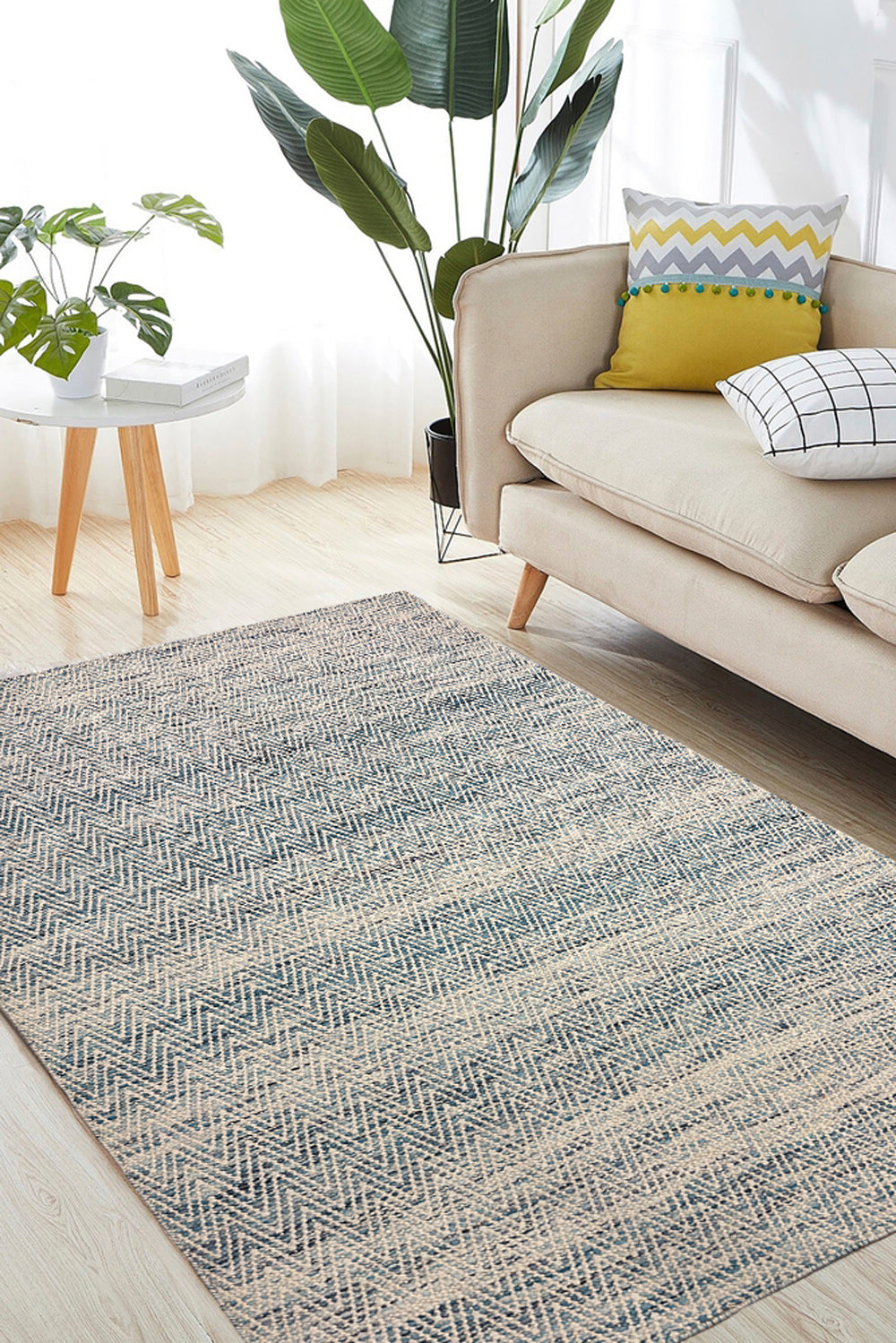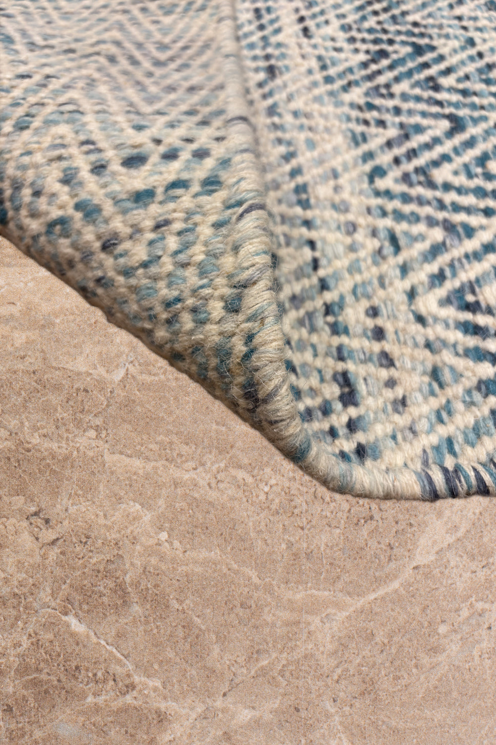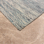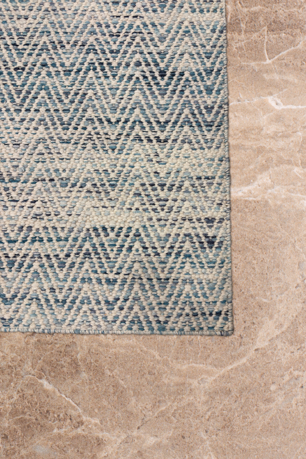 The Neer Kavya rug is a woven poem in blue and cream — soft waves of texture that rise and fall in rhythmic harmony. Handwoven in wool, its subtle chevron pattern feels both structured and fluid, echoing the calm repetition of ripples across still water.