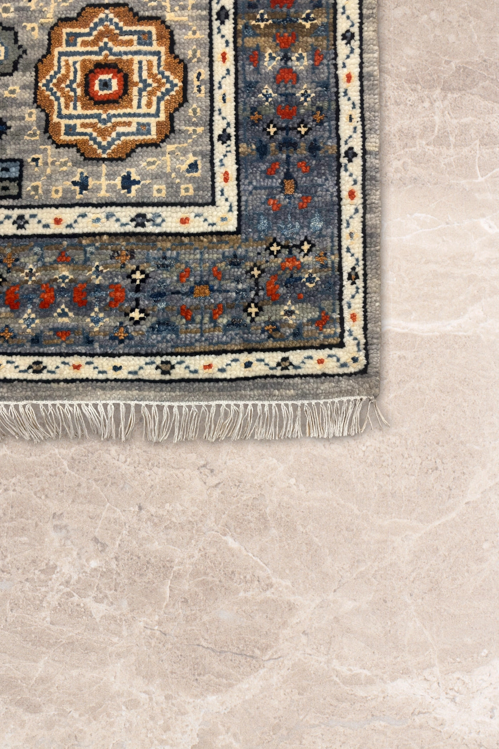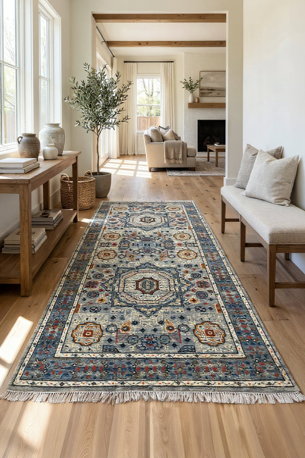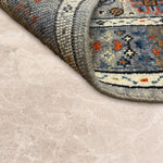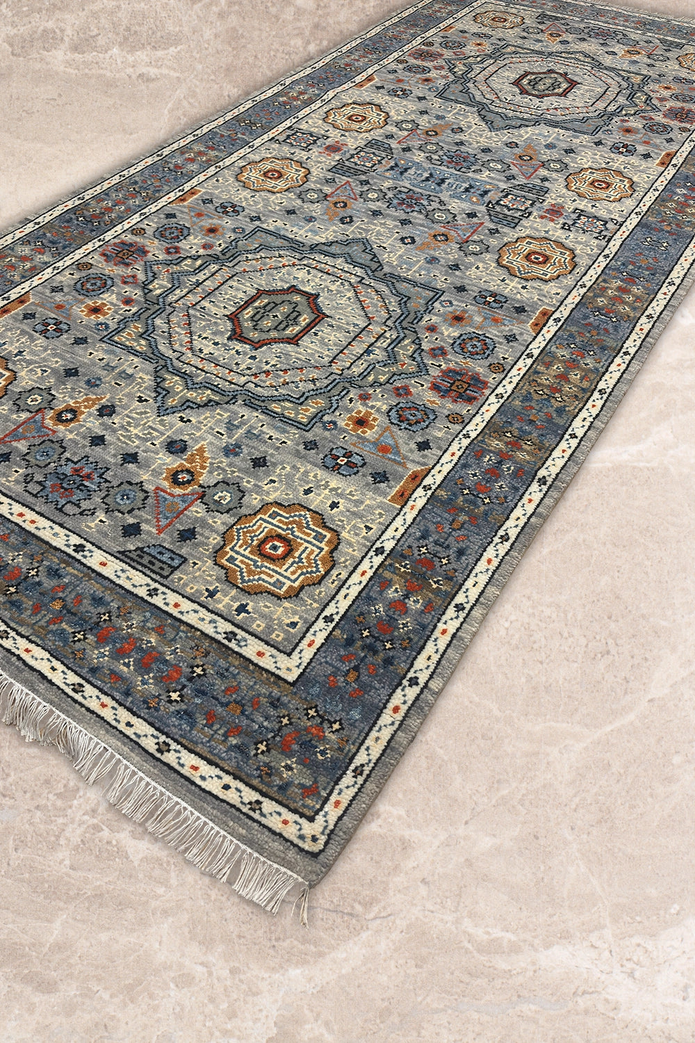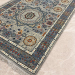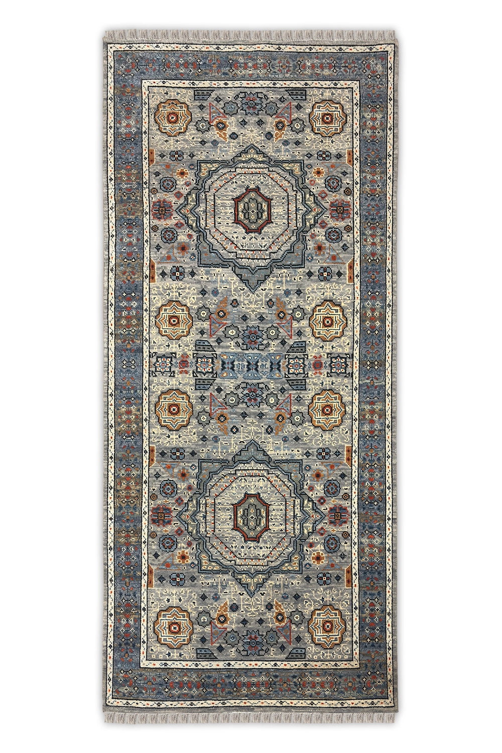 Rangrez-e-Raah is an elegant oriental runner defined by layered medallions and finely detailed geometric florals set against a calm grey ground. Accents of muted blue, ivory, and warm rust lend depth and movement, creating a design that feels intricate yet composed.