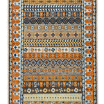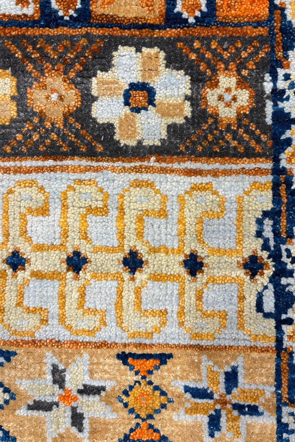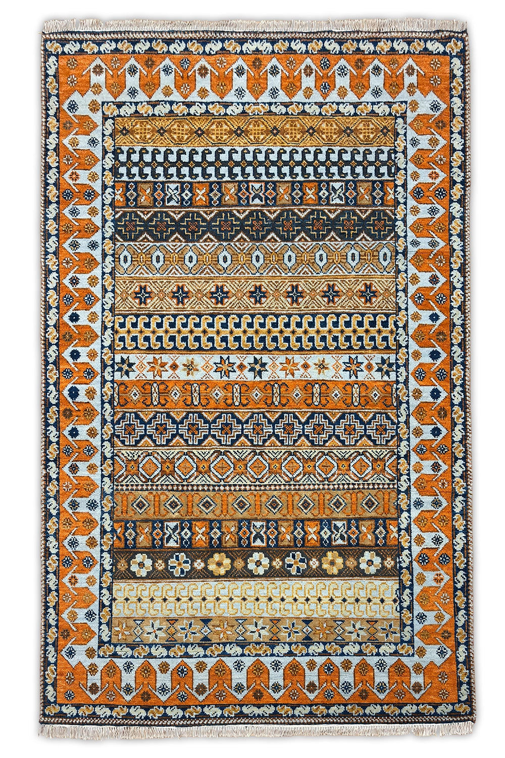 Rangrez is a traditional oriental rug defined by rhythmic bands of geometric motifs and a vibrant, folk-inspired symmetry. Layered rows of symbolic forms and stylised florals create a richly patterned surface, echoing the visual language of nomadic textiles while maintaining a refined, structured balance.