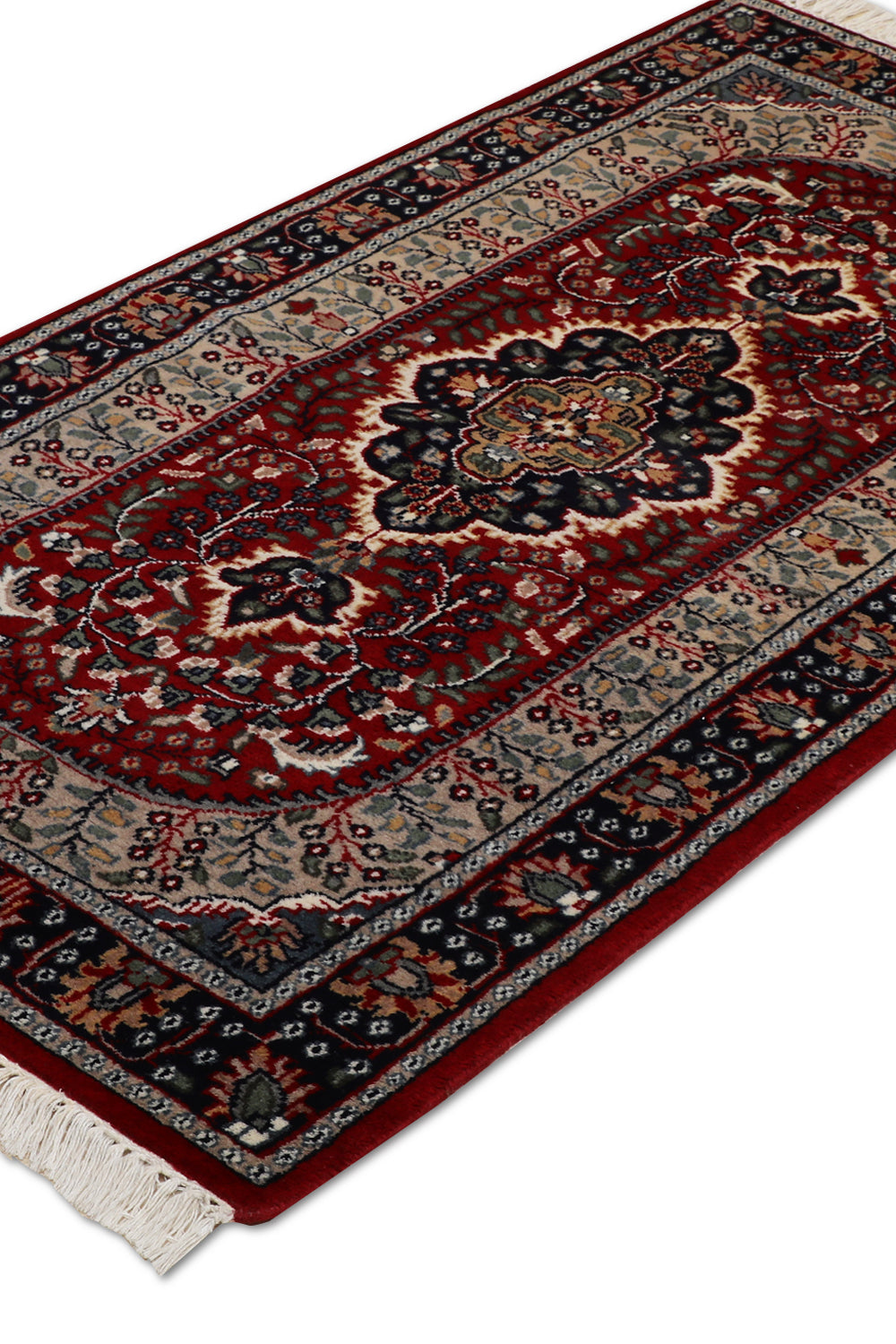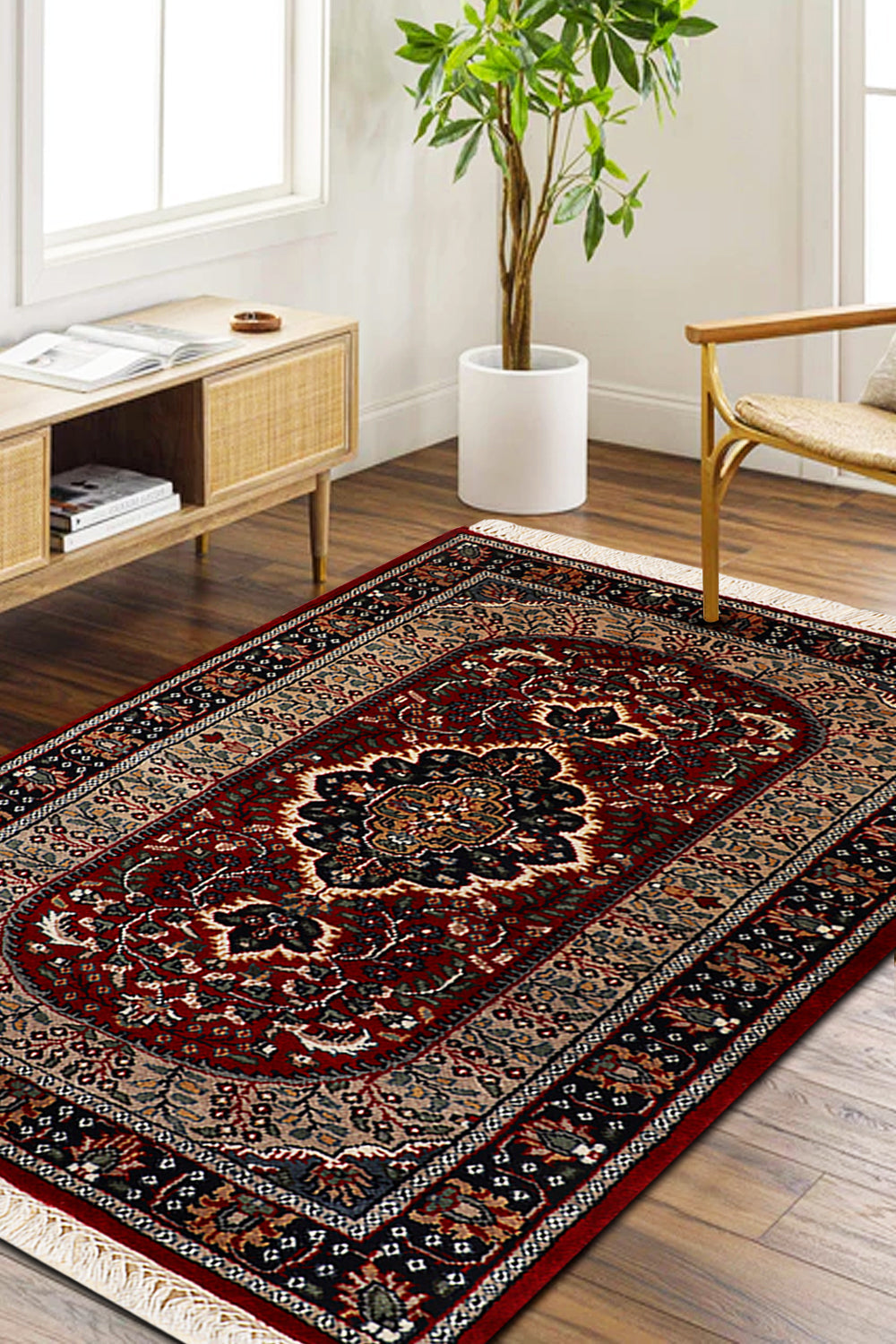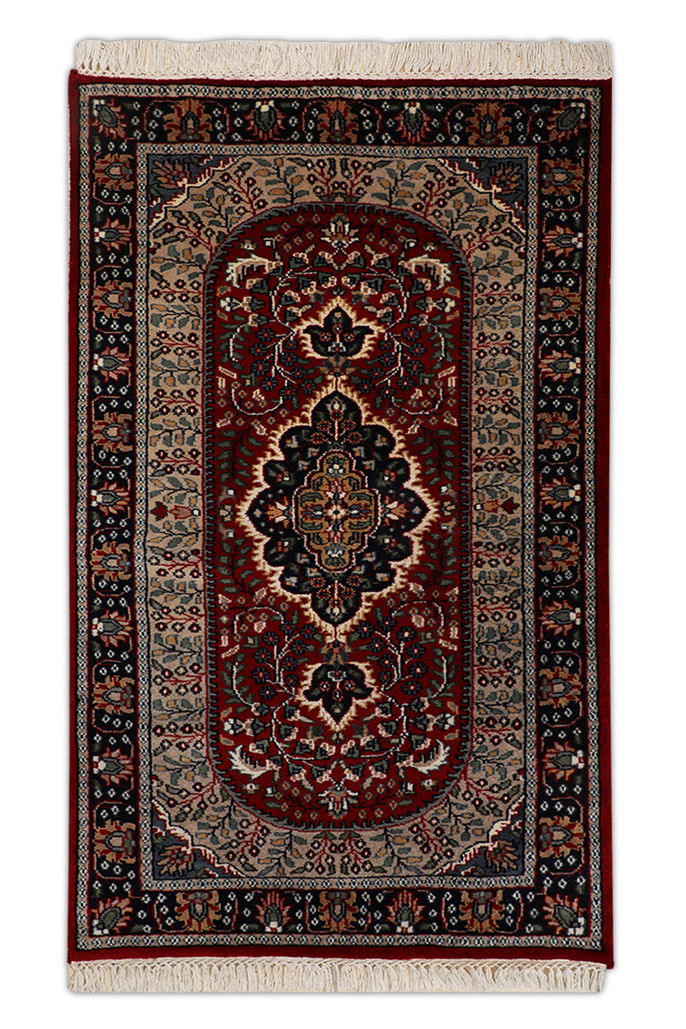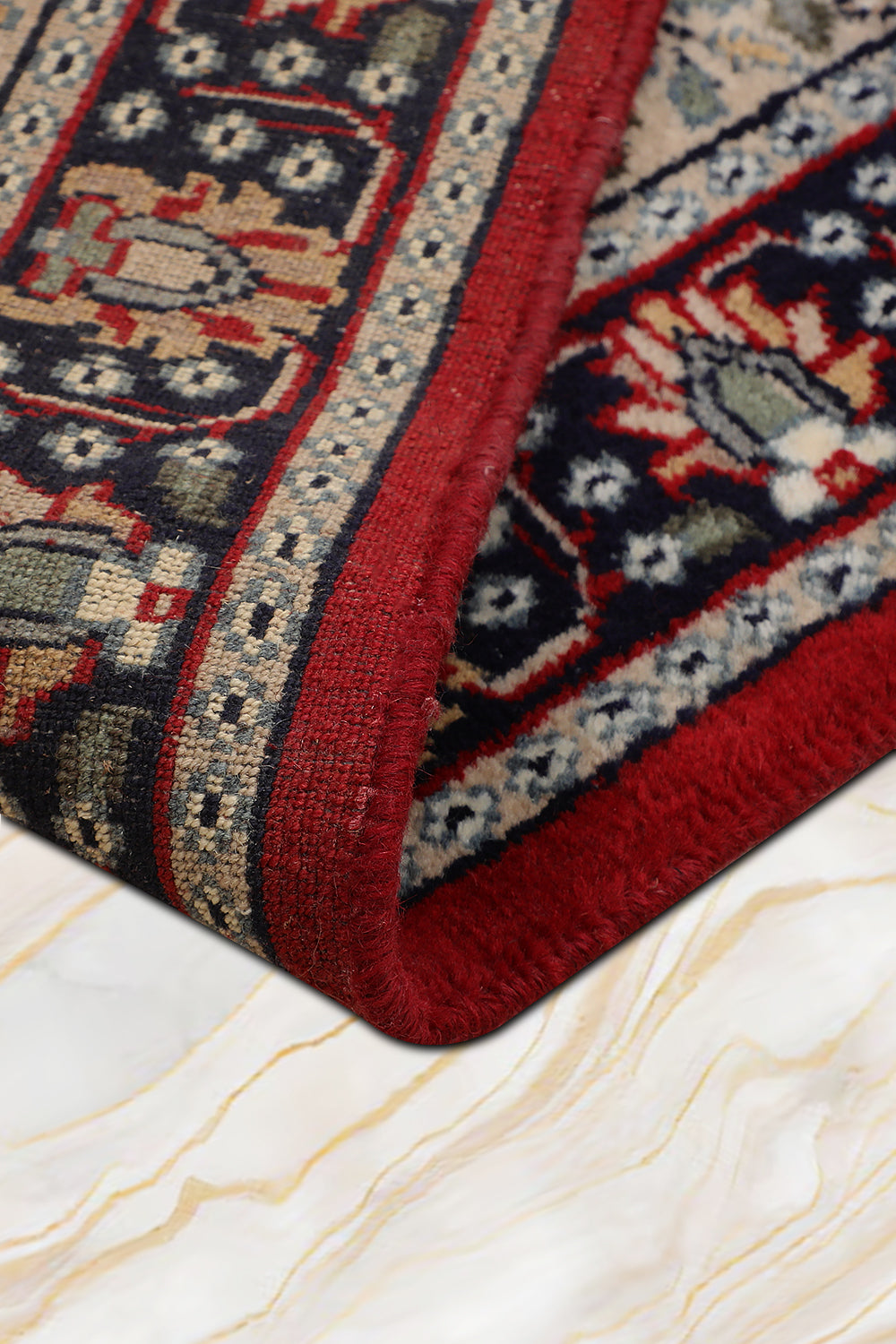 Add a touch of heritage to your space with the Rishaanah rug, a finely handknotted piece from our Virasat Collection that blends traditional beauty with modern versatility. This 3 x 5 ft wool rug, featuring a medium pile with a mild soft texture, showcases intricate floral and medallion motifs in deep maroon glow, rich sapphire shade, and hints of warm taupe. Its design reflects Persian weaving traditions, where such patterns symbolized abundance and spiritual serenity since ancient times, often crafted into Oriental rugs to evoke garden paradises. These motifs, embodying cultural narratives of harmony and eternity, spread through trade routes, influencing textile arts with their timeless appeal. The plush texture makes it ideal for smaller living rooms or bedrooms seeking a classic accent.