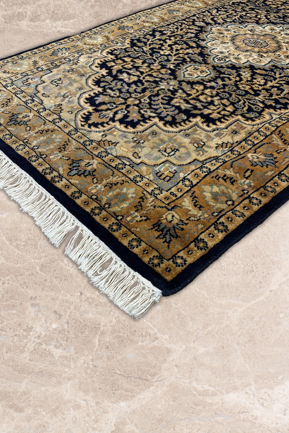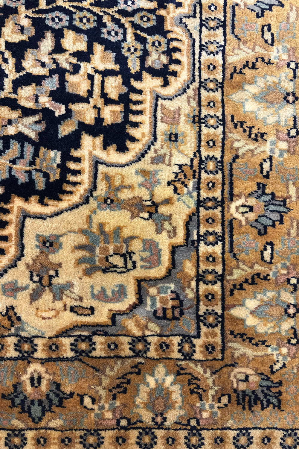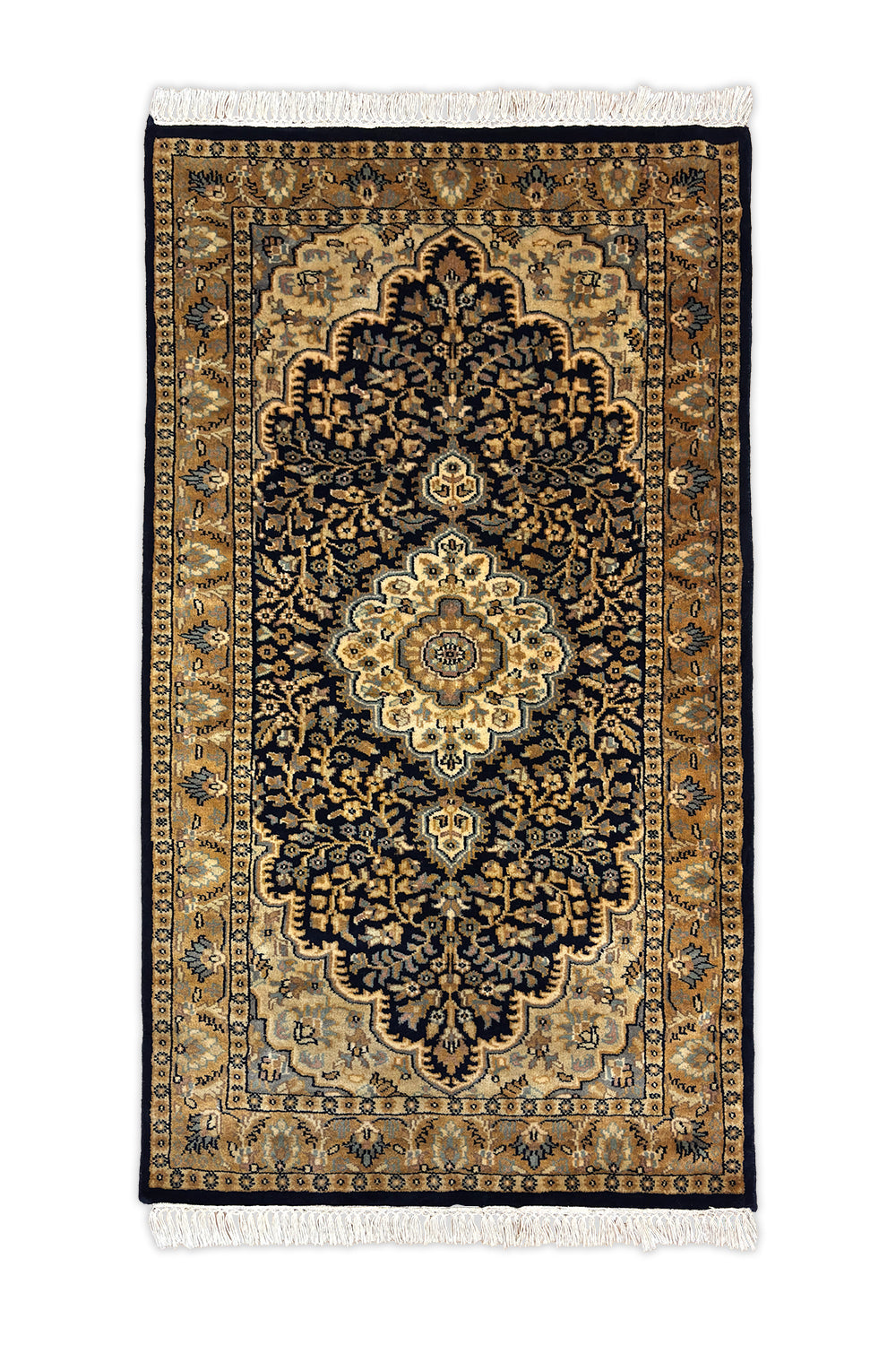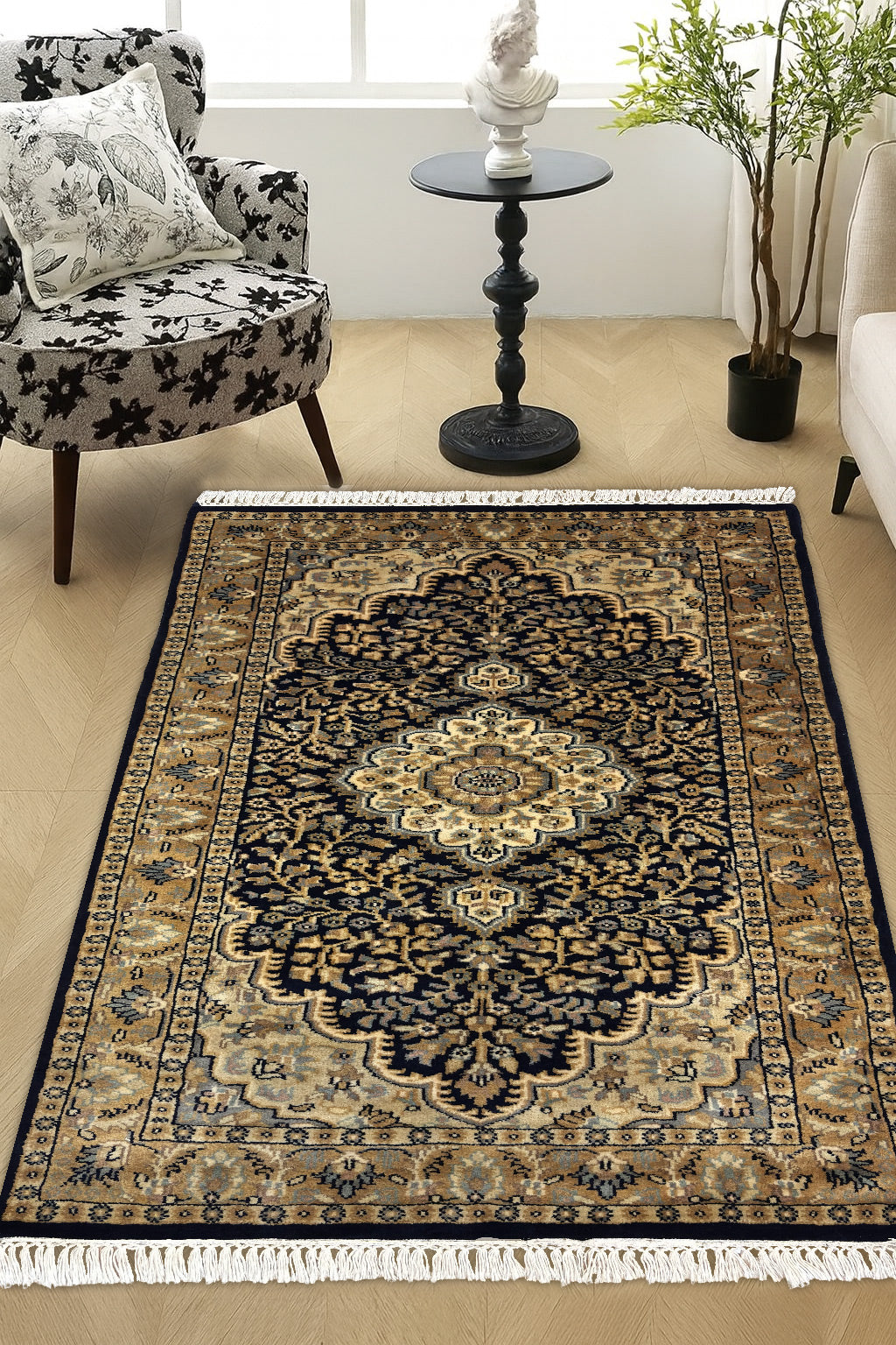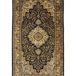 The Safa-Nargis rug is a tribute to classic Oriental elegance, centred around an intricate floral medallion framed by layered borders. Deep navy and brown tones form the foundation of the design, while soft ivory and muted beige highlights bring a sense of light and balance to the composition.