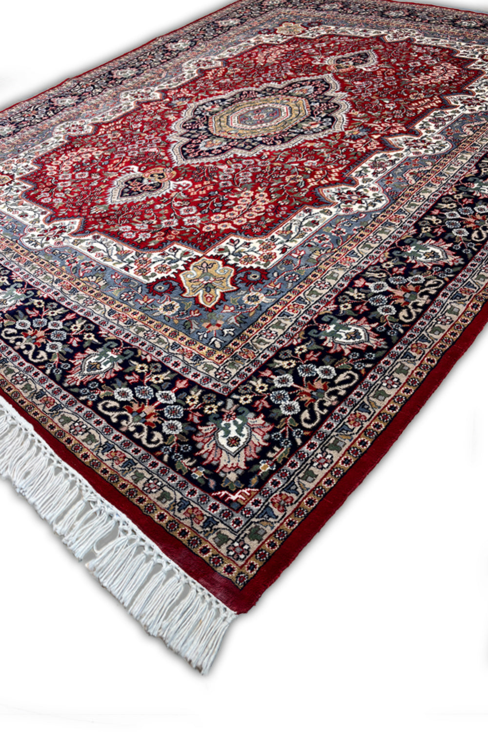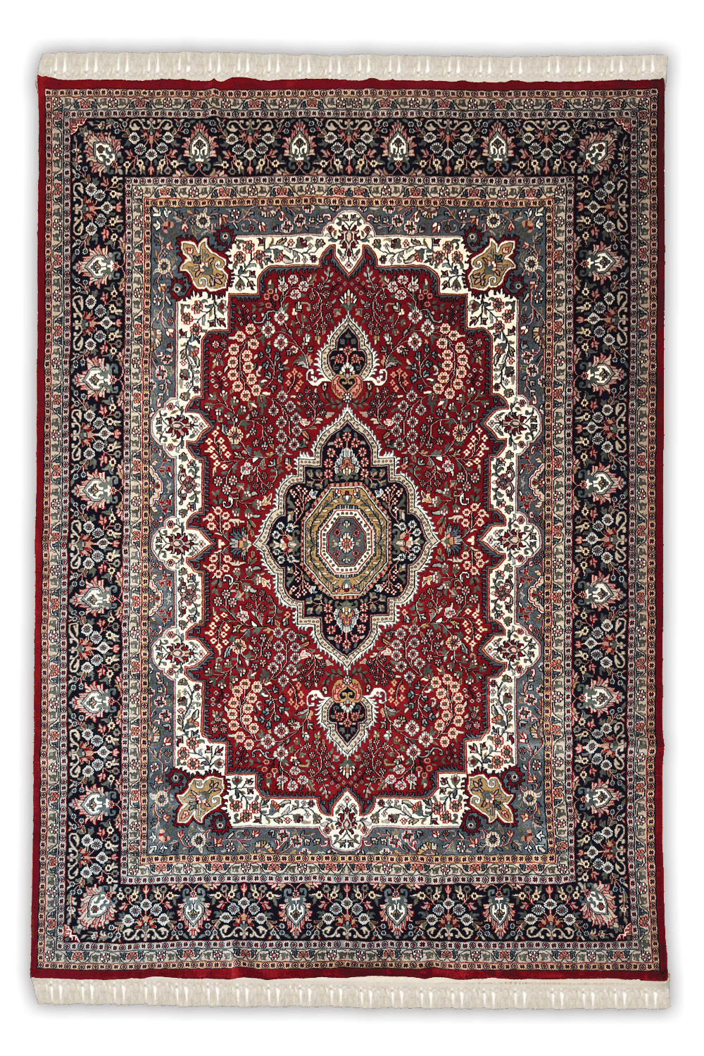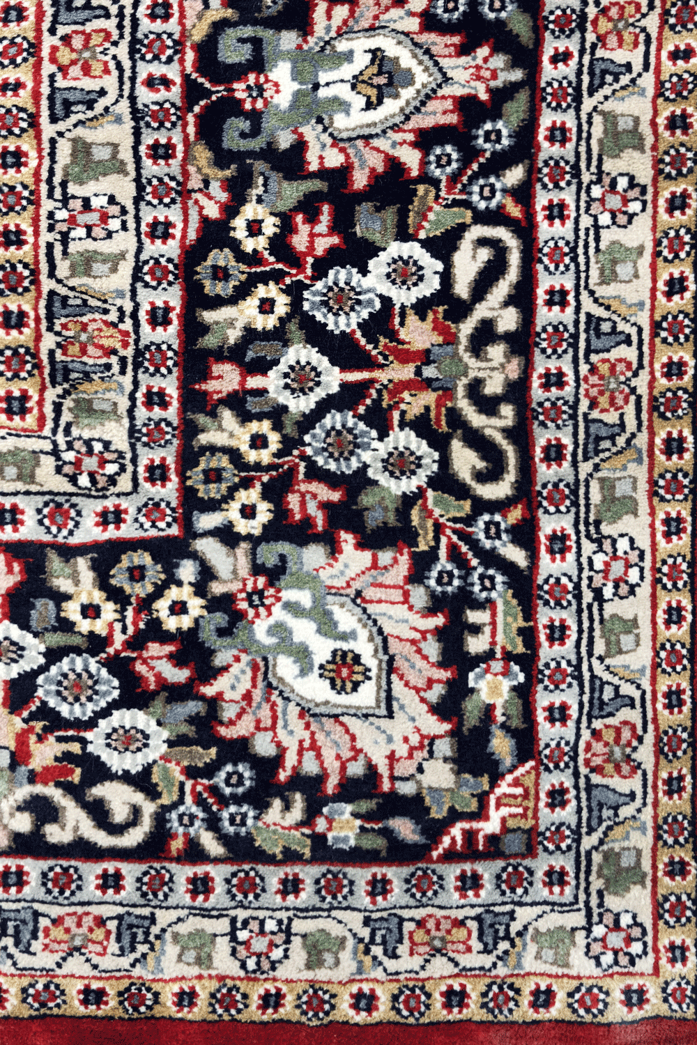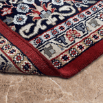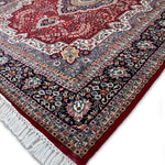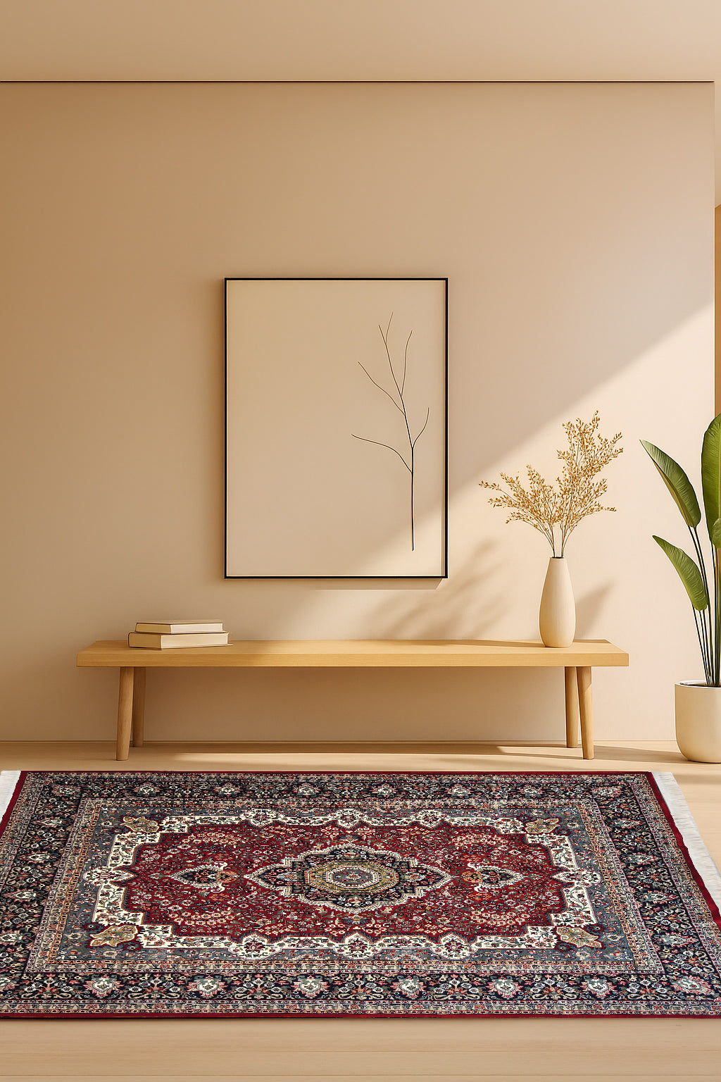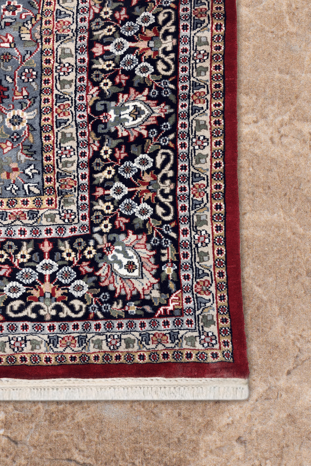 The Samira rug embodies timeless elegance with its deep crimson field and layered midnight blue borders. The intricate medallion design pays homage to classical Persian artistry, where bold contrasts and fine detailing create a sense of balance and refinement. Hand knotted in wool by master artisans, every knot speaks of patience, heritage, and craftsmanship passed down through generations.