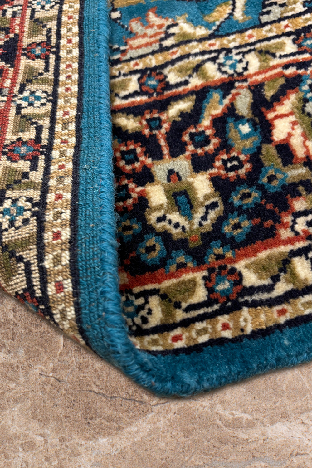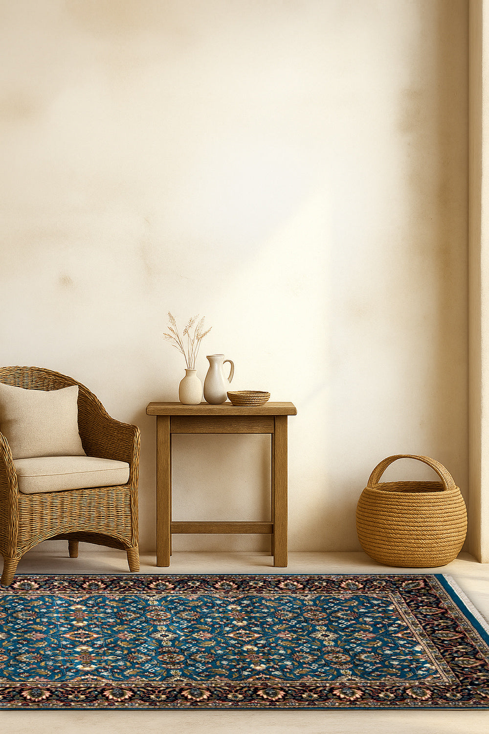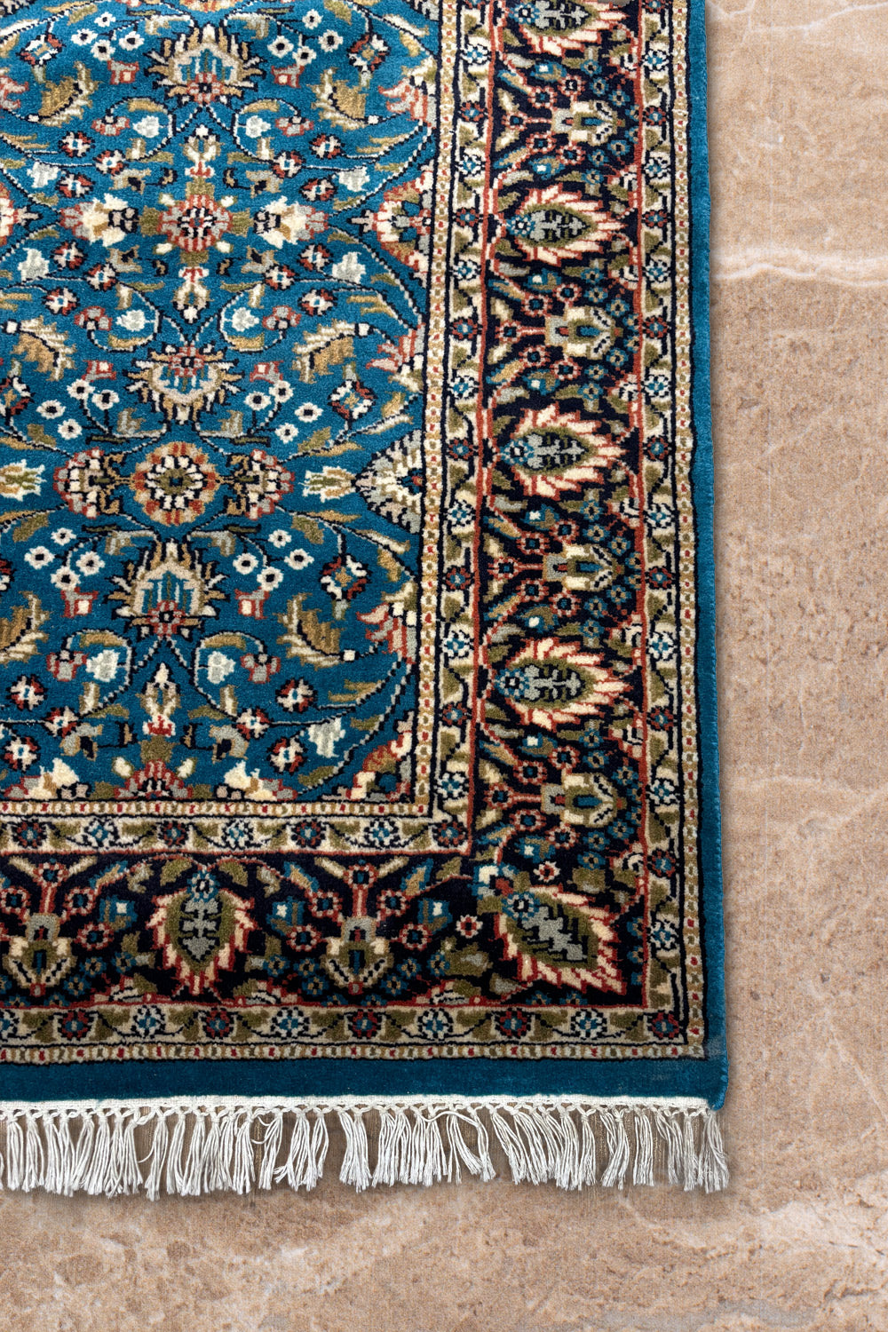 The Samudra rug is inspired by the vastness of the ocean, where teal waters shimmer under shifting light. Its detailed floral and geometric motifs seem to ripple like waves, creating a surface that feels endlessly alive. Crafted by hand in fine wool, it carries both strength and softness, perfect for grounding a space.