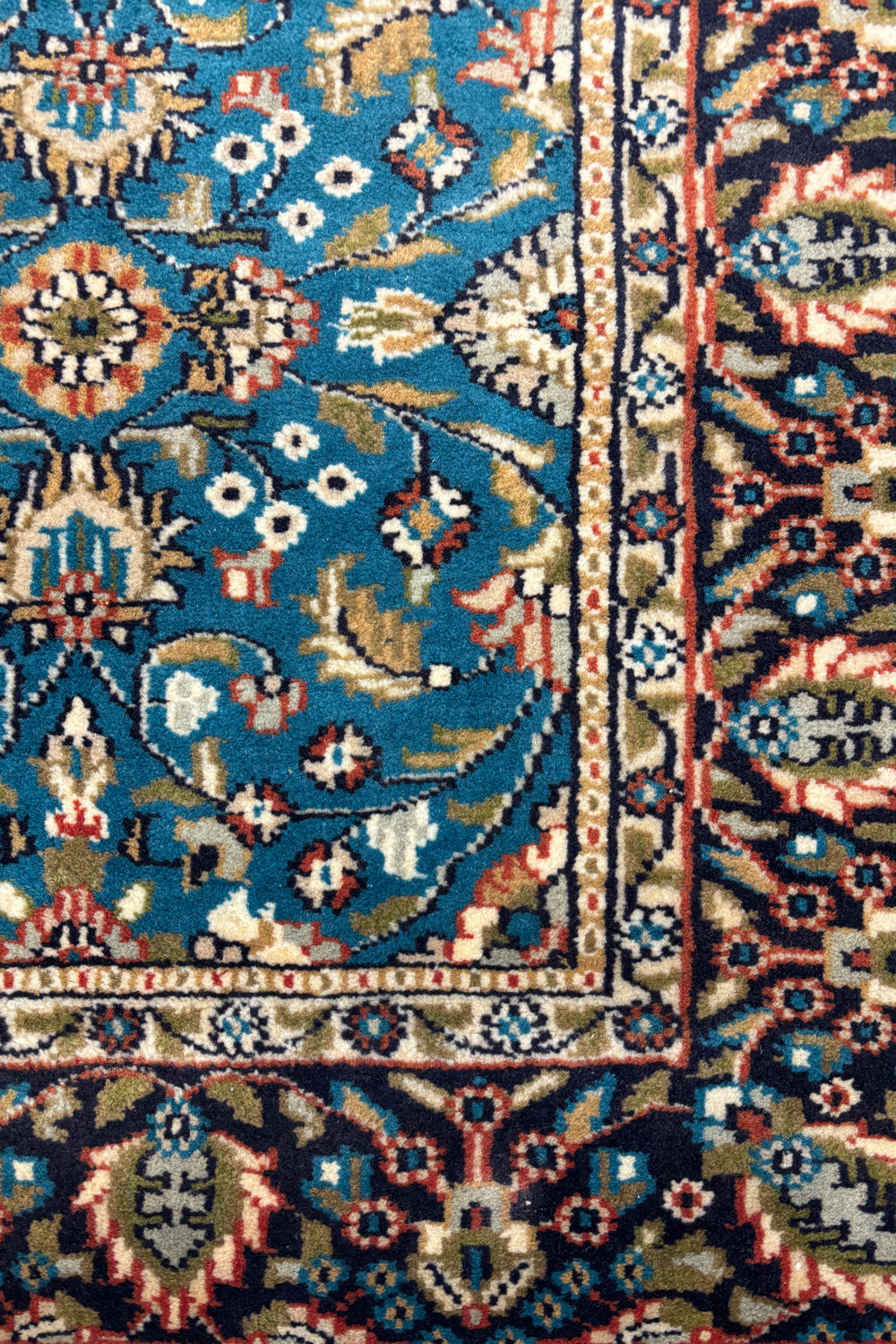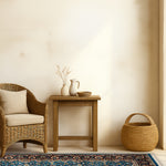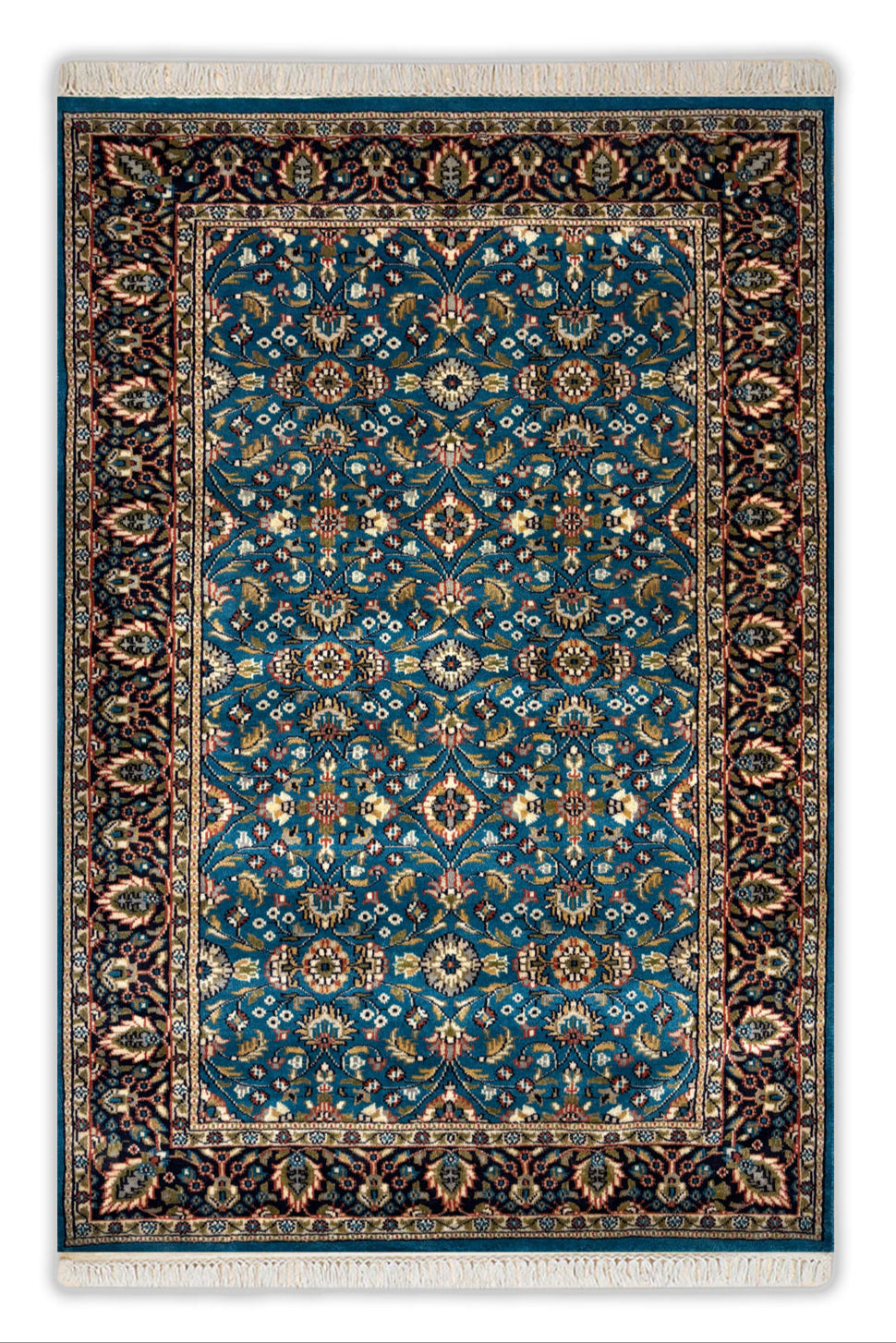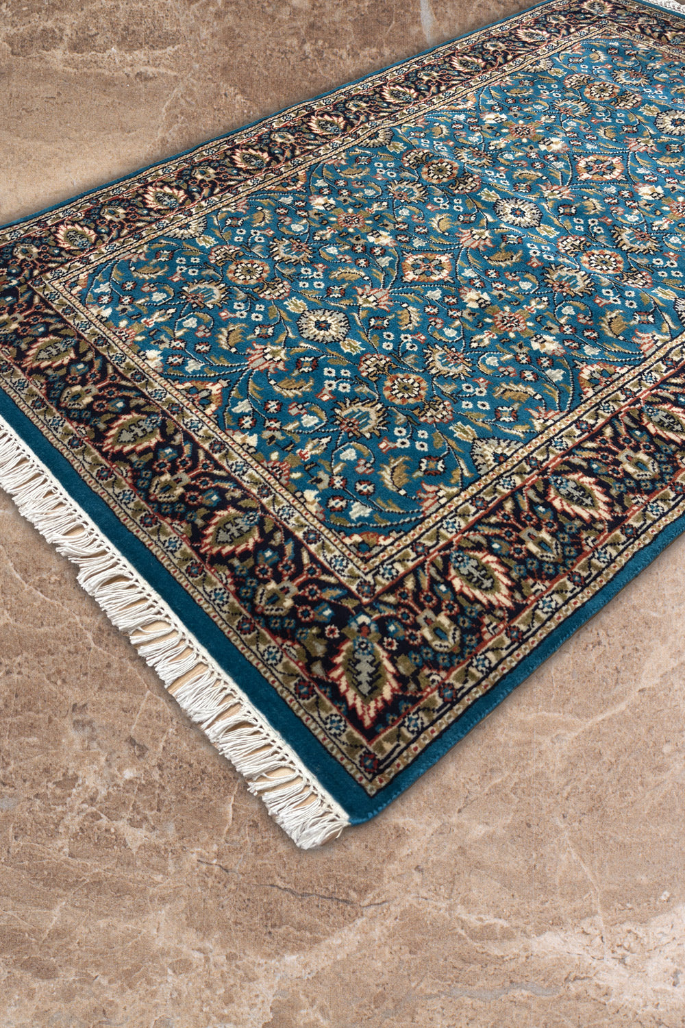 The Samudra rug is inspired by the vastness of the ocean, where teal waters shimmer under shifting light. Its detailed floral and geometric motifs seem to ripple like waves, creating a surface that feels endlessly alive. Crafted by hand in fine wool, it carries both strength and softness, perfect for grounding a space.