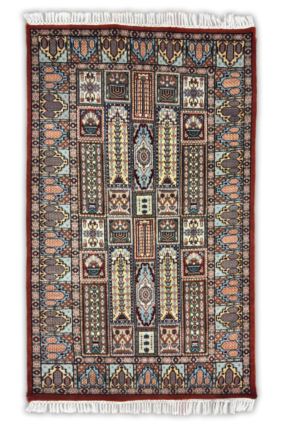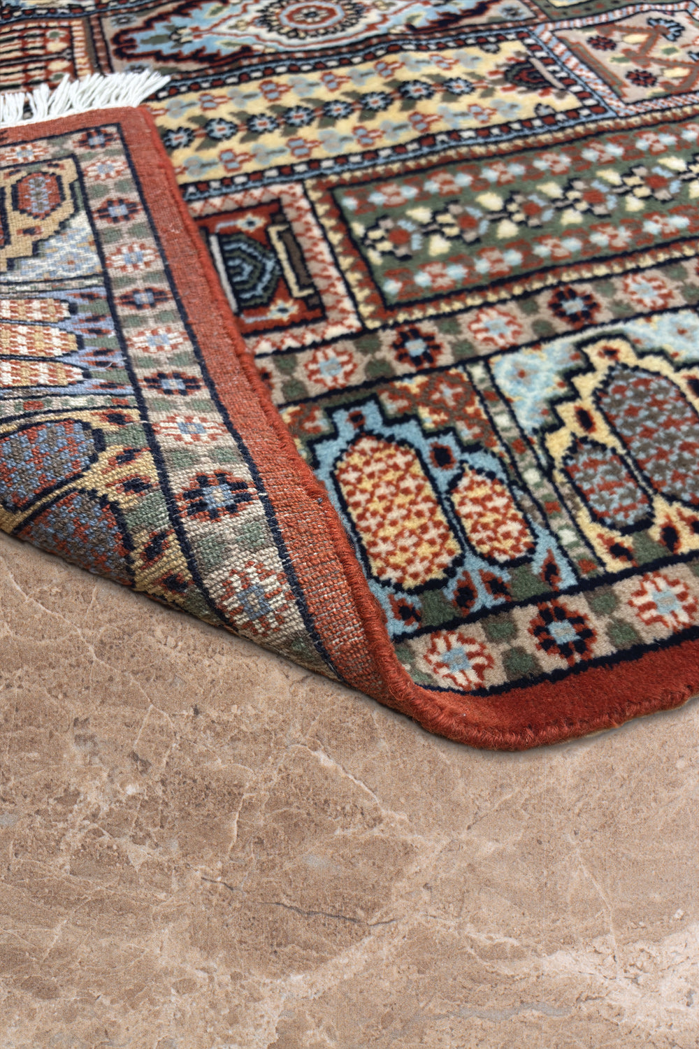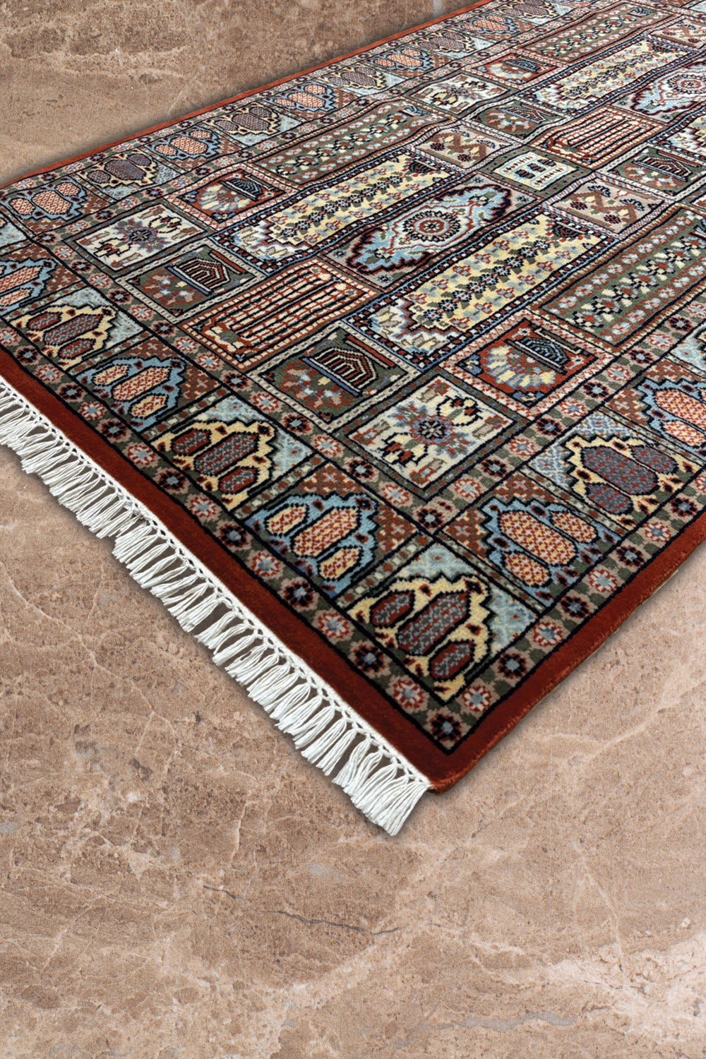 The Shatranj rug draws inspiration from the intricate geometry of chessboard mosaics and palace tiles. Each panel is hand-knotted with meticulous precision, creating a tapestry of repeating motifs that feel both structured and alive. The rust red gives warmth, while pale blue offers a cool contrast, balancing energy and calm.