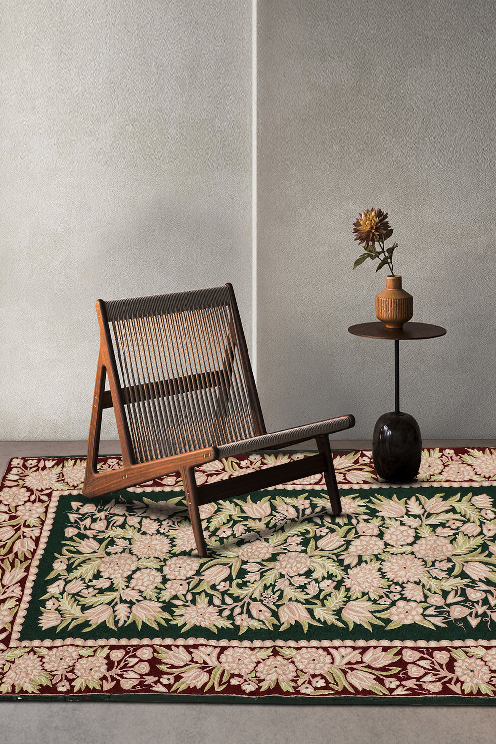 Add a sophisticated touch to your space with the Shayra rug, a stunning piece from our Odyssey Collection that blends modern design with natural elegance. This 3 x 5 ft wool rug, crafted with chain stitch embroidery and a low pile with a mild soft texture, features intricate floral patterns in deep forest emerald, rich maroon blush, and hints of warm taupe. Its design draws from Persian and Central Asian traditions, where floral motifs symbolized life and abundance since ancient times, often embroidered into textiles to depict thriving gardens. These patterns, embodying cultural narratives of growth and prosperity, spread through trade routes, influencing modern aesthetics with their refined beauty. The lightweight texture makes it perfect for living rooms or bedrooms seeking a subtle yet striking accent.