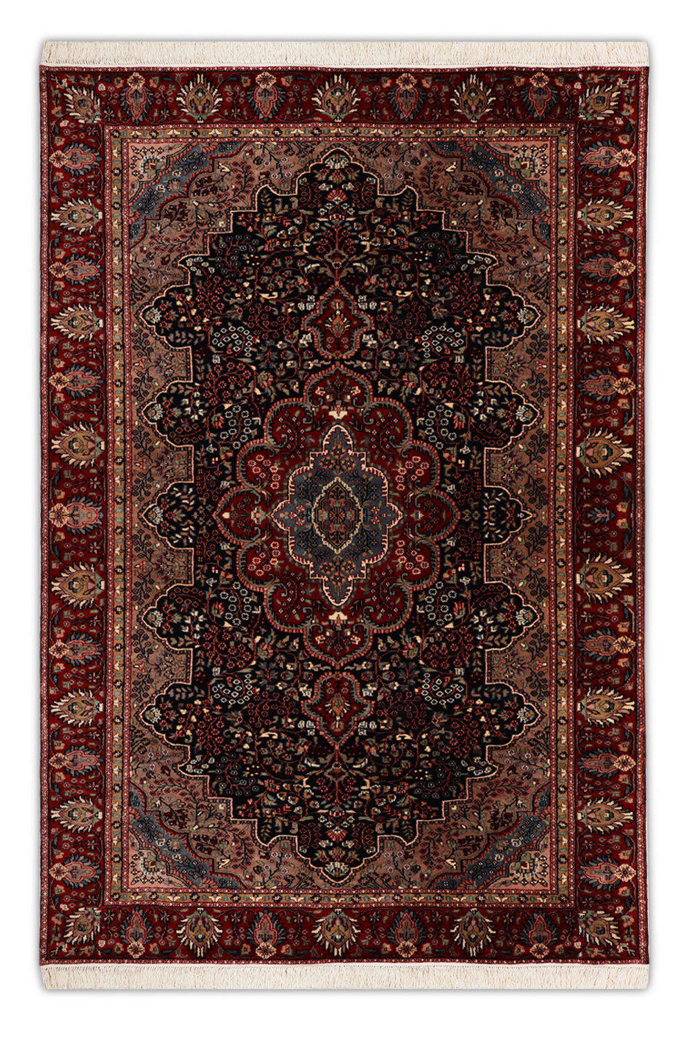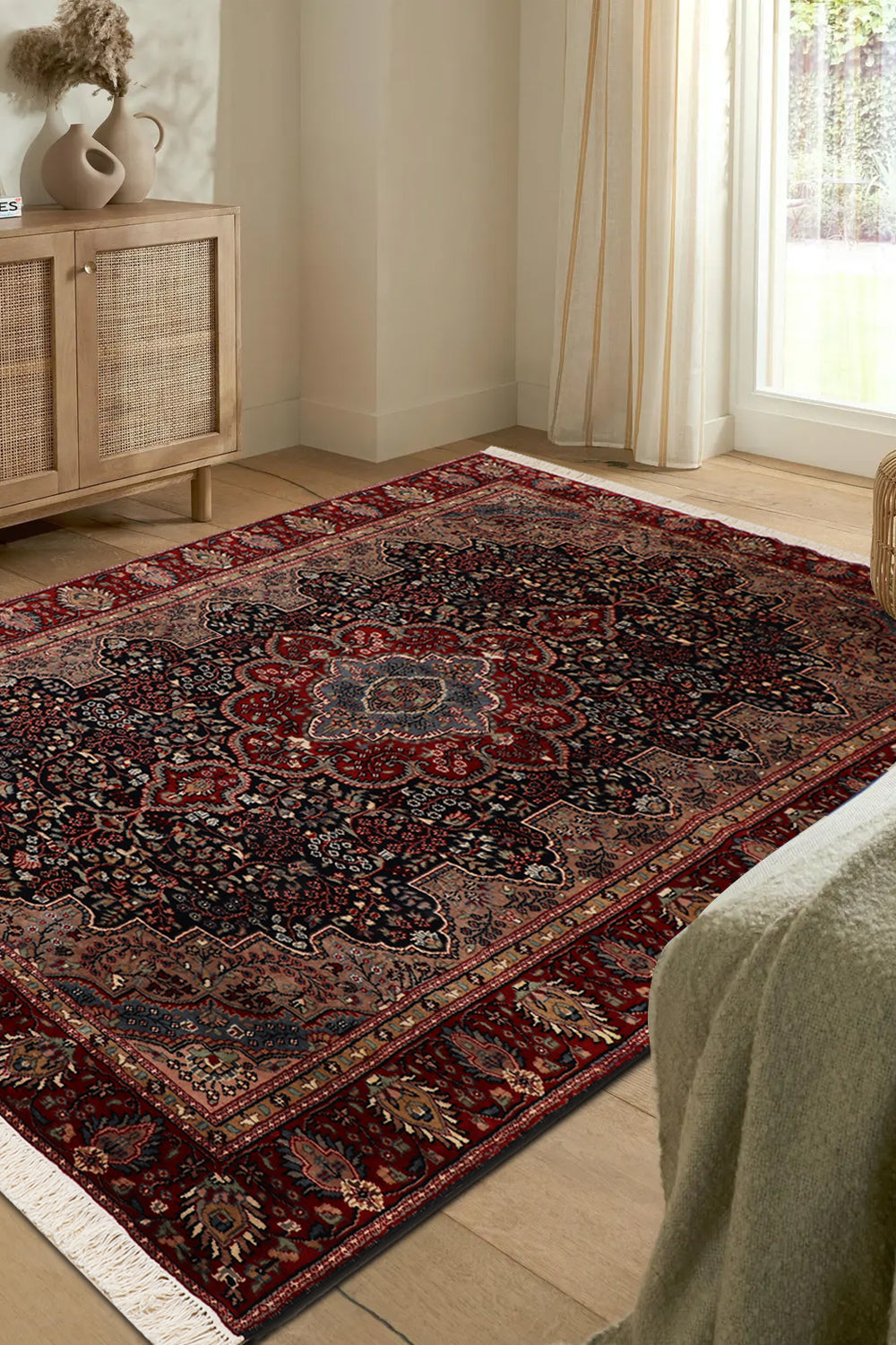 Elevate your home with this rectangular rug, where every knot weaves a story of historical depth and contemporary style. The Oriental floral and medallion design, rooted in Persian heritage, complements both classic and modern interiors with its detailed craftsmanship. Ideal for today’s homes, it merges durability with a luxurious feel, creating a bold yet cozy focal point. Its rich tones transform any room, infusing it with a sense of cultural richness and understated refinement. Discover a rug that bridges centuries-old traditions with modern living spaces.