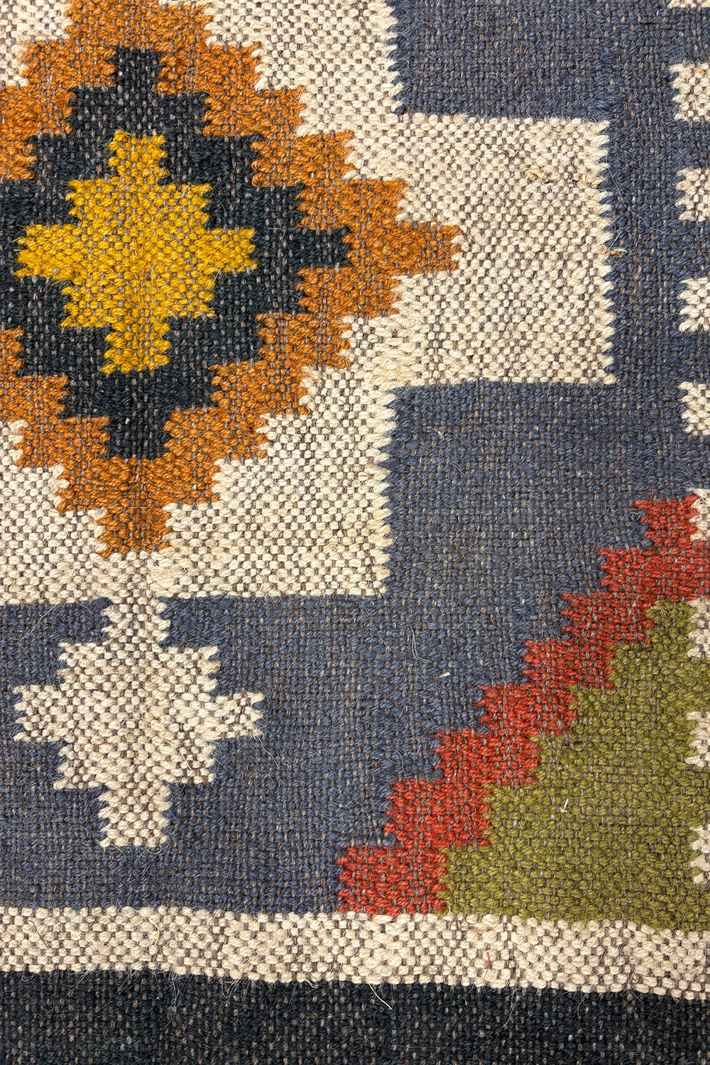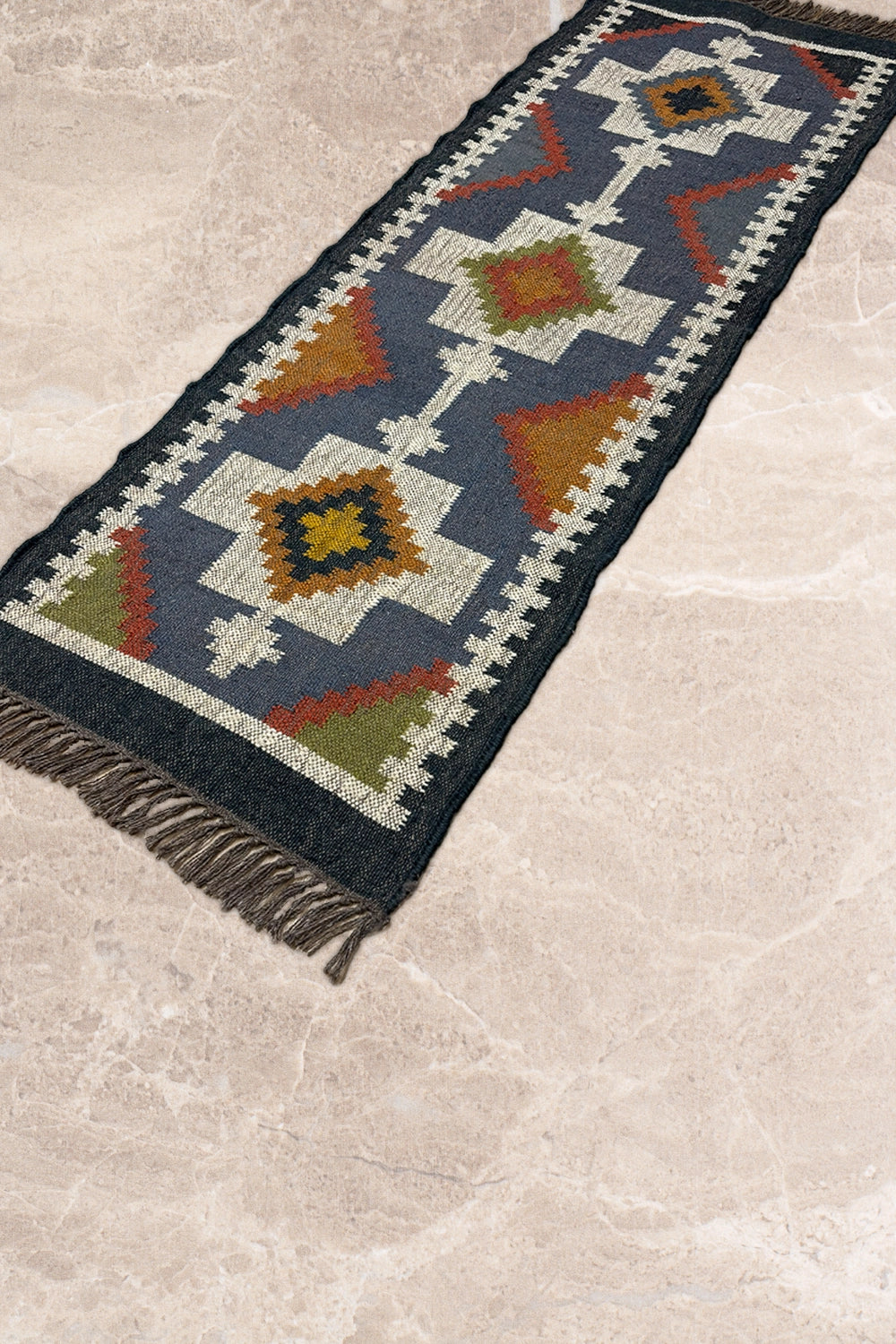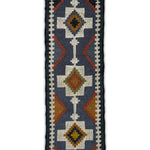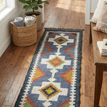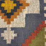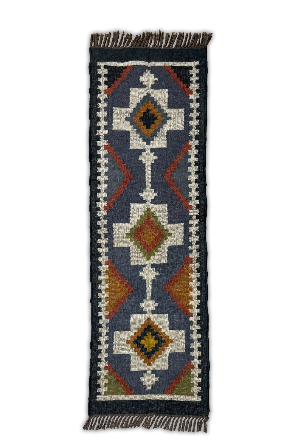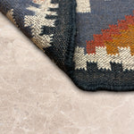 Slate Passage is a modern kilim runner defined by strong geometry and quiet rhythm. Set on a slate-blue base, bold ivory forms run along the length of the rug, punctuated by diamond motifs in warm ochre, rust, and olive that create a sense of movement and direction.