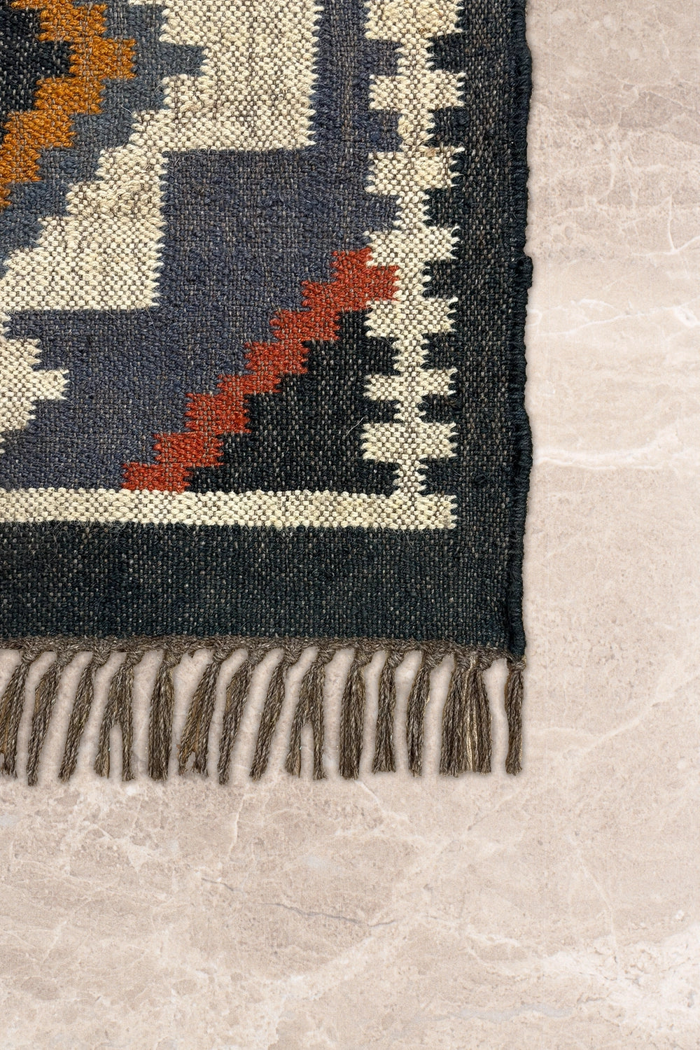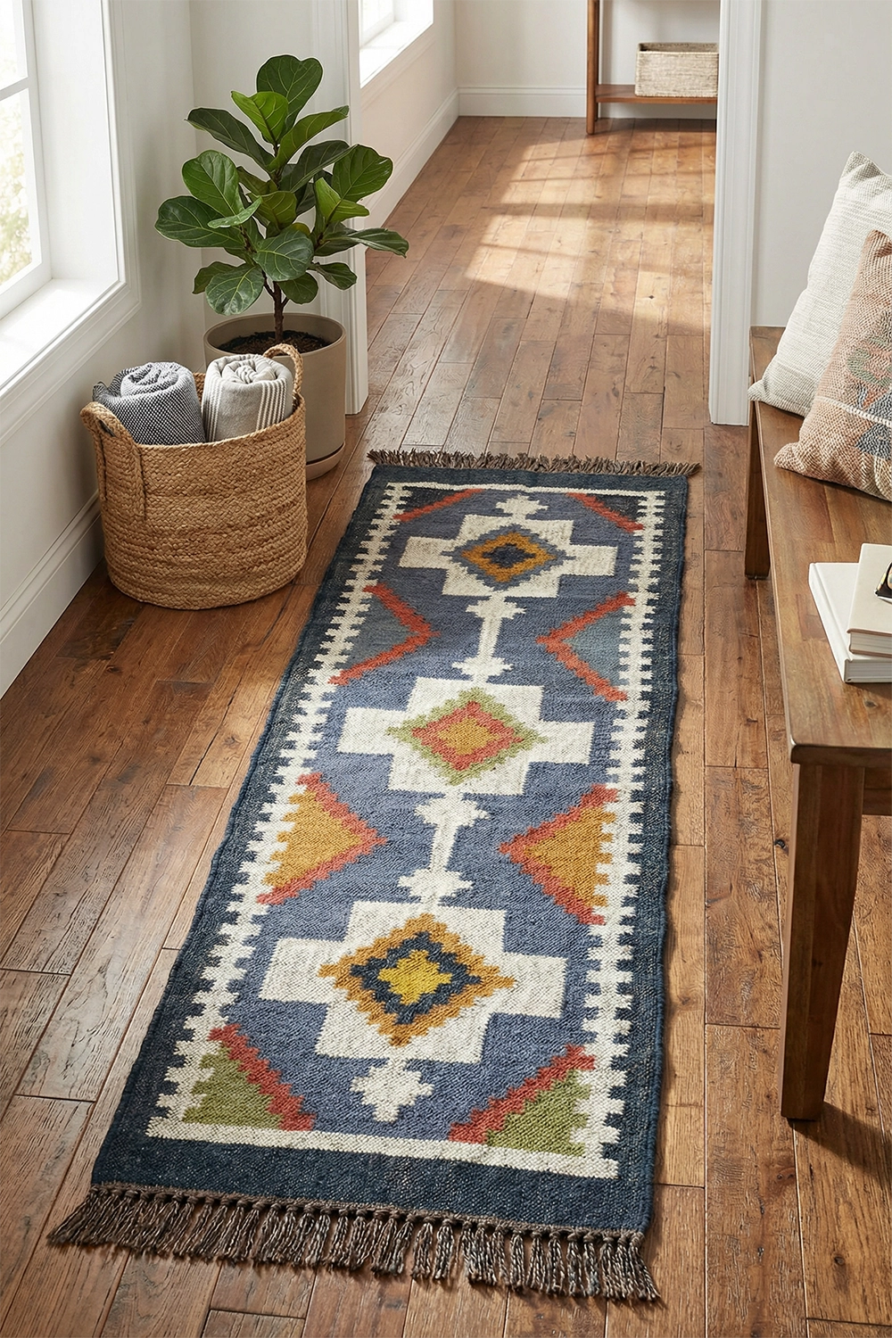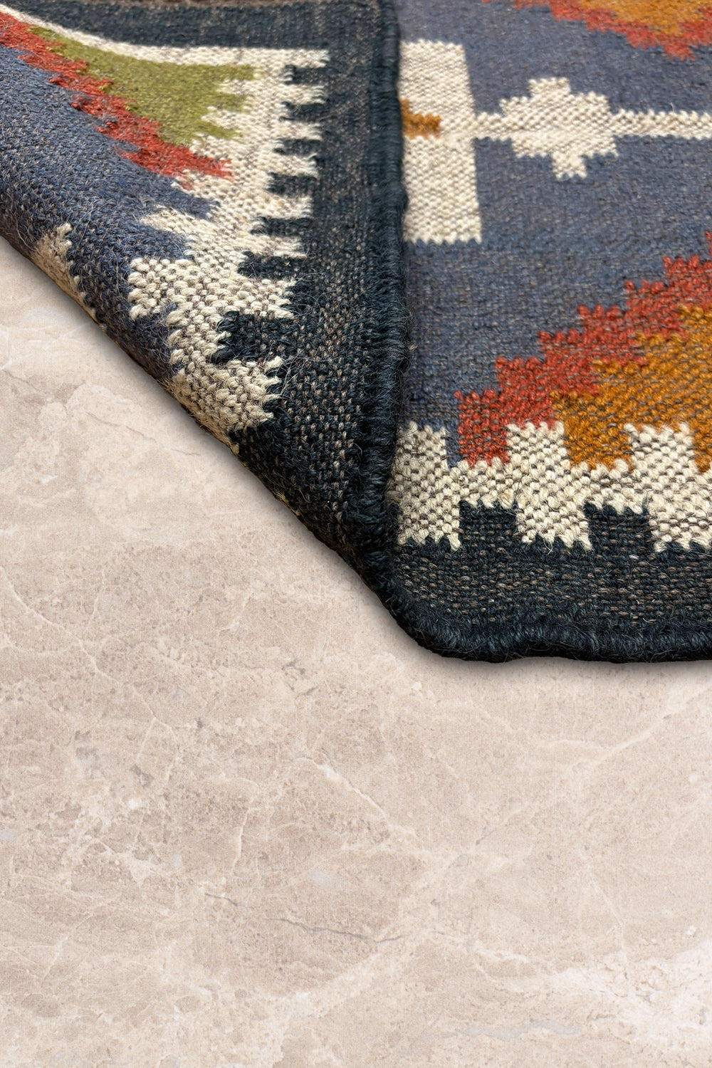 Slate Passage is a modern kilim runner defined by strong geometry and quiet rhythm. Set on a slate-blue base, bold ivory forms run along the length of the rug, punctuated by diamond motifs in warm ochre, rust, and olive that create a sense of movement and direction.