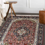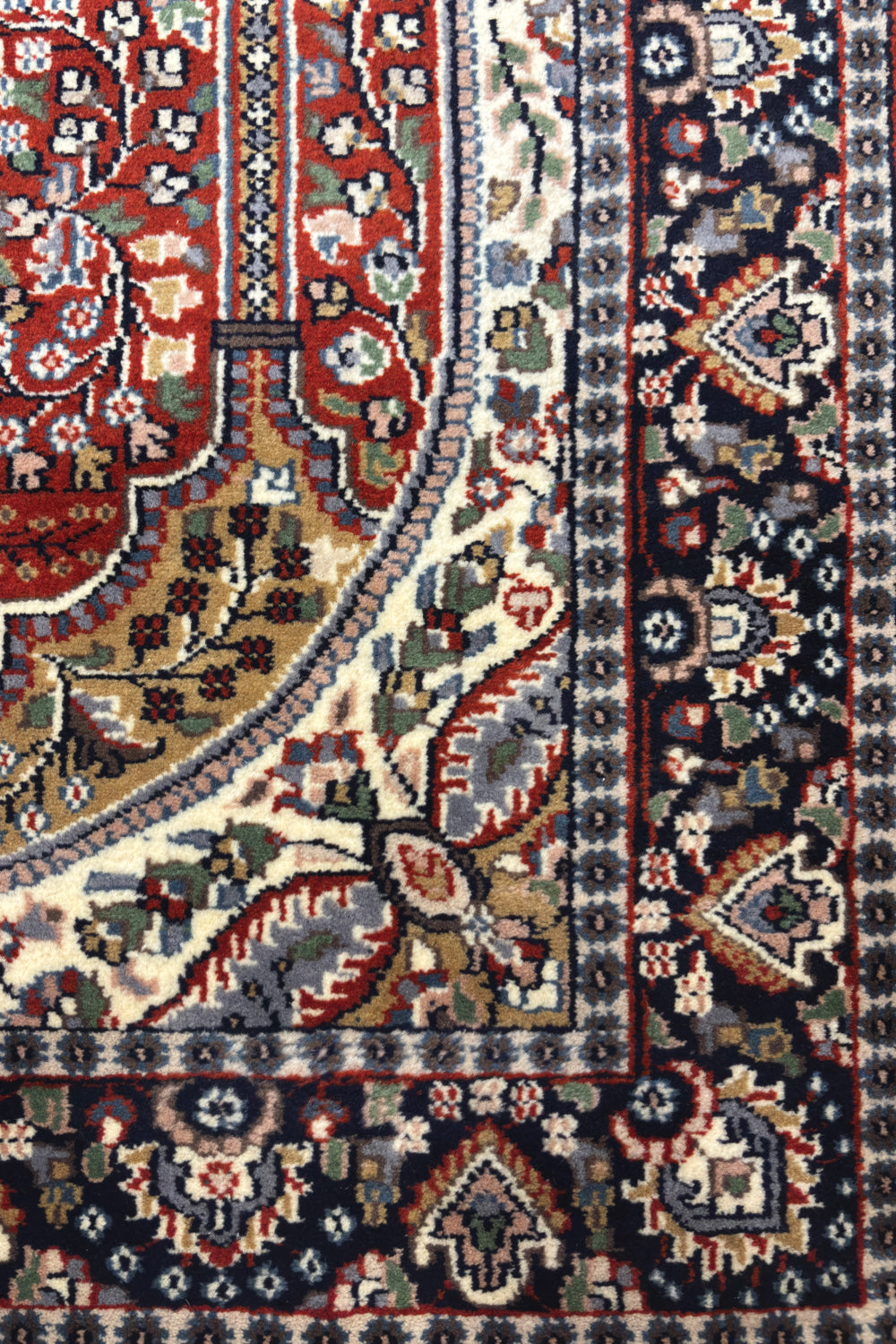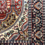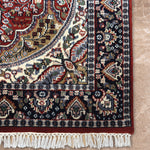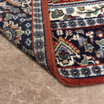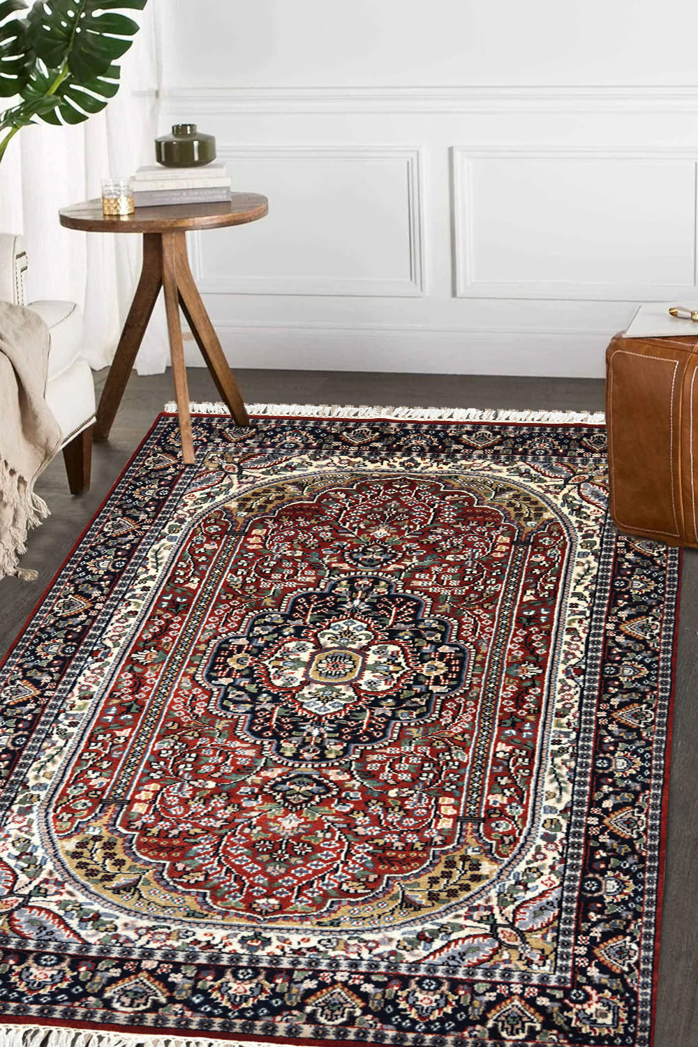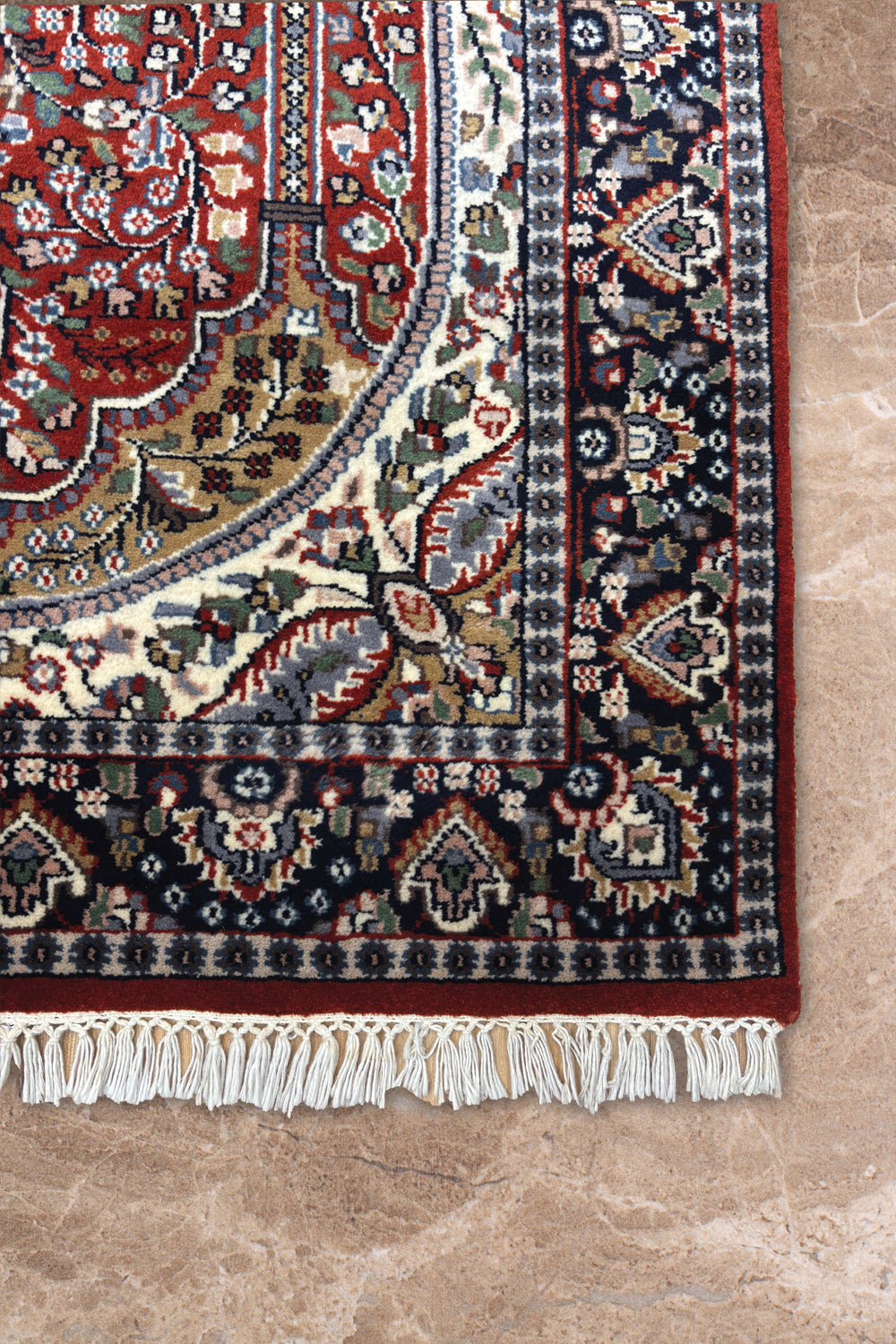 The Suhaila rug captures the beauty of contrast in its bold palette. Crimson red fills the field with vibrancy, while midnight blue frames the medallion and borders in stately elegance. Hand knotted in wool, the rug’s floral and vine motifs showcase centuries of weaving tradition, transforming every thread into artistry.