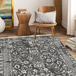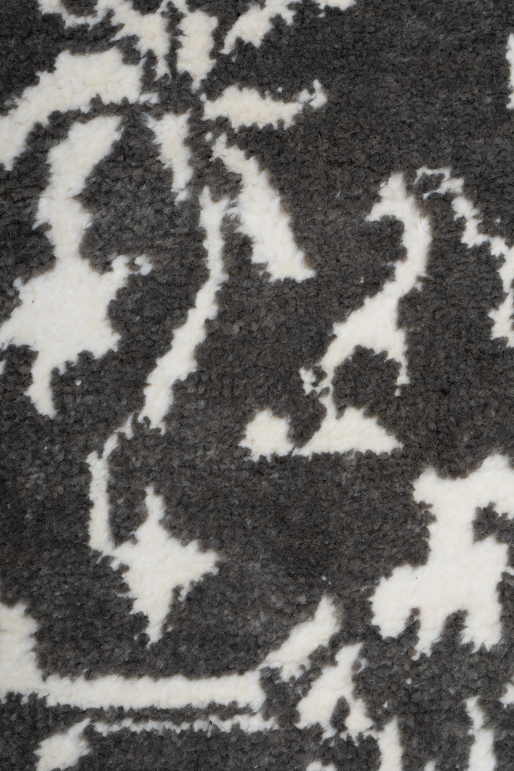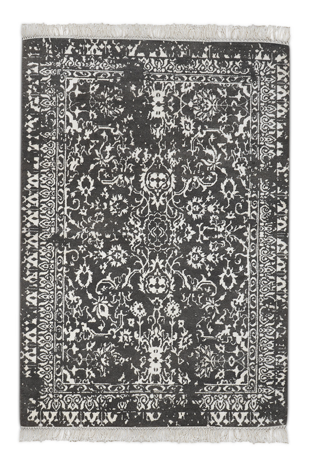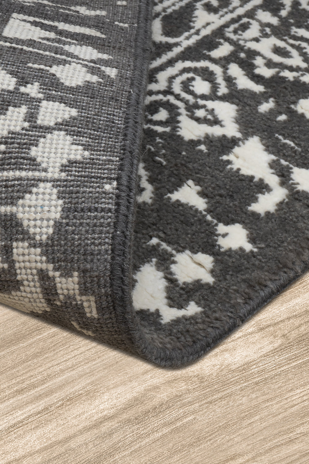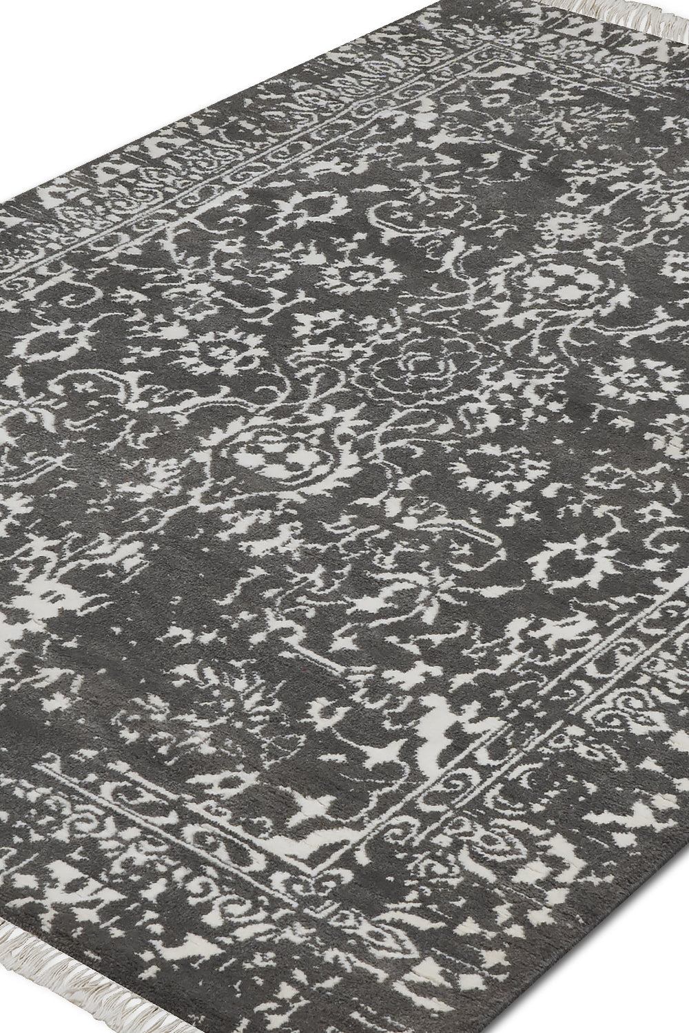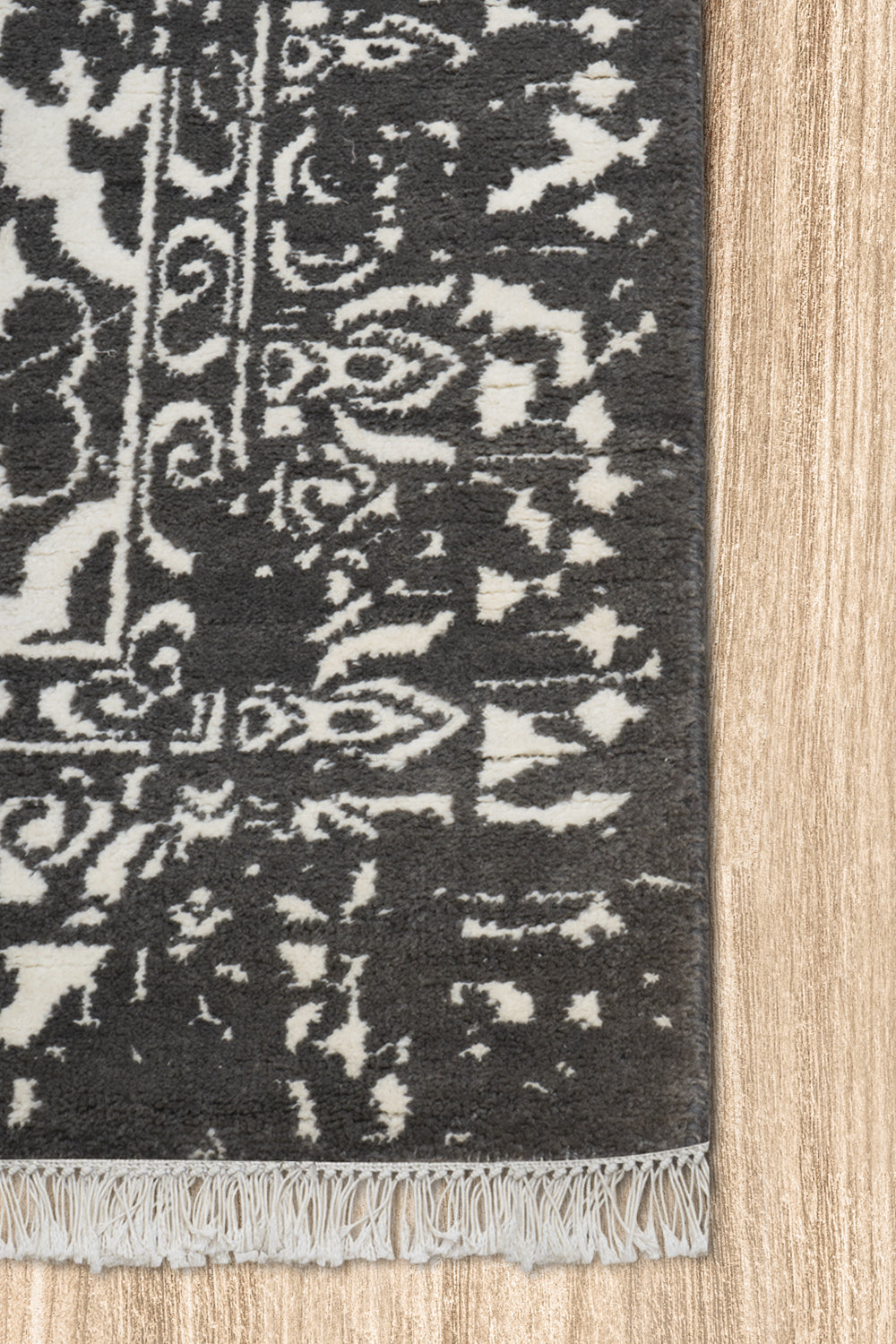 Blooming with contemporary charm, the Odyssey floral rug captivates with its slate grey and white palette. Its hand-knotted wool craftsmanship and medium pile create a delicate balance of beauty and durability. The Floral Distressed Vintage design in black is a striking fusion of timeless elegance and bold sophistication. Featuring delicate floral motifs softened by intentional fading, this design evokes the charm of vintage heirlooms while maintaining a contemporary edge. The distressed textures lend an aged patina, beautifully contrasting with the deep black backdrop for a dramatic and refined look.